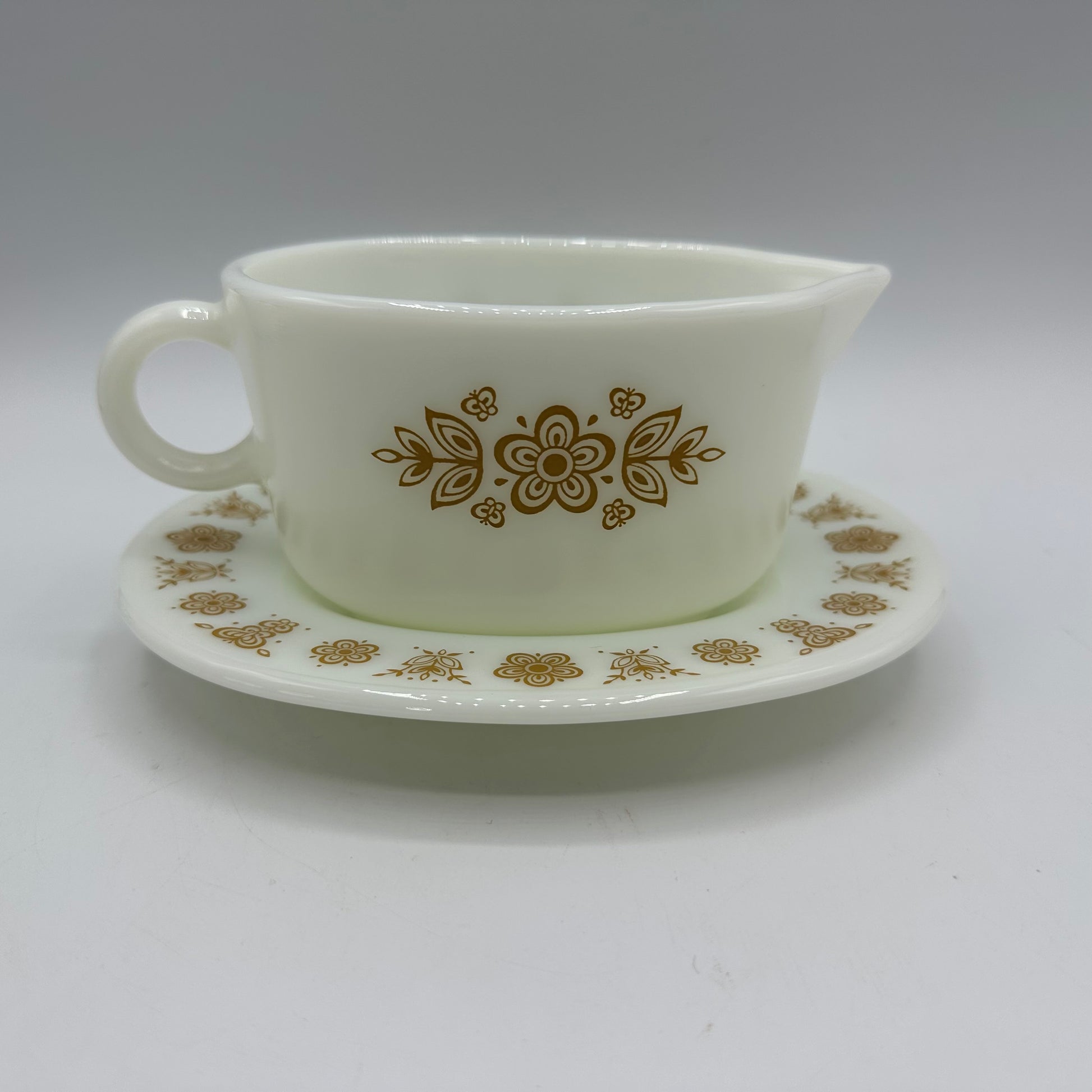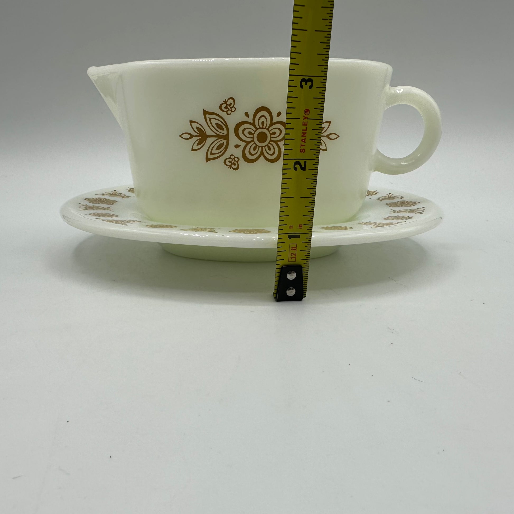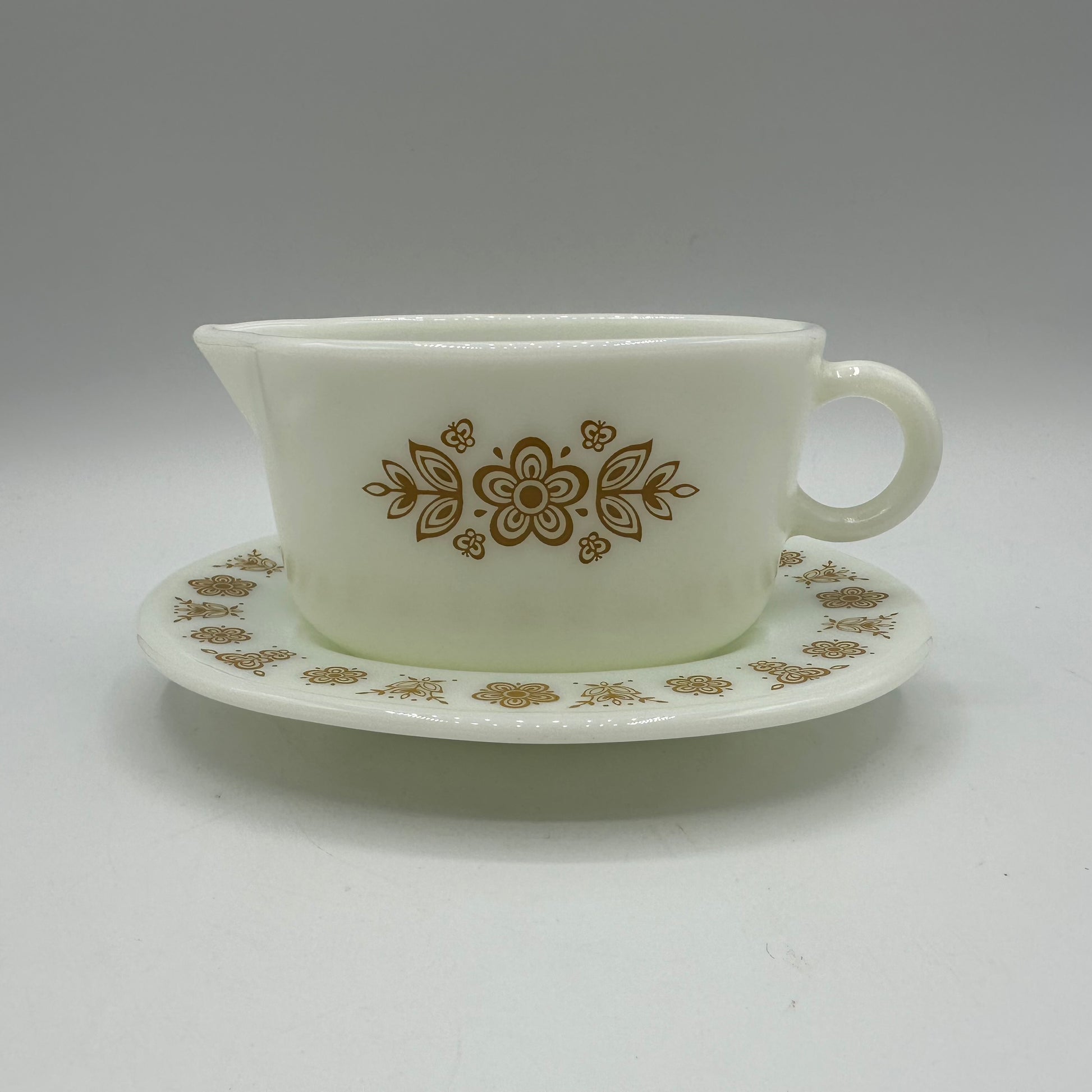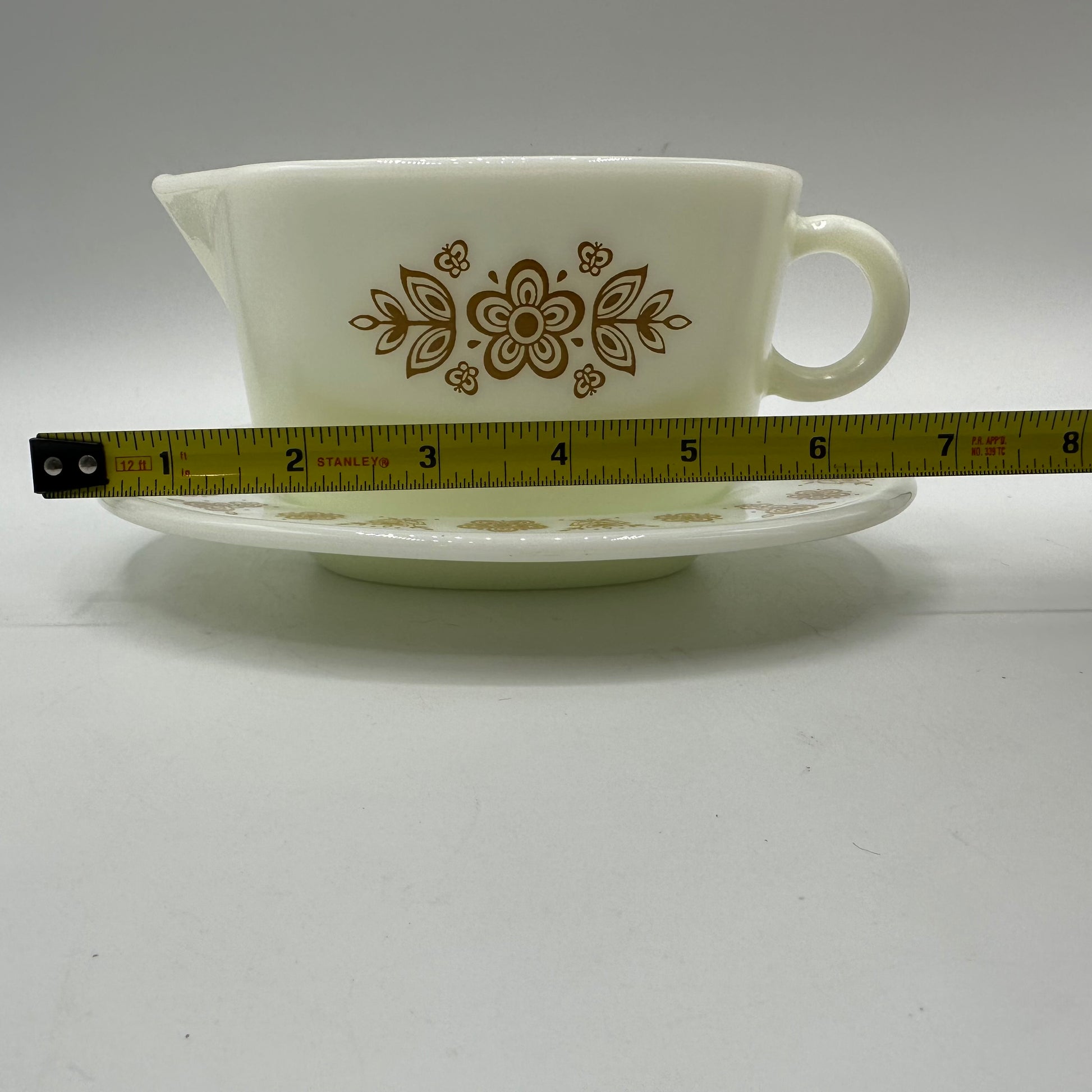 1970s Gold Butterfly Pyrex Milk Glass Gravy Boat & Platter