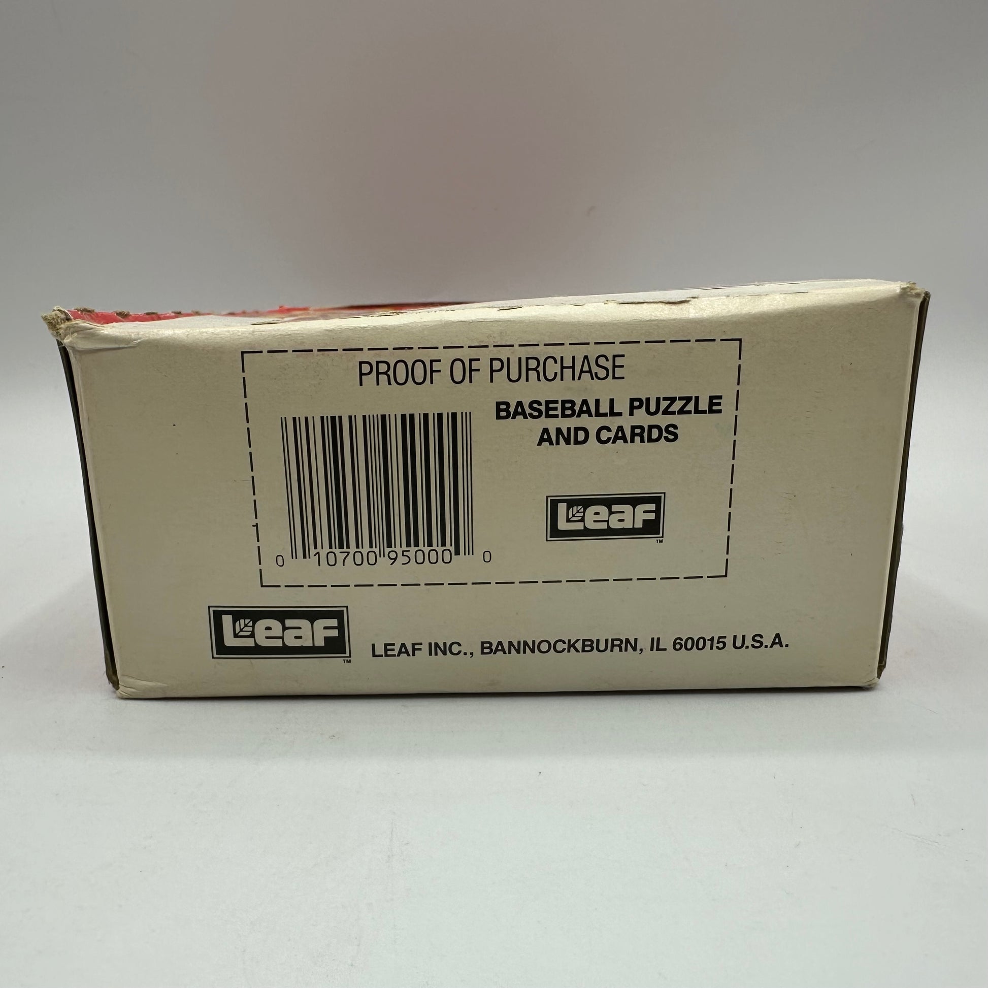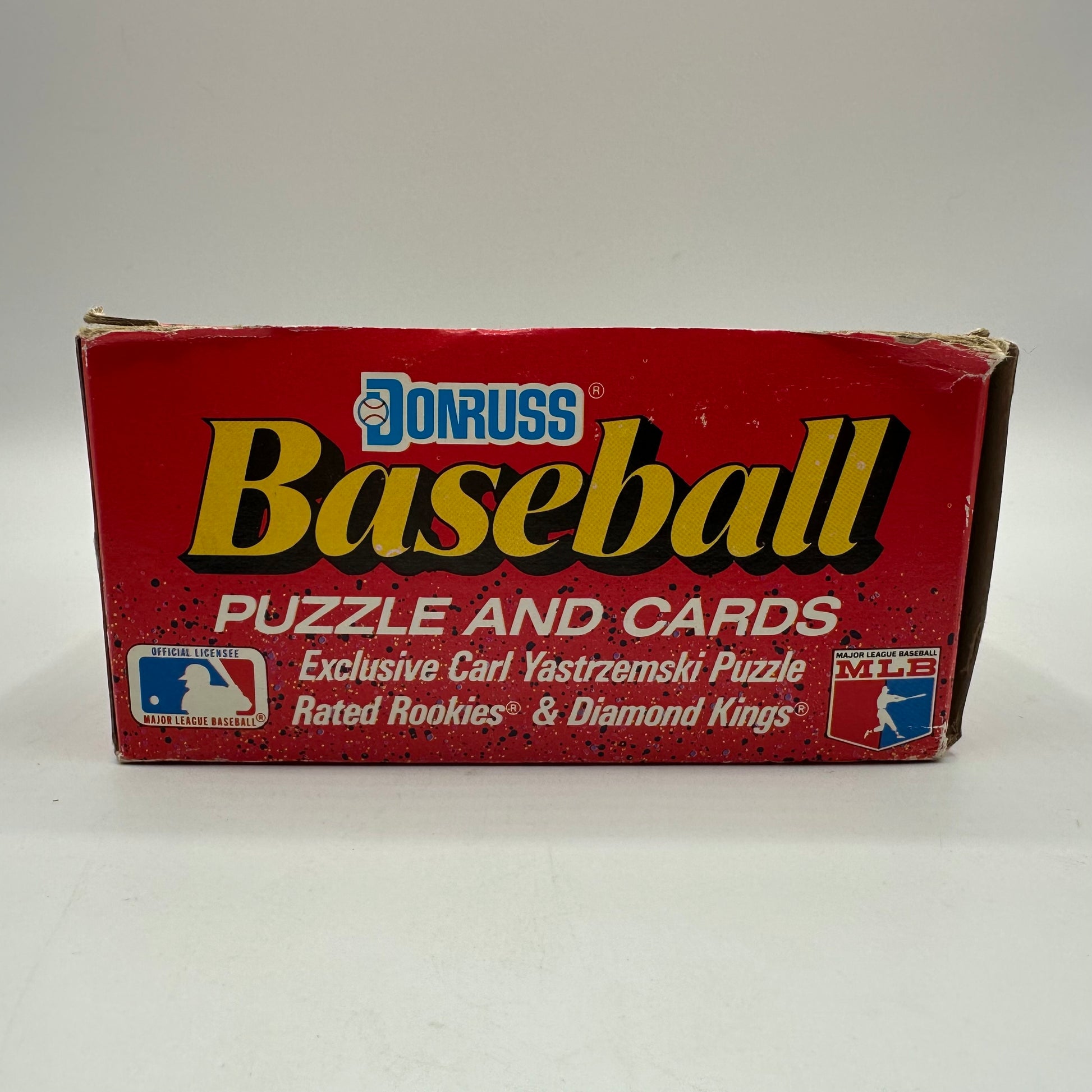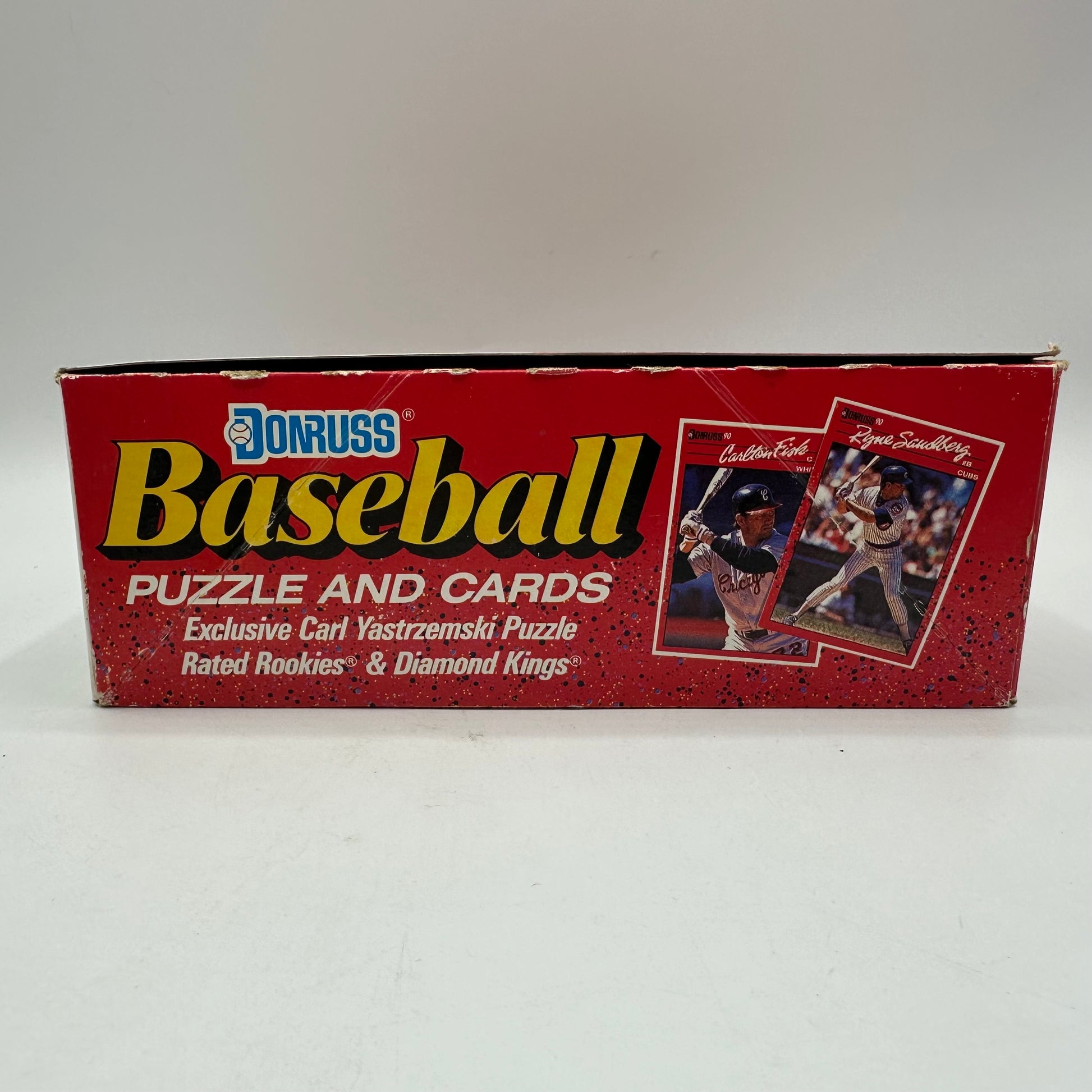 This listing includes 33 sealed puzzle and card packs of the 1990 Donruss Baseball trading cards in the original open box.