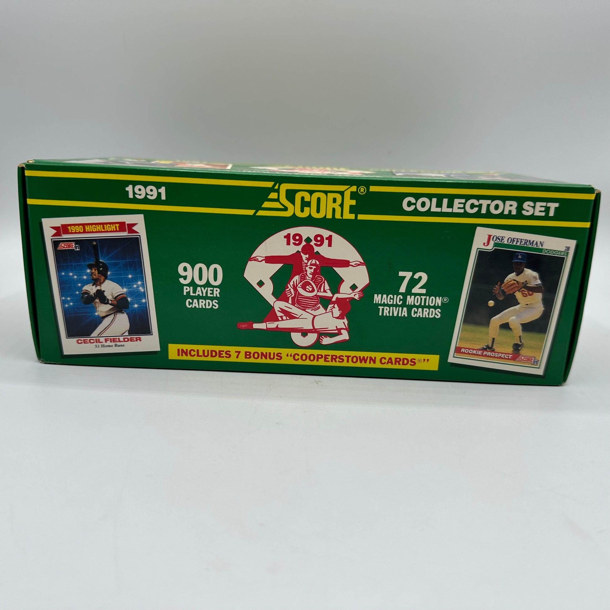 This listing includes a Collector Set of 900 player cards and 72 magic motion trivia cards of the 1991 Score Baseball trading cards in an open box.
