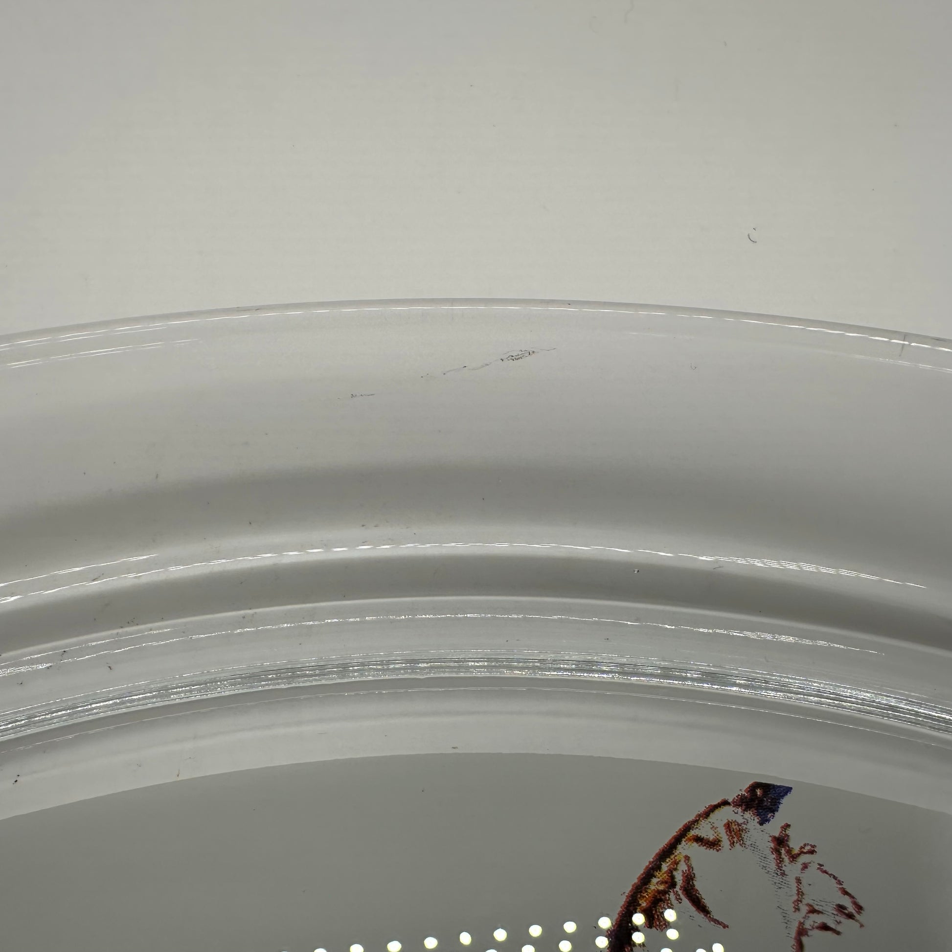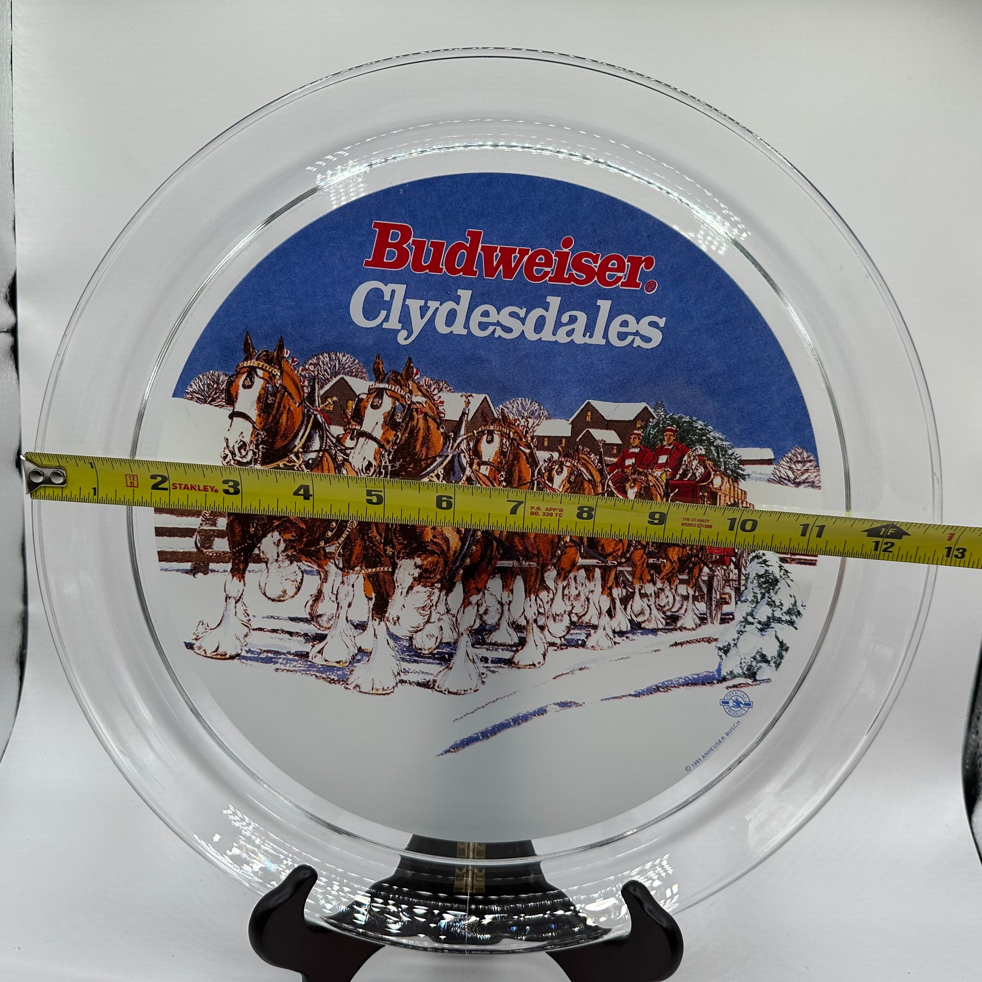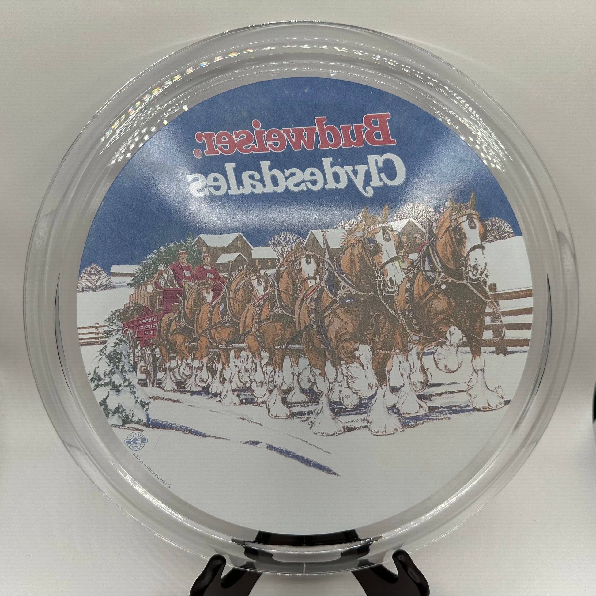 A stunning platter showcasing the Budweiser Clydesdales. It features vibrant colors on glass, making it an ideal addition to any home bar. The platter is in excellent vintage pre-owned condition but does have a scratch on one of the rims that is shown in the pictures.
