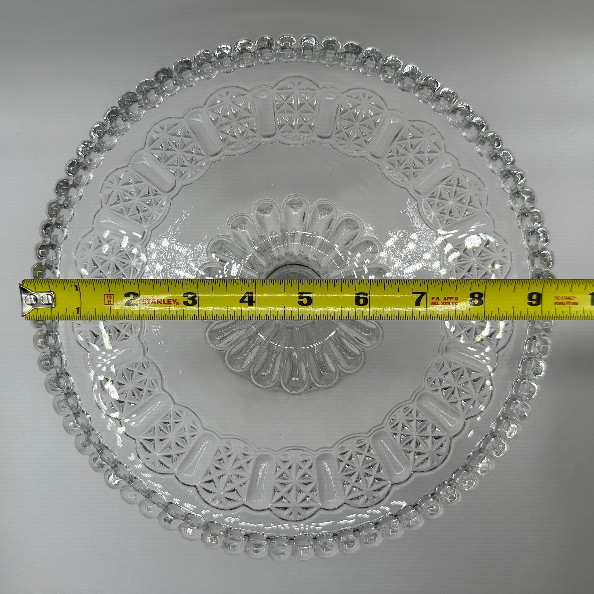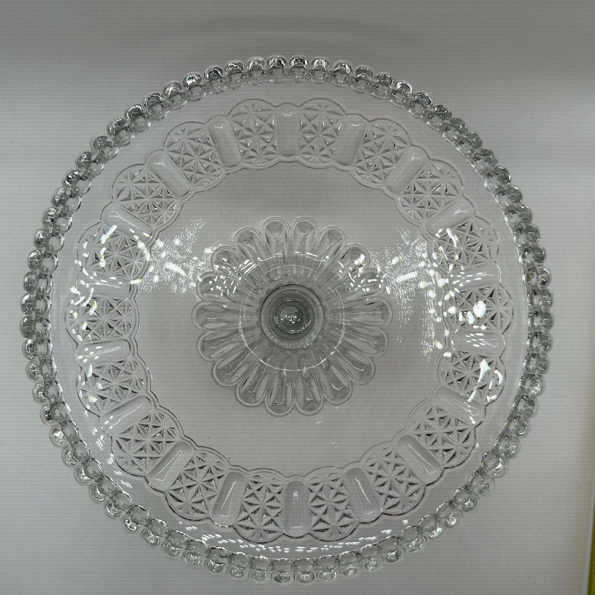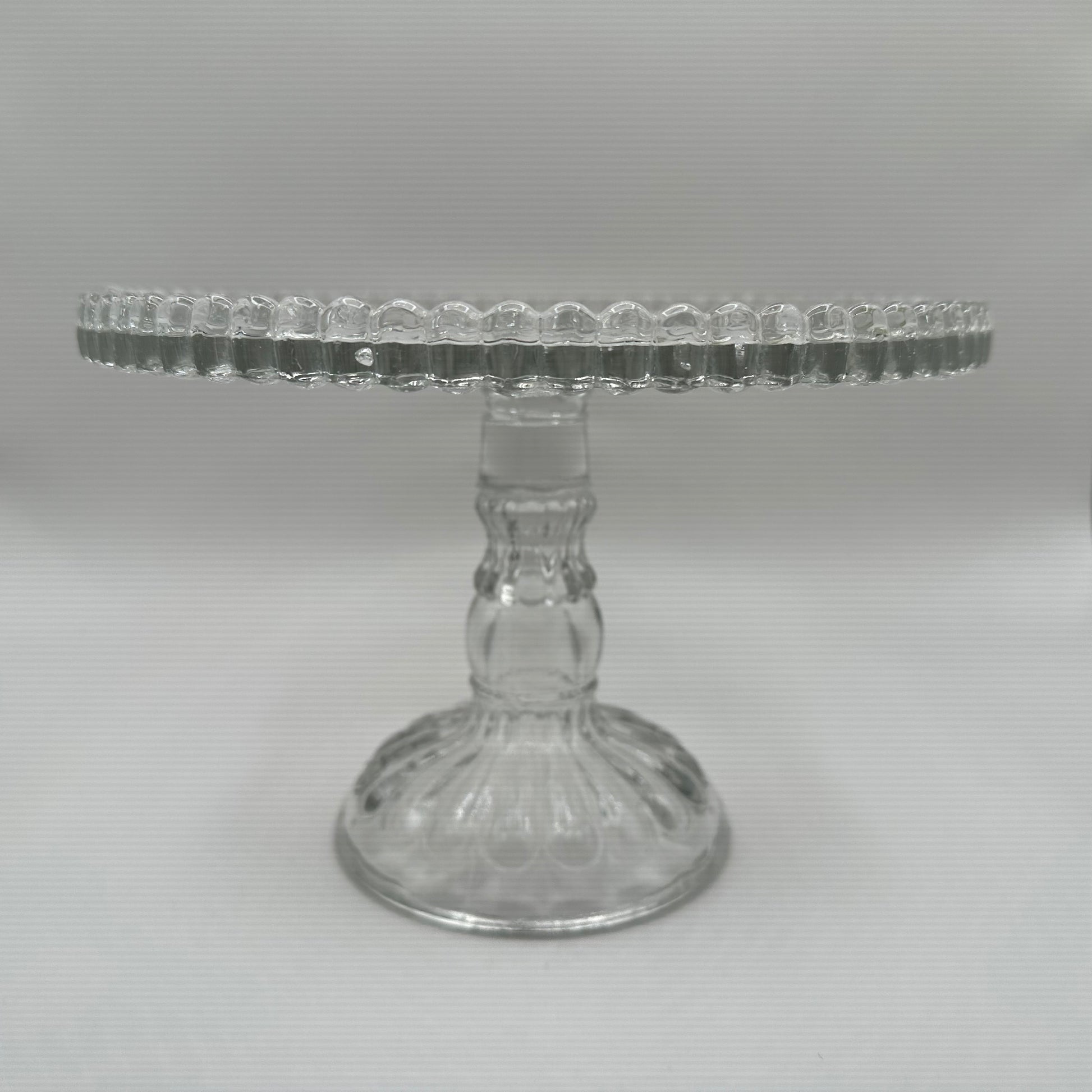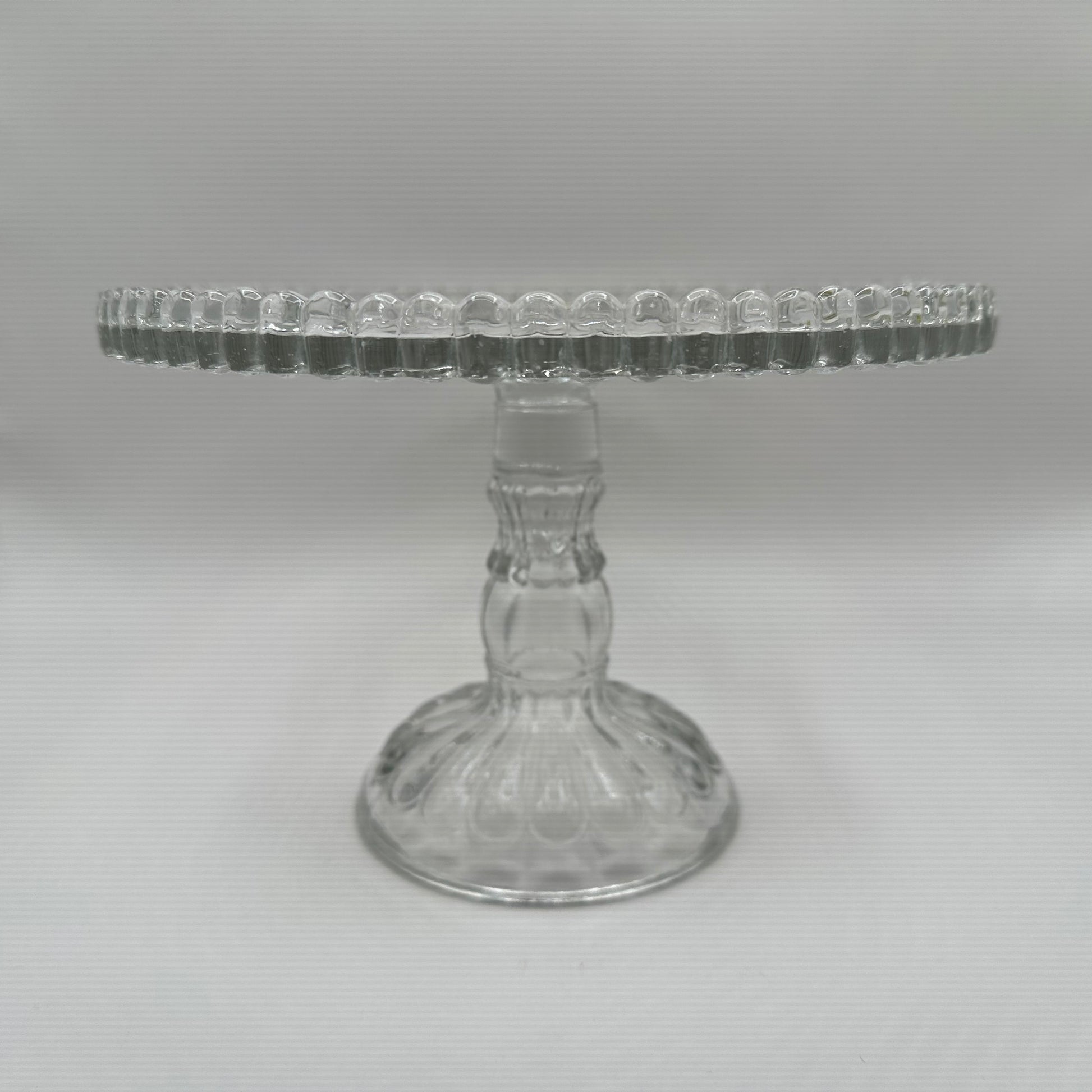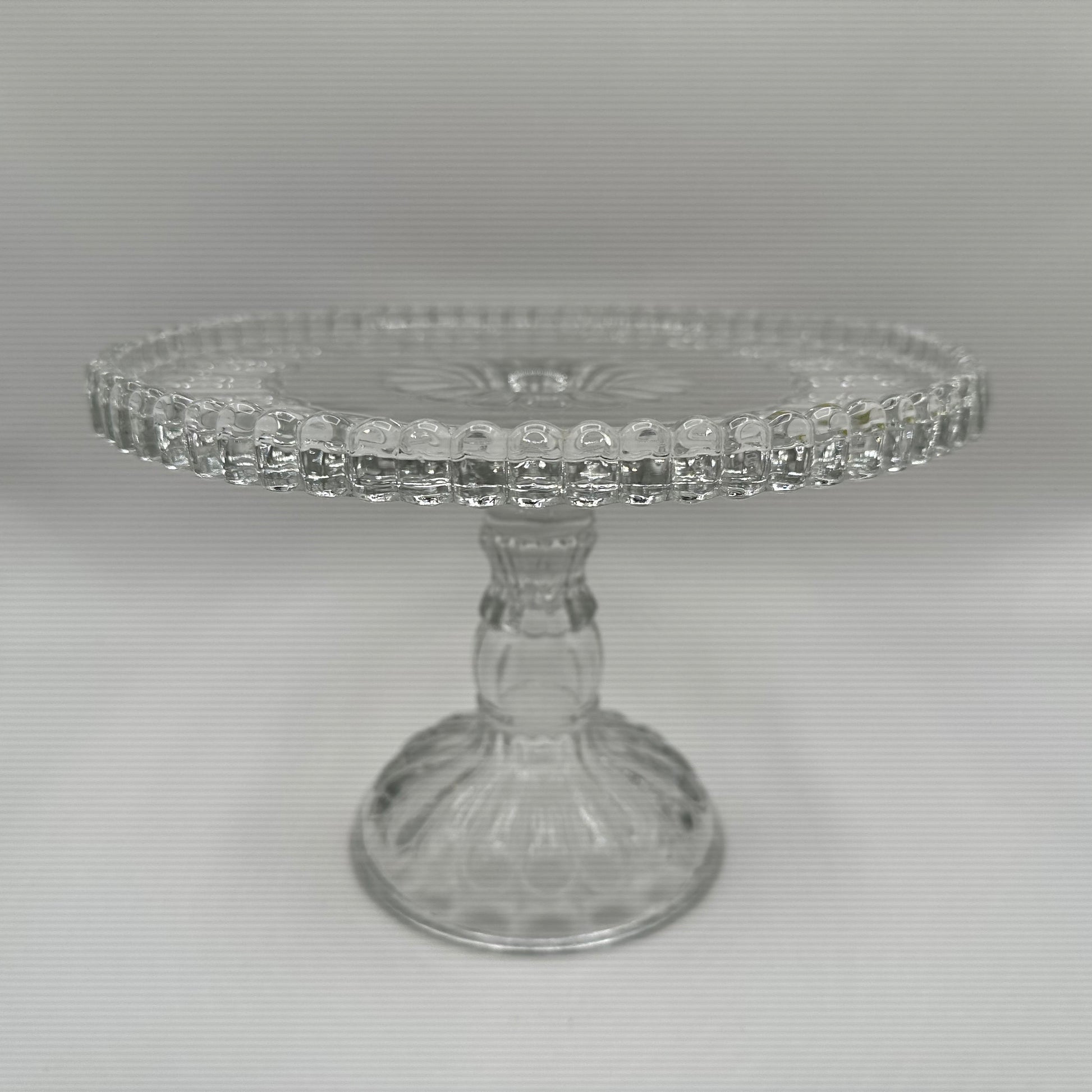 This exquisite cake stand from Adams features a captivating pressed design on the surface and a charming pedestal, all crafted from clear glass. It is noteworthy that the cake stand is in excellent vintage pre-owned condition, making it a wonderful addition to any collection or event.