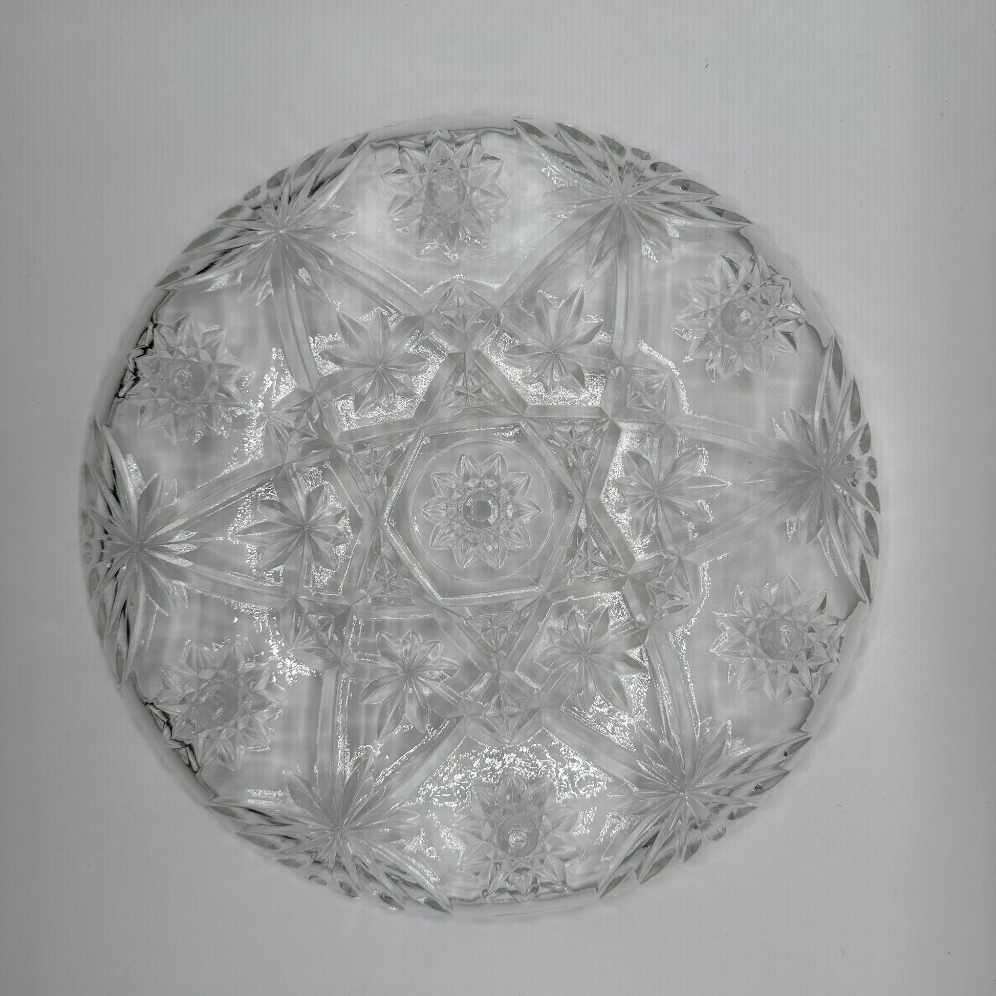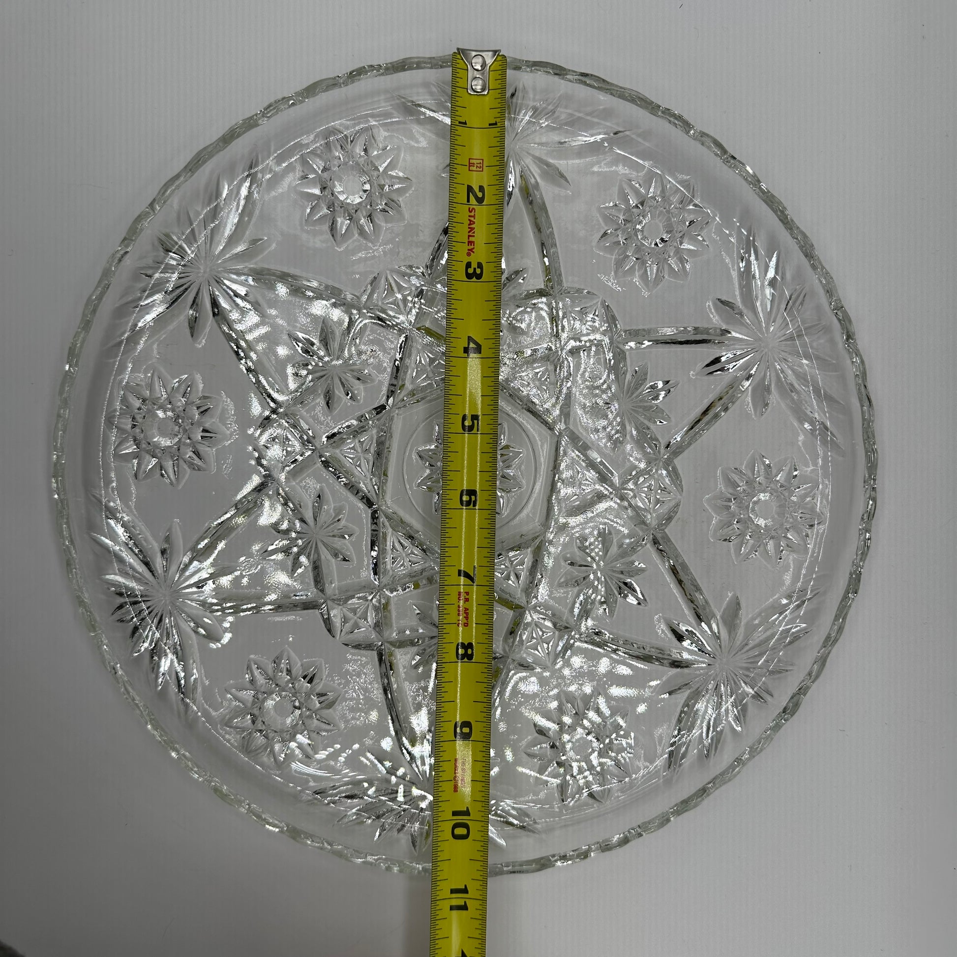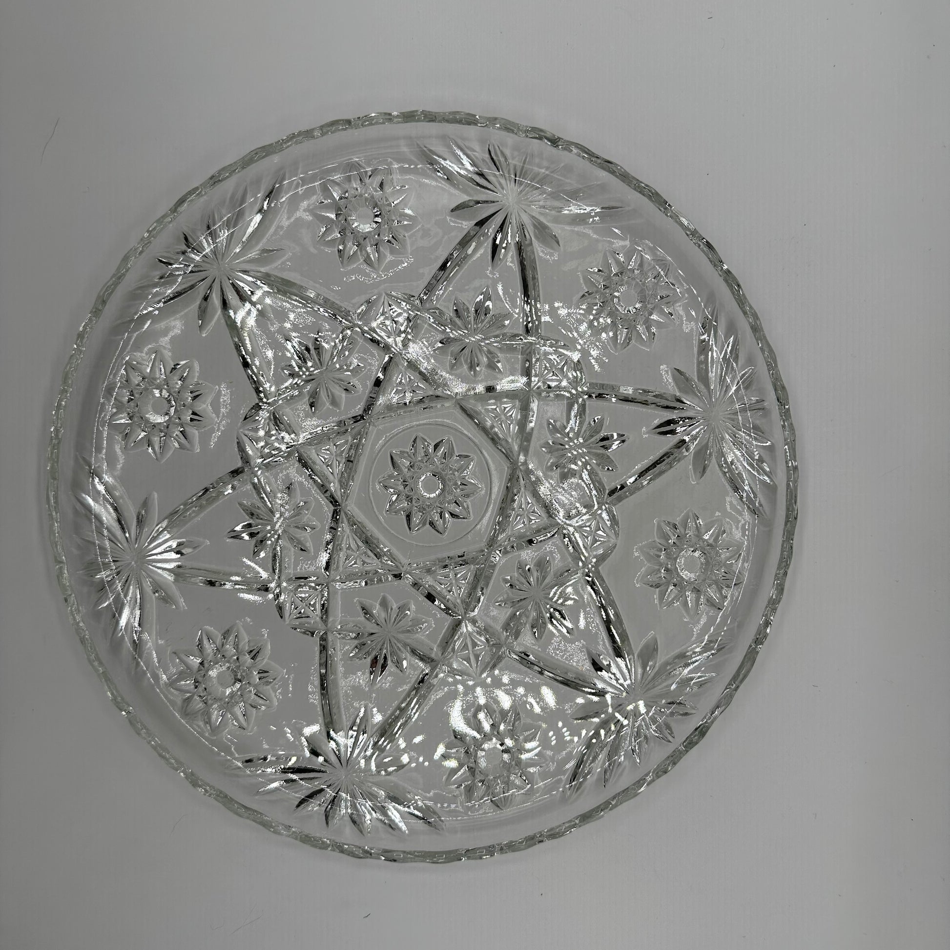 This is a beautiful sandwich plate from Anchor Hocking, featuring the Early American Prescut design, also known as the Star of David design. The plate measures 11 inches in diameter and is in excellent vintage pre-owned condition.