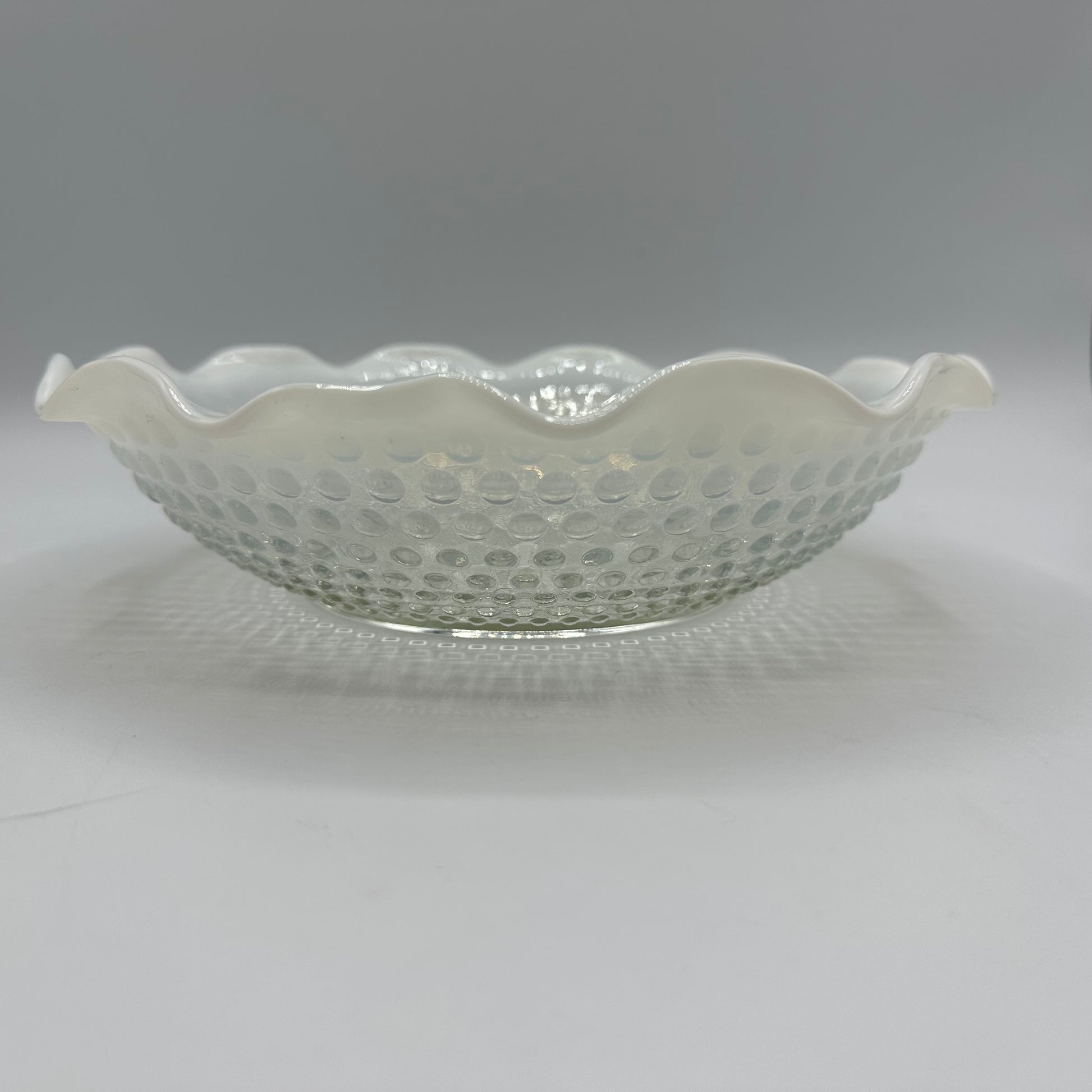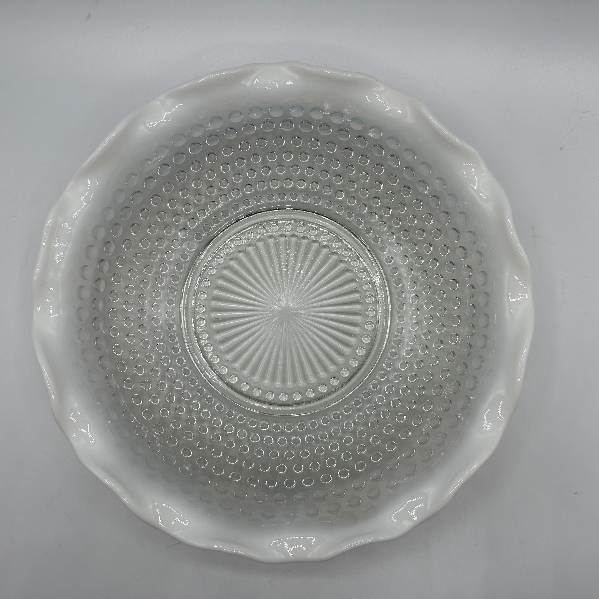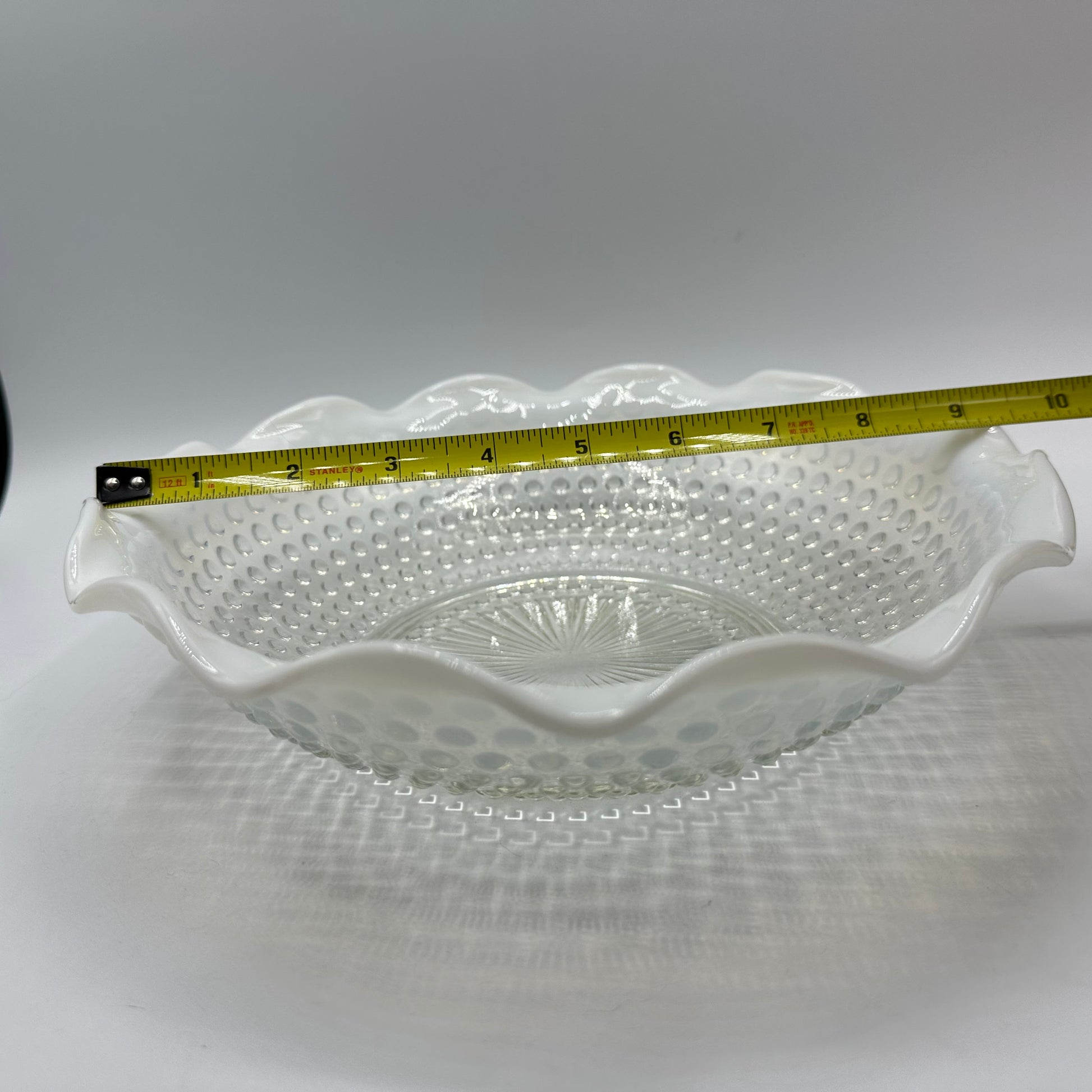 A pretty serving bowl from Anchor Hocking. It features the Moonstone pattern and is in excellent vintage condition. The serving bowl measures approximately 9' in diameter and 2 1/2" tall.