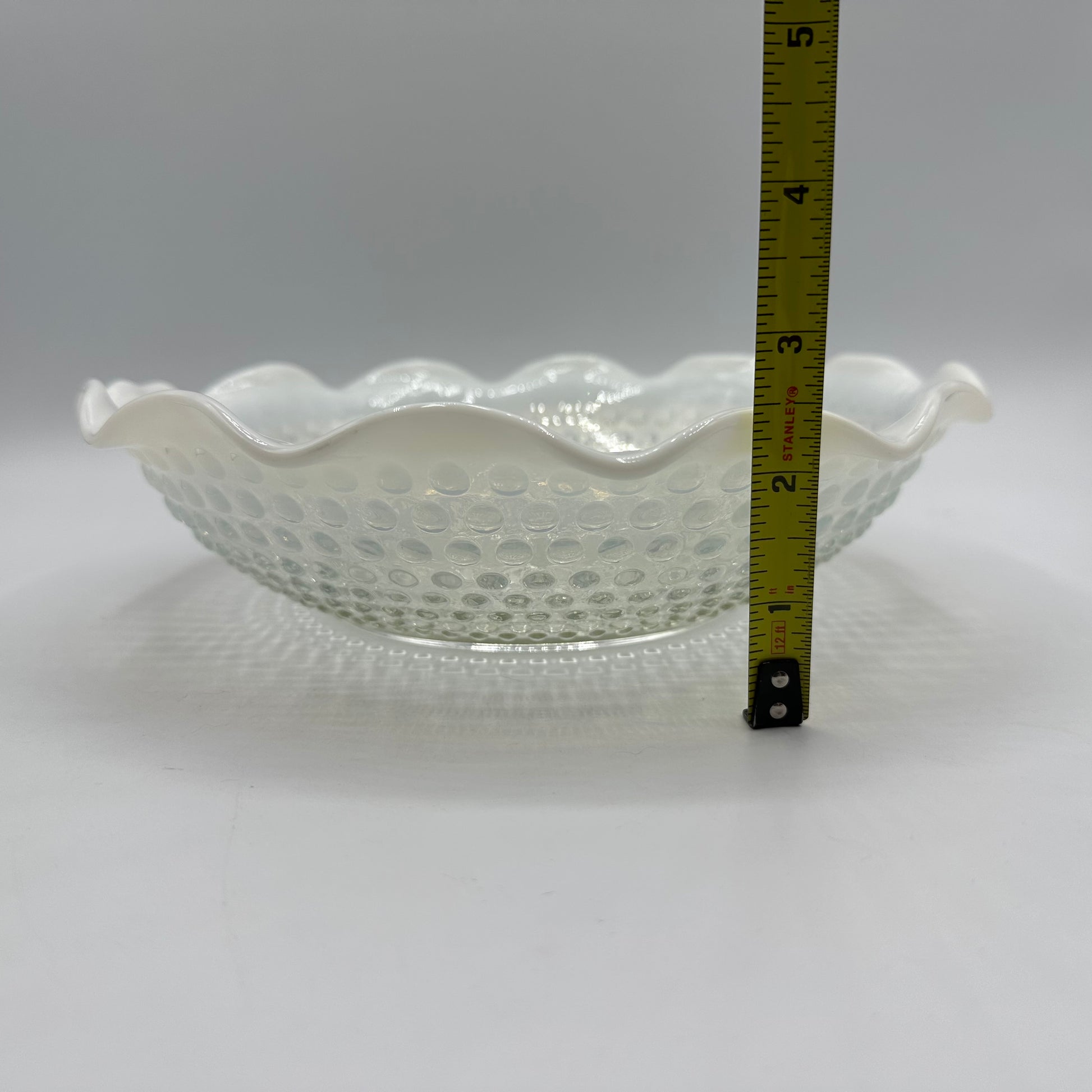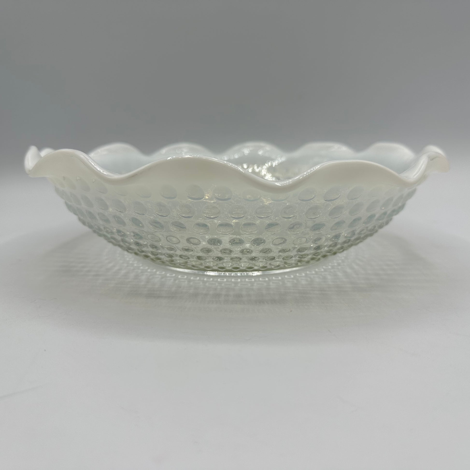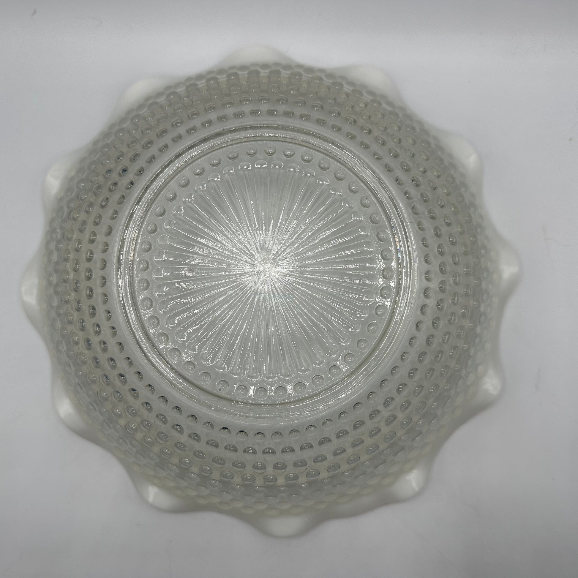 A pretty serving bowl from Anchor Hocking. It features the Moonstone pattern and is in excellent vintage condition. The serving bowl measures approximately 9' in diameter and 2 1/2" tall.