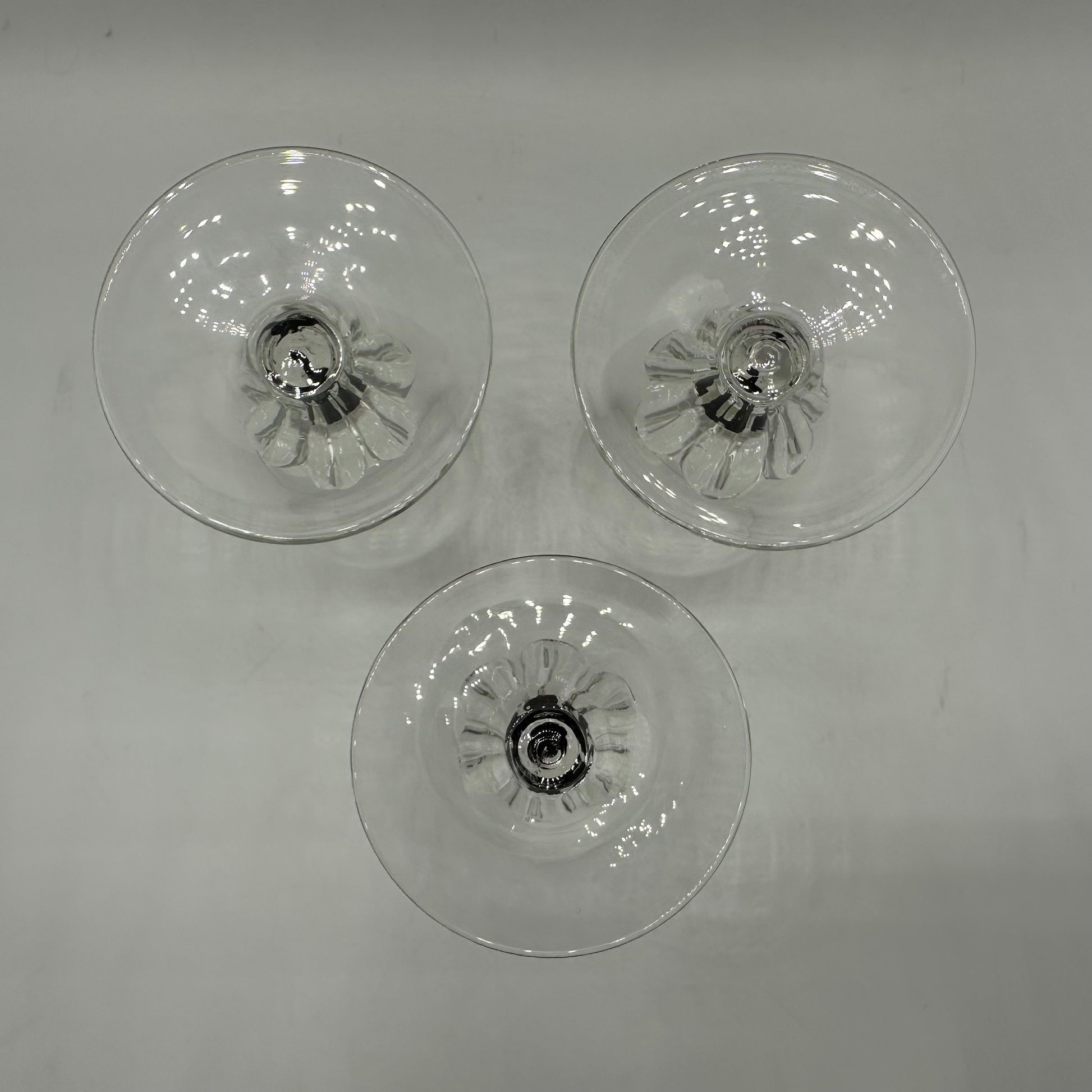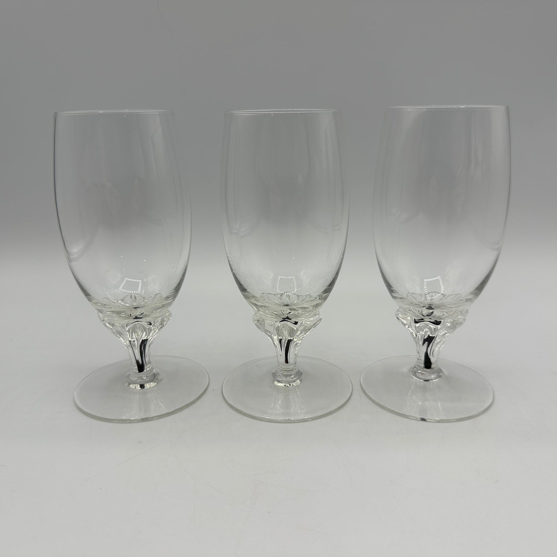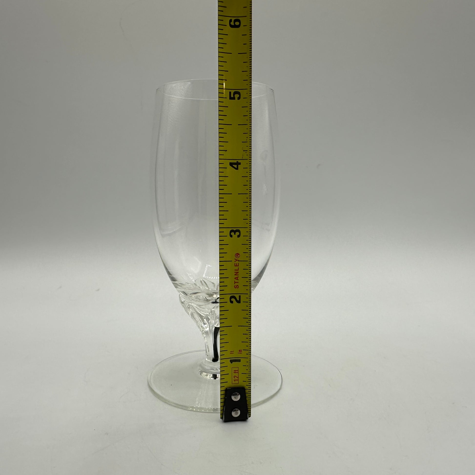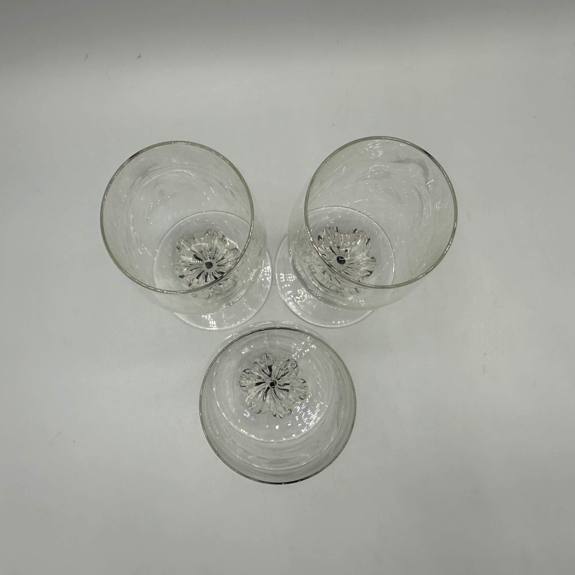 A great set of juice glasses that are sure to add a touch of pizzazz to your table. They each have a small piece of black glass in the stem, which gives them a unique look from both the side and the top. The set of glasses is in excellent vintage used condition.