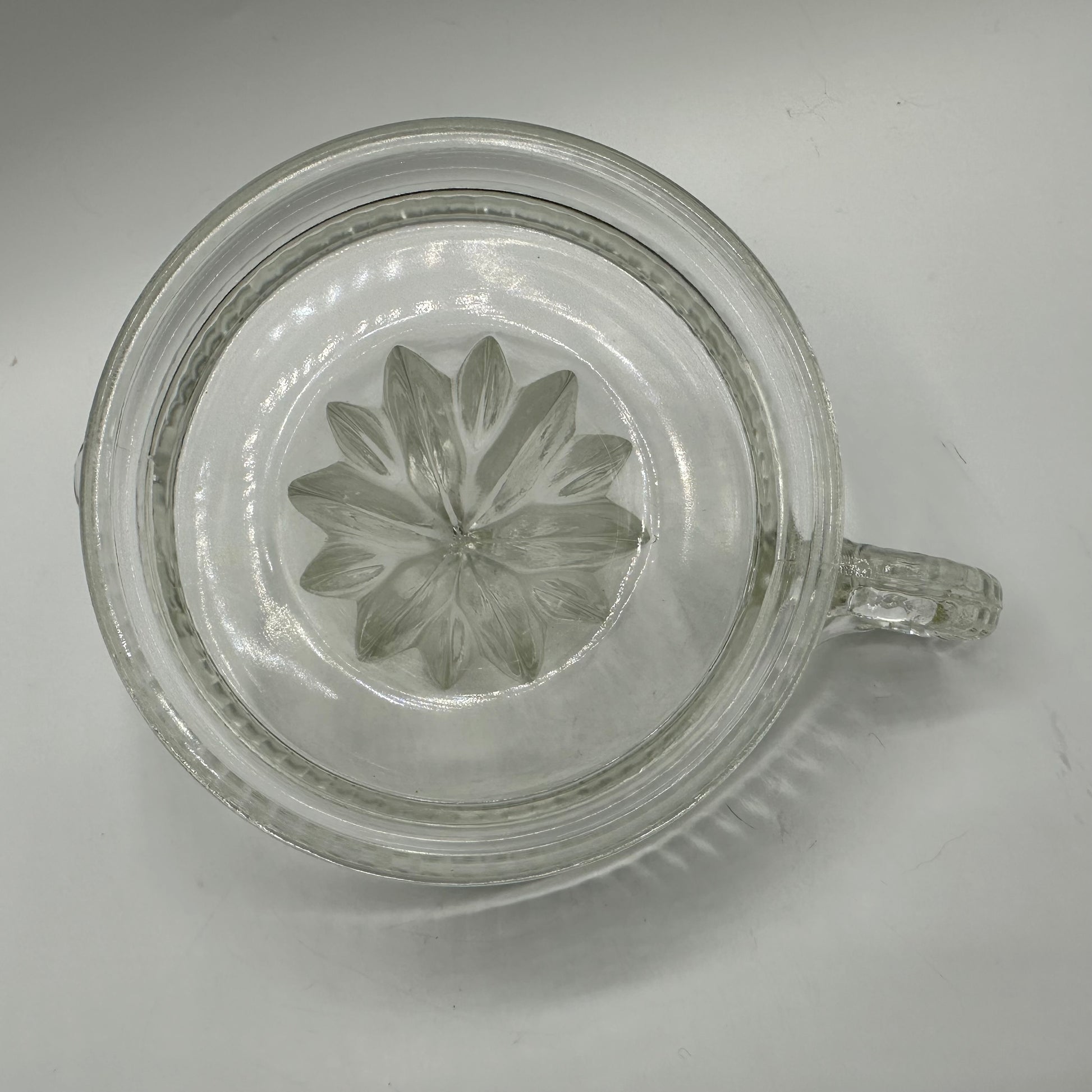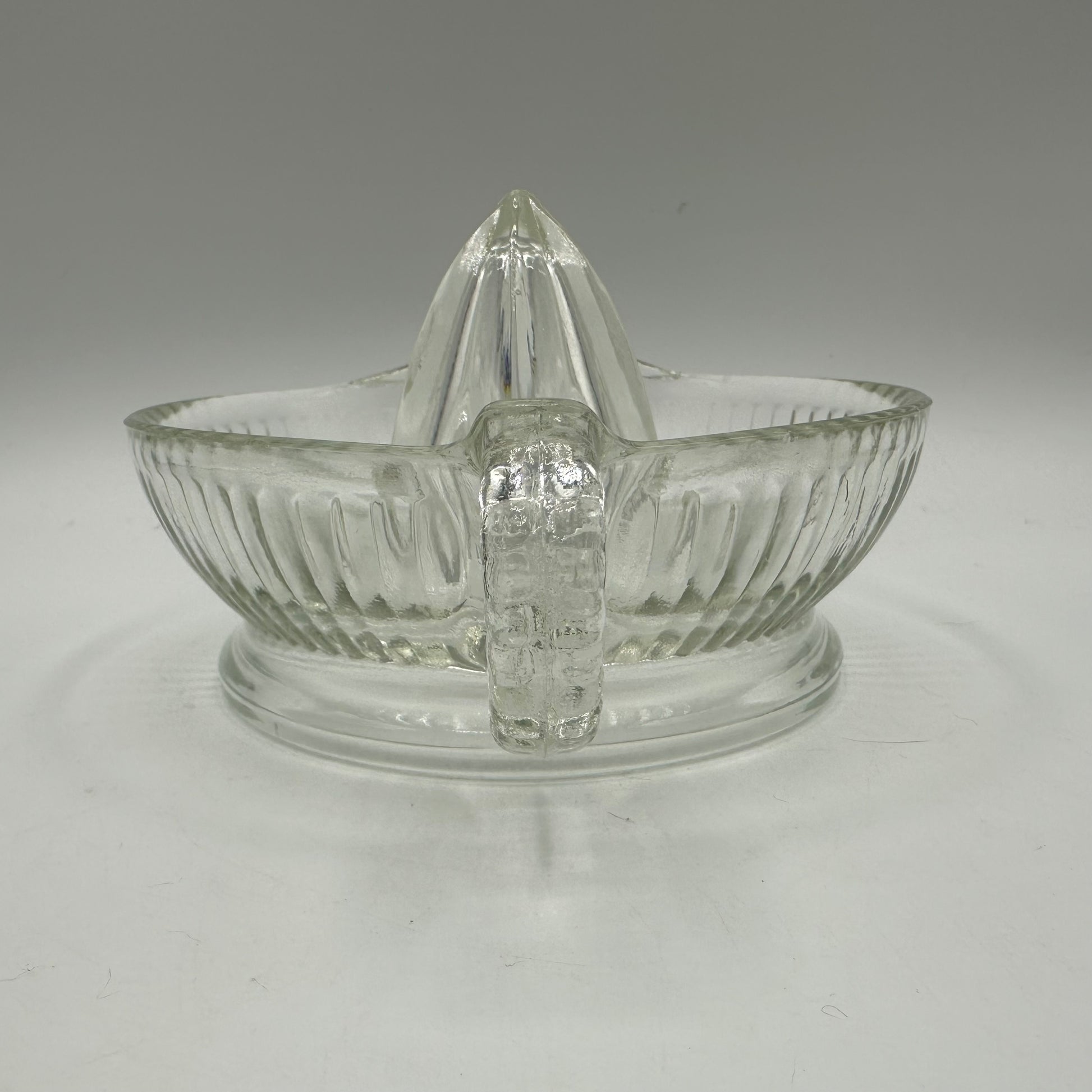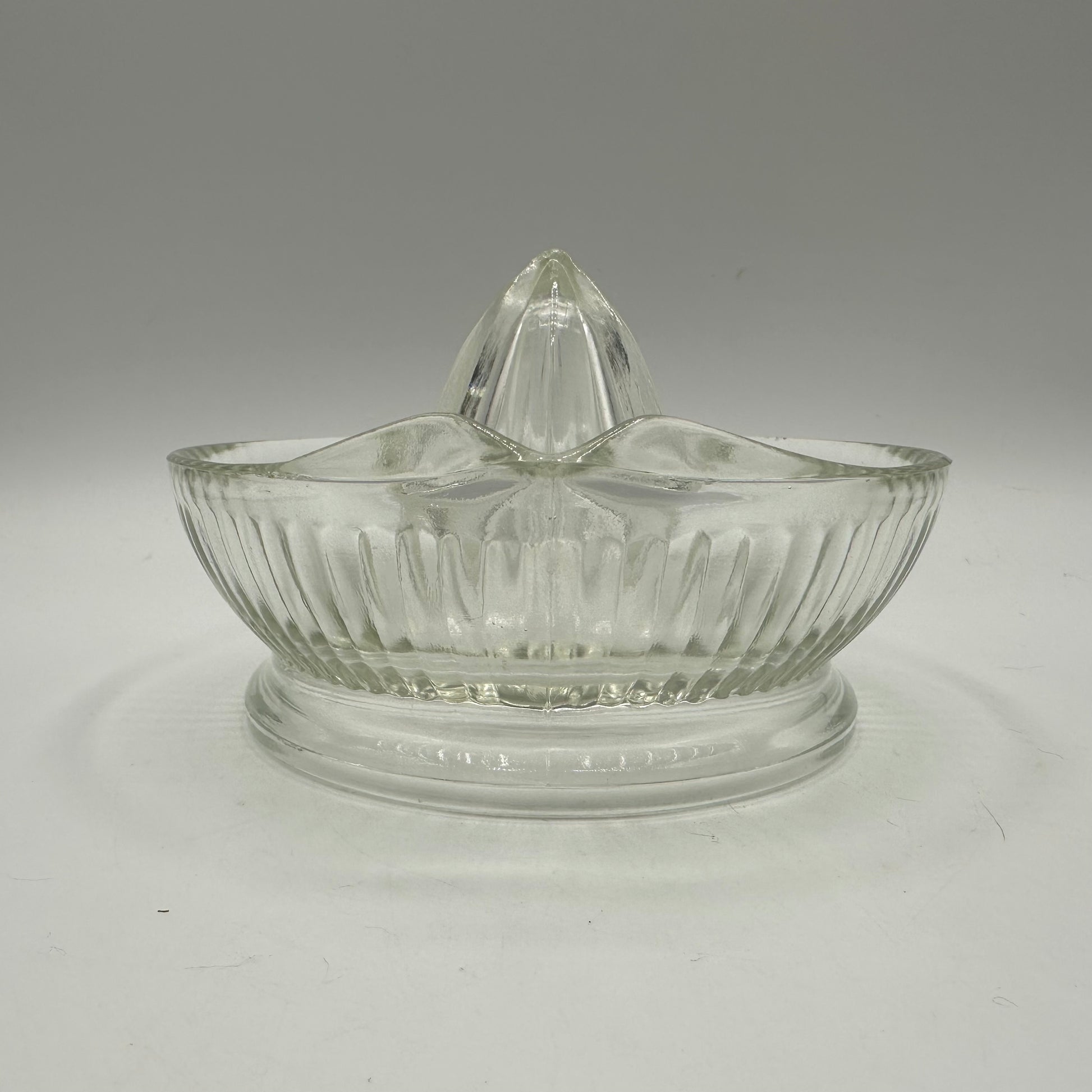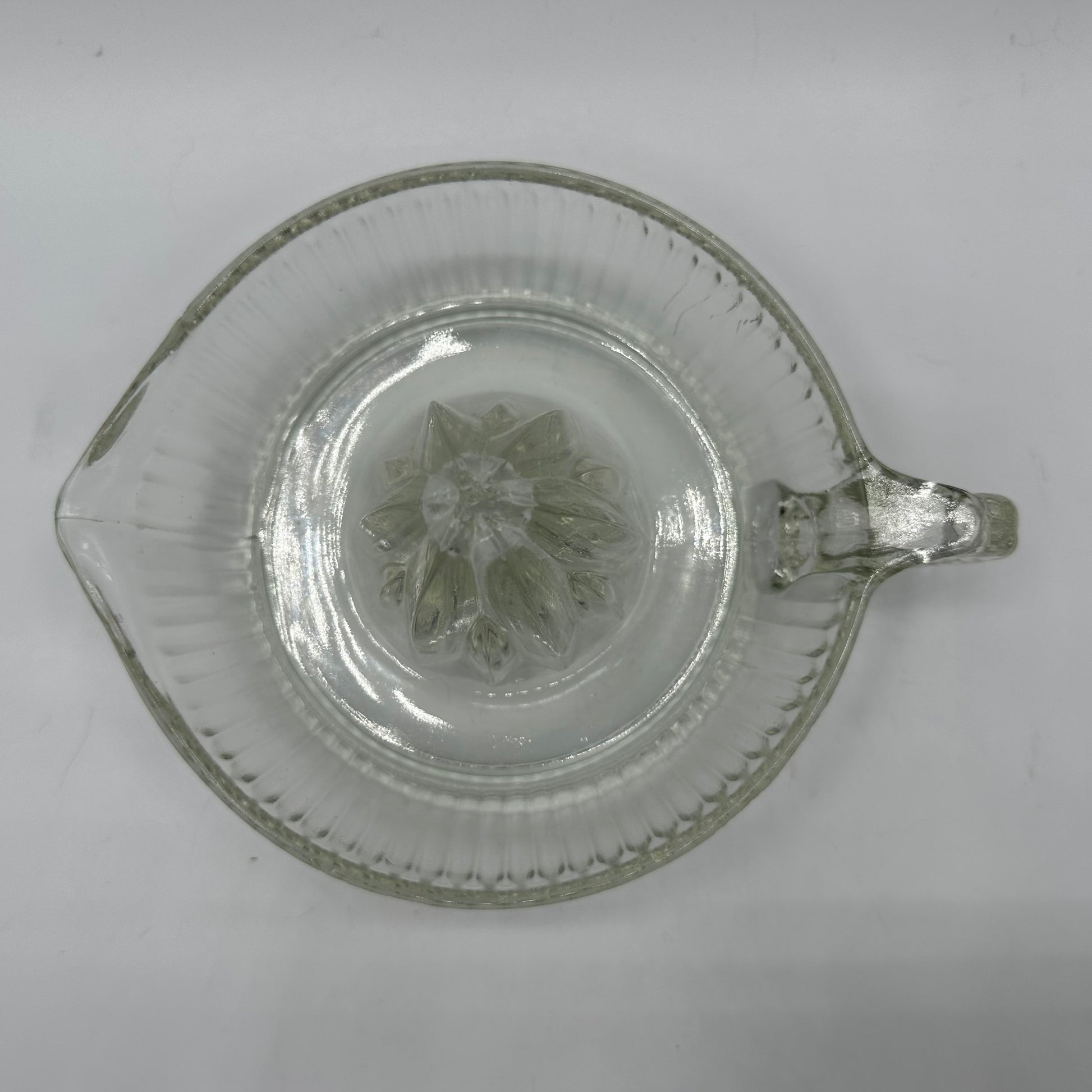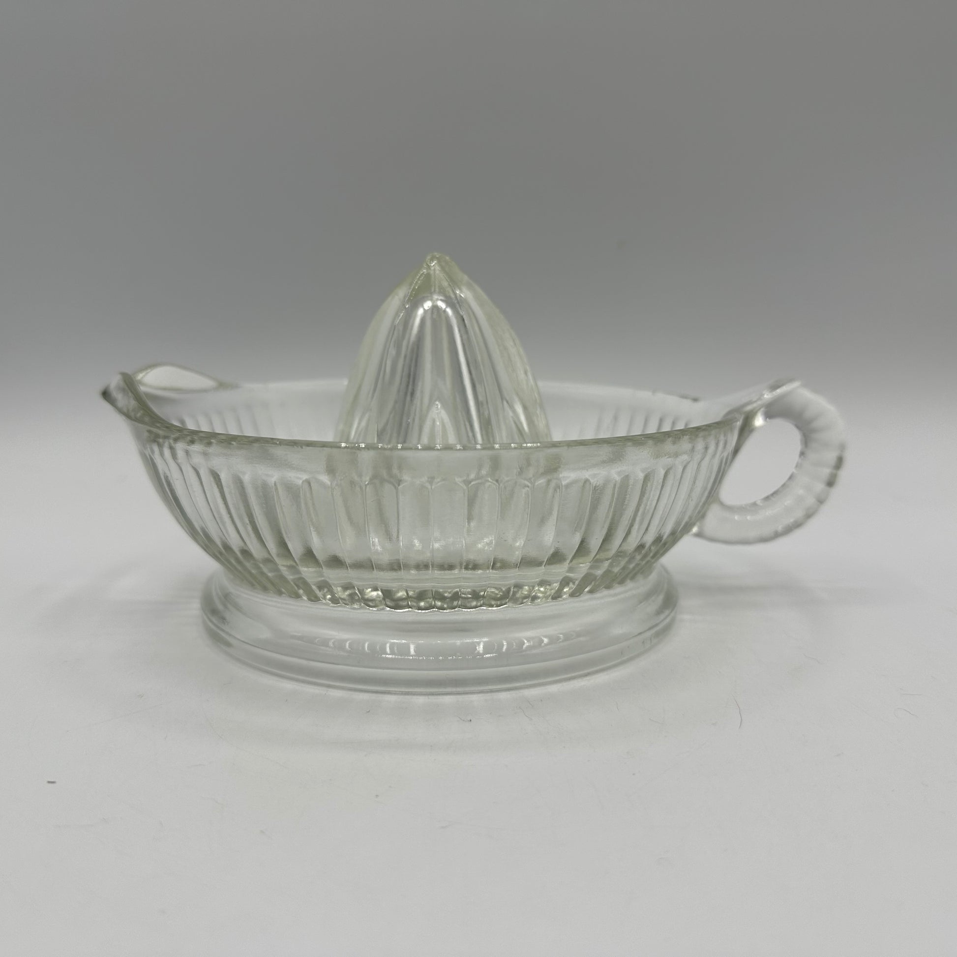 This exquisite vintage reamer embodies timeless elegance, showcasing clear cut glass adorned with a ridged design on all sides. With its graceful handle and spout, it offers both beauty and functionality. The reamer stands in excellent vintage pre-owned condition, a testament to its enduring charm.