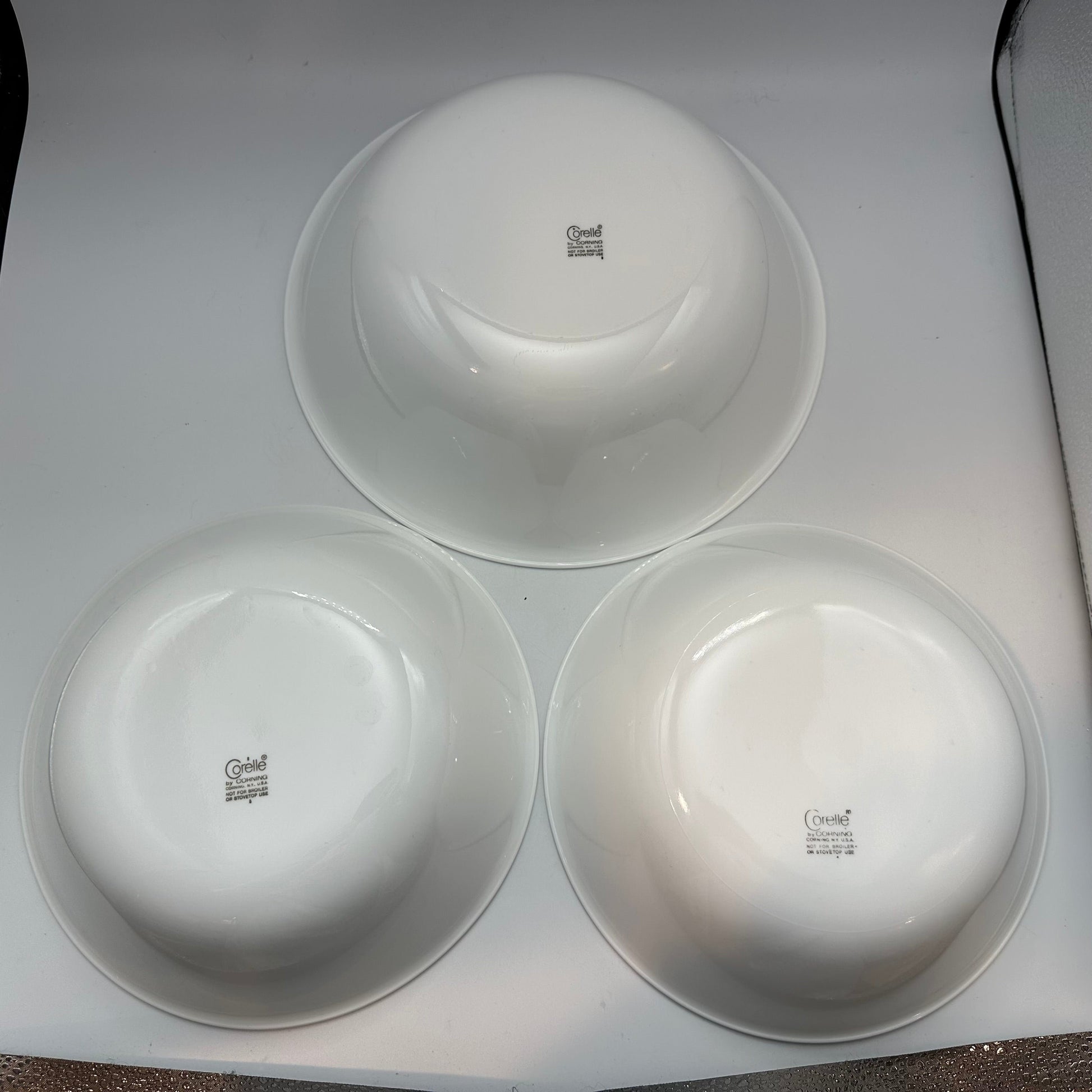 This is a fantastic set of three bowls from the 1970s, part of Corelle's Livingware collection. The set includes two 1-quart bowls and one 2-quart bowl. The bowls are white with a simple pattern and are in excellent vintage pre-owned condition.