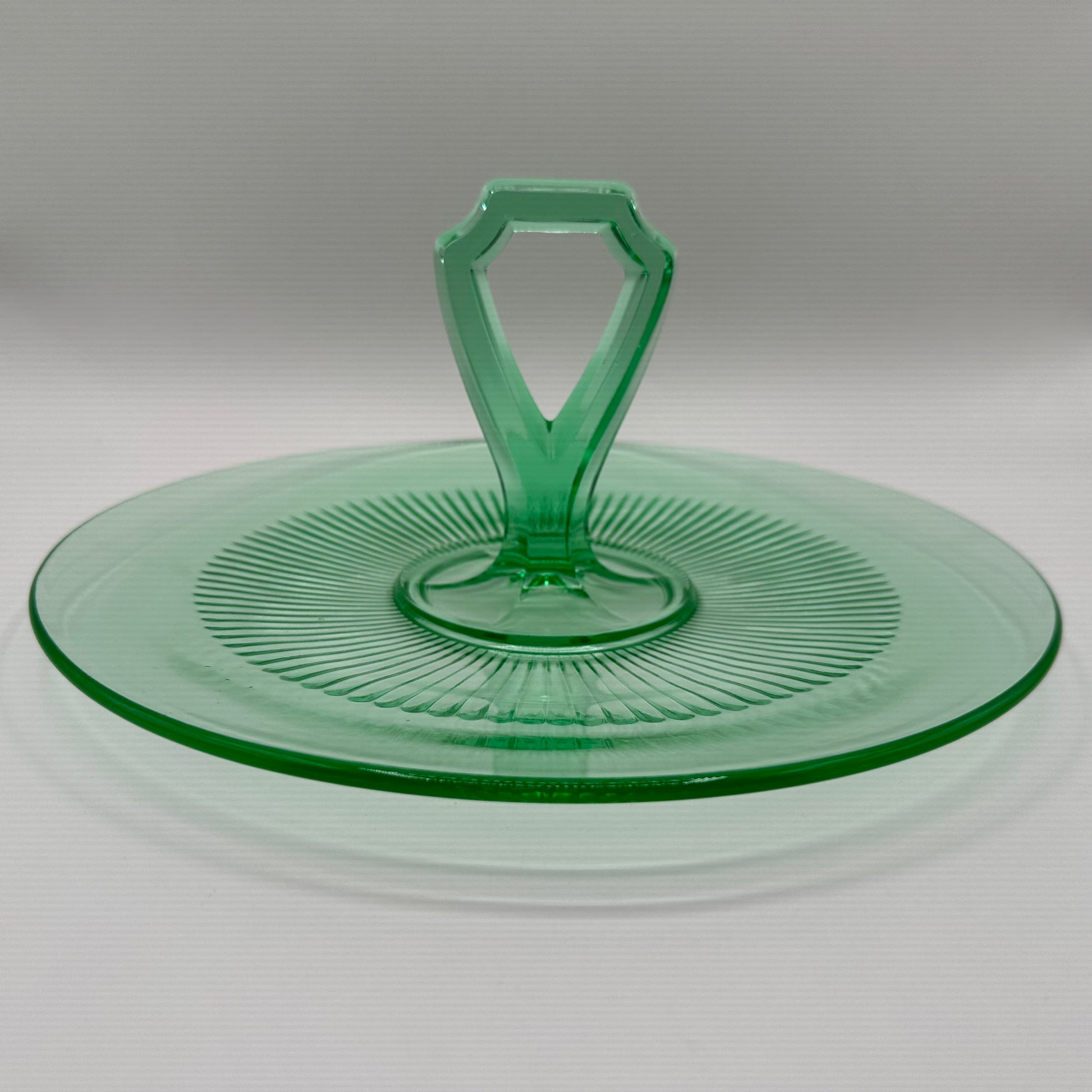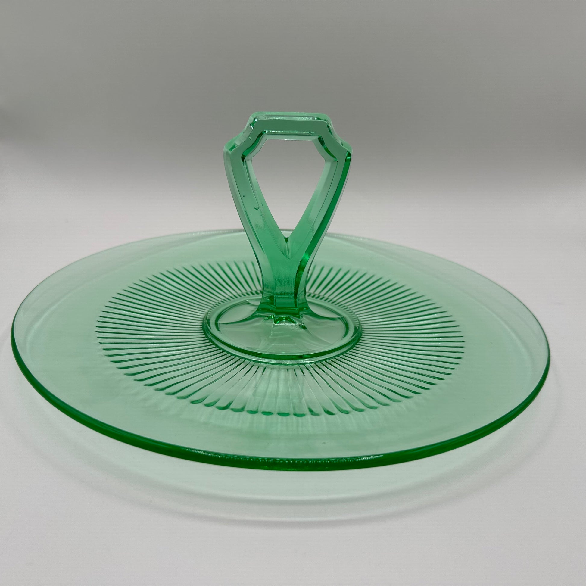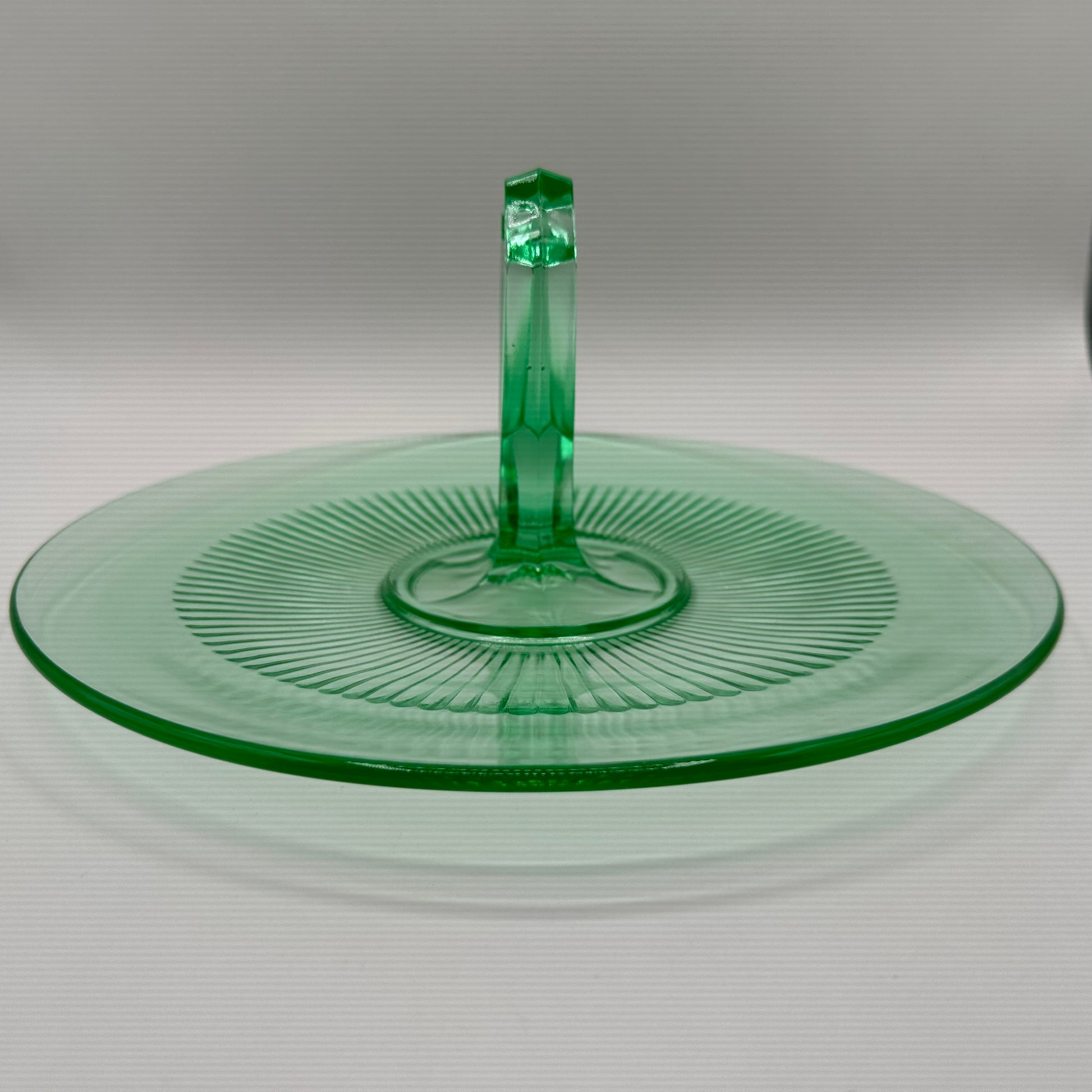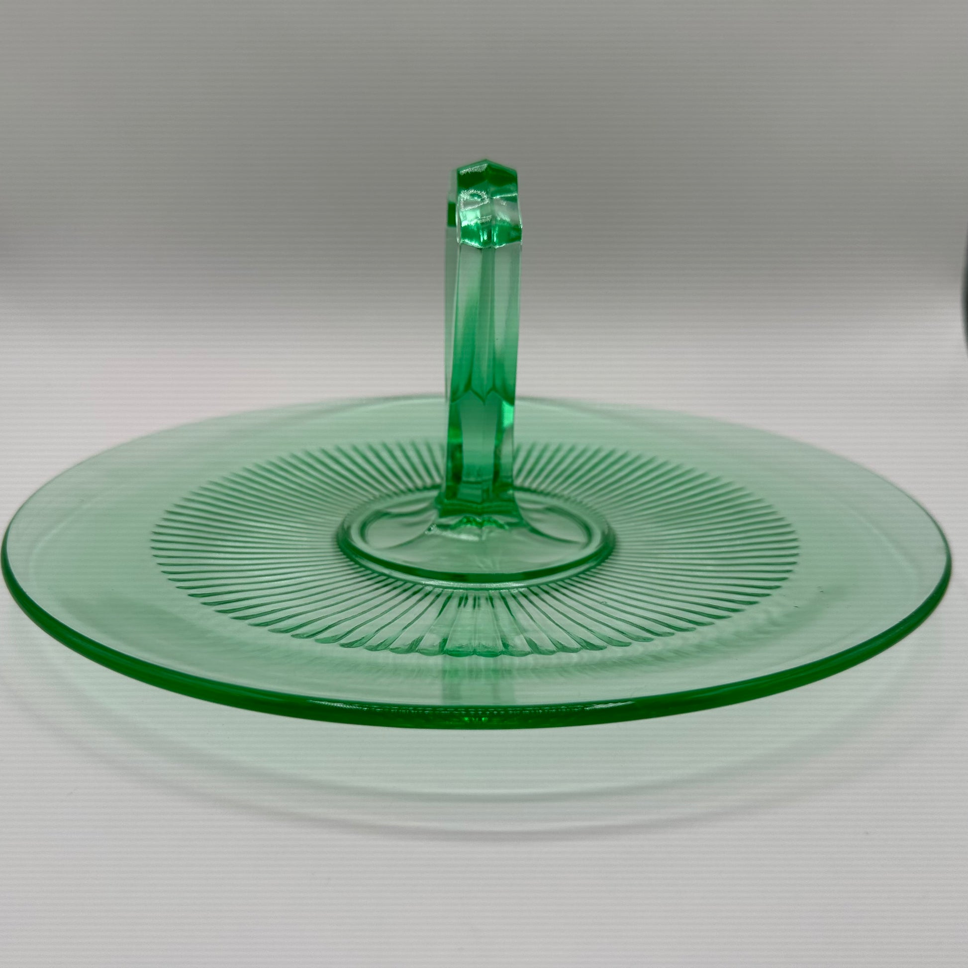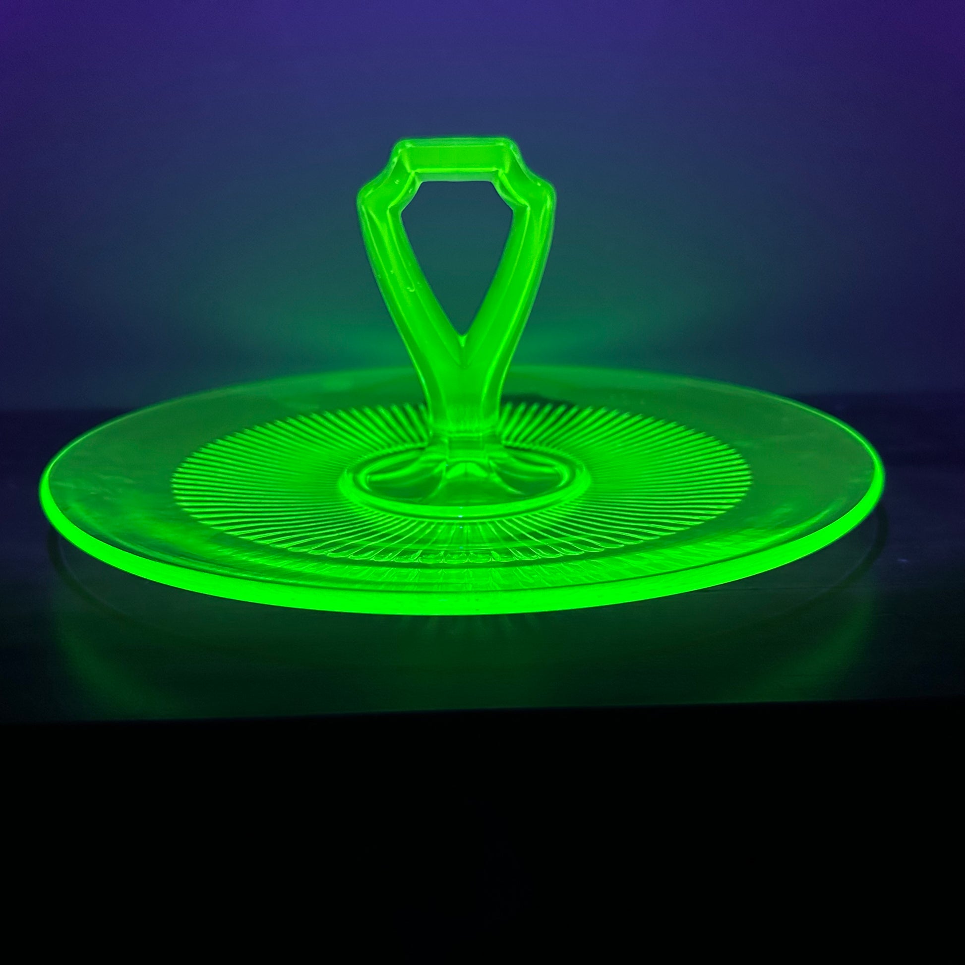 This tidbit tray dates back to the Depression era and is crafted from vaseline uranium glass, known for its remarkable fluorescence under UV light. The tray is in excellent vintage condition, showcasing its well-preserved quality despite being pre-owned.