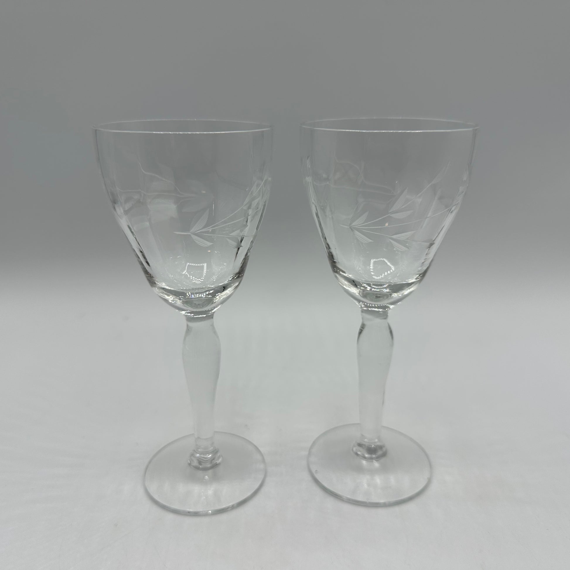 This is a delightful set of two stemmed cordial glasses. Each glass features an intricate etched floral design and is in excellent vintage pre-owned condition.