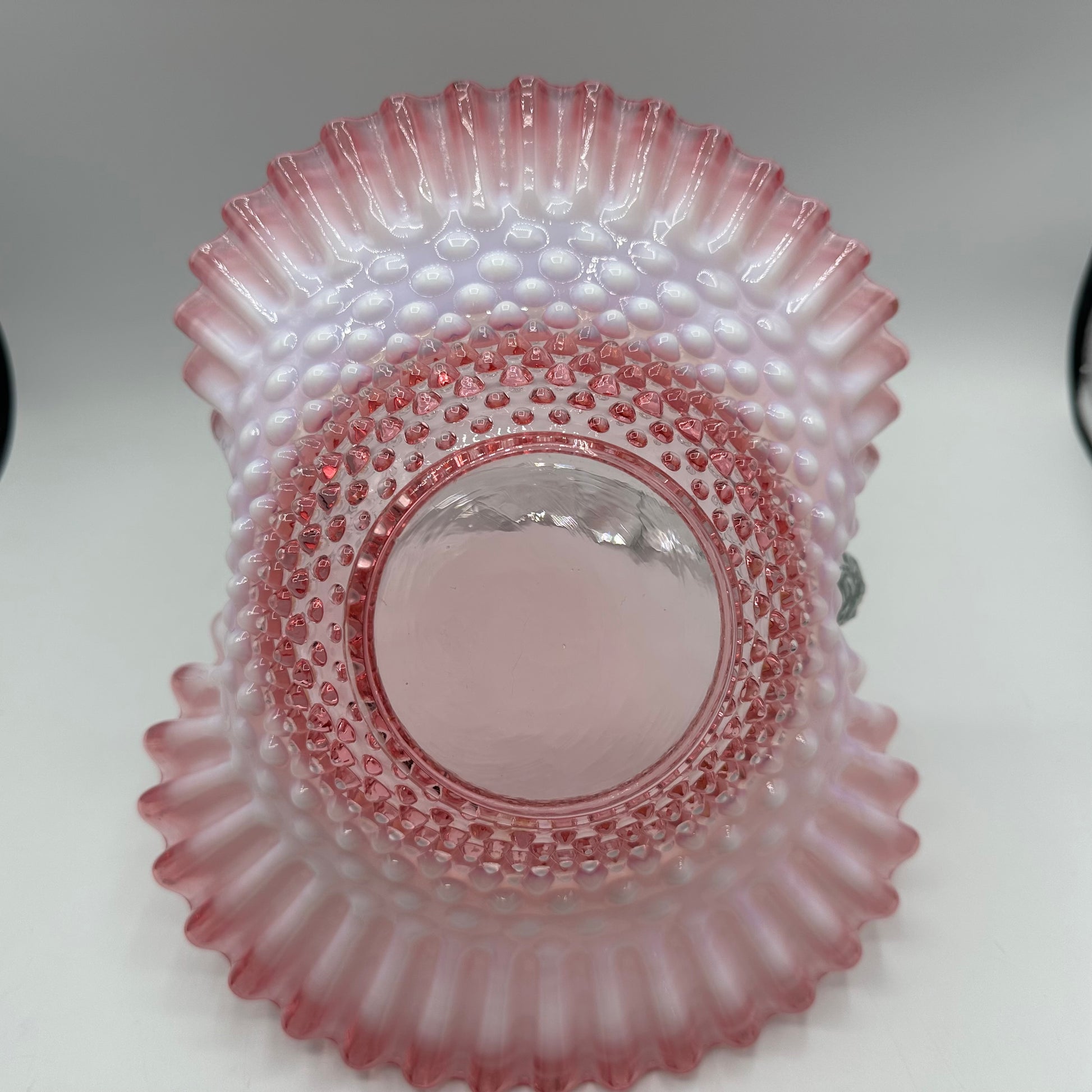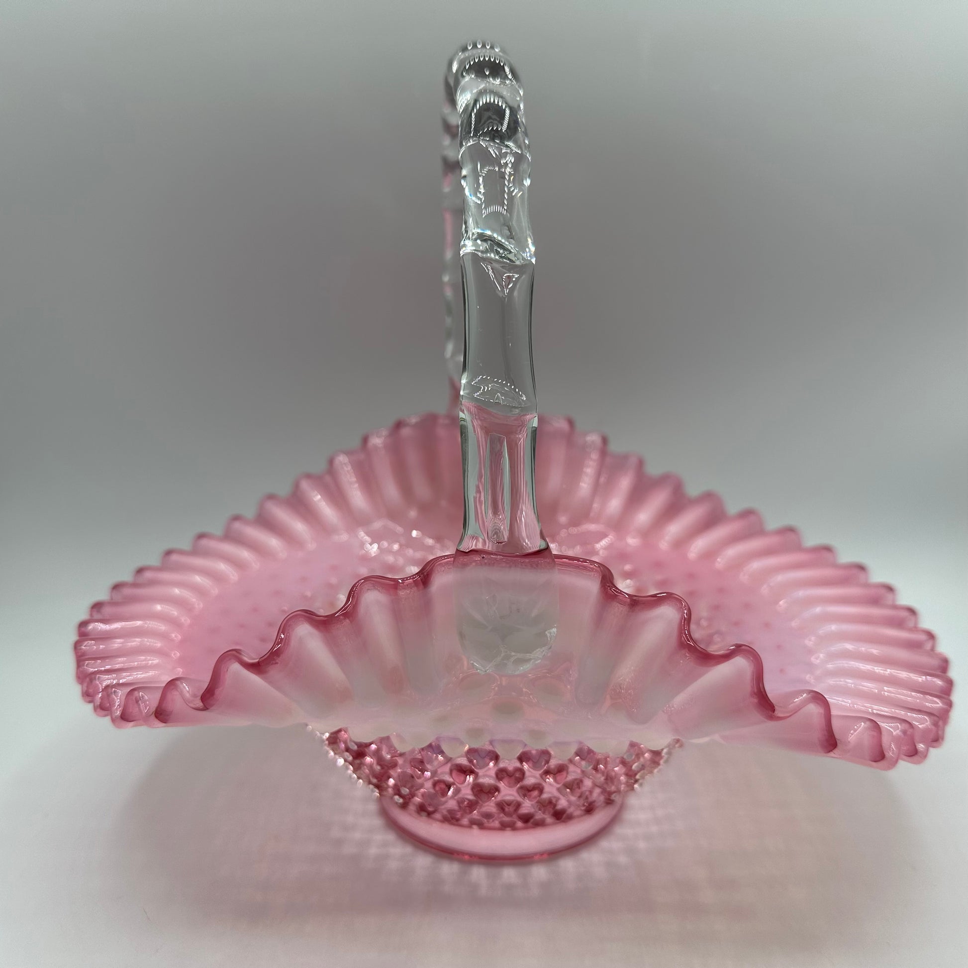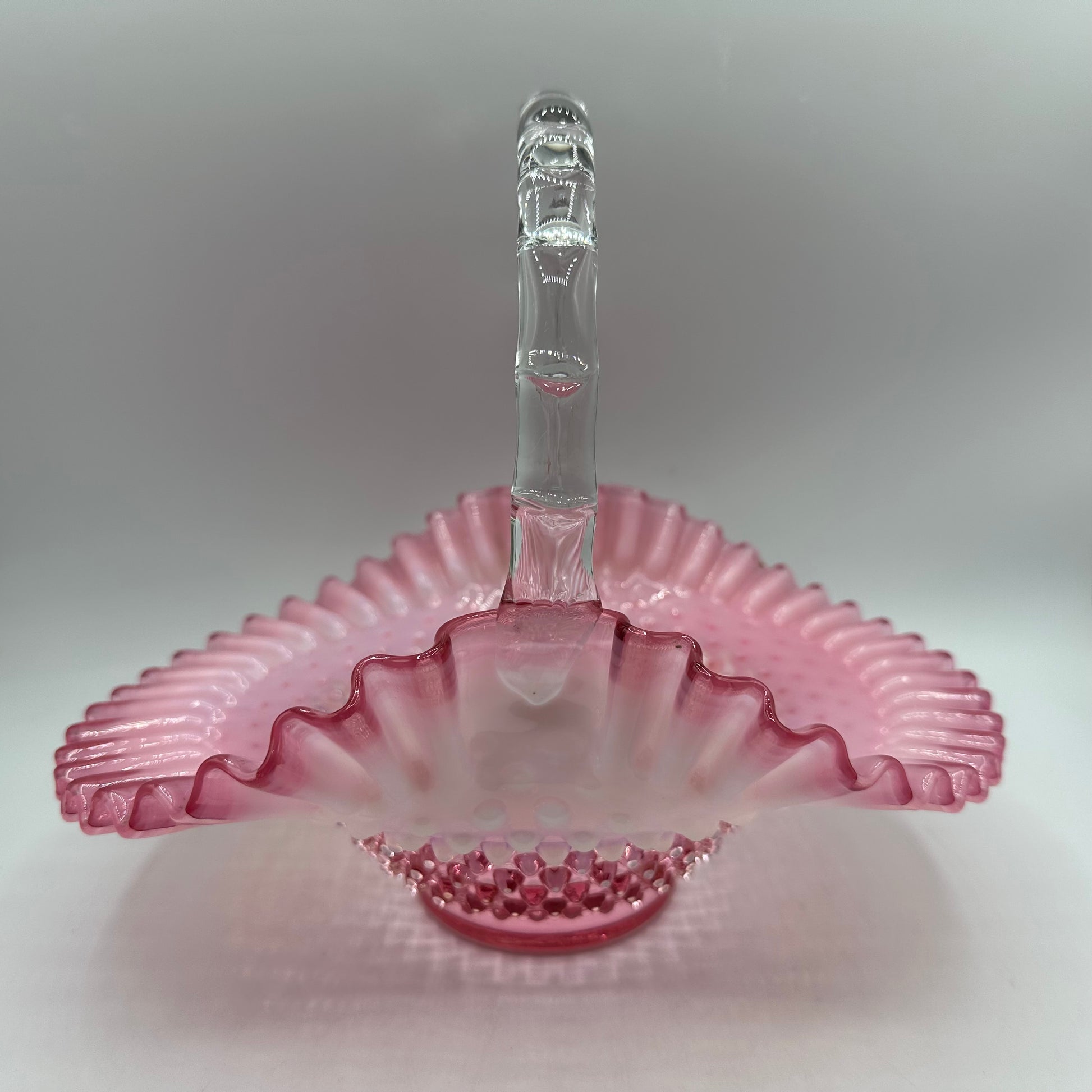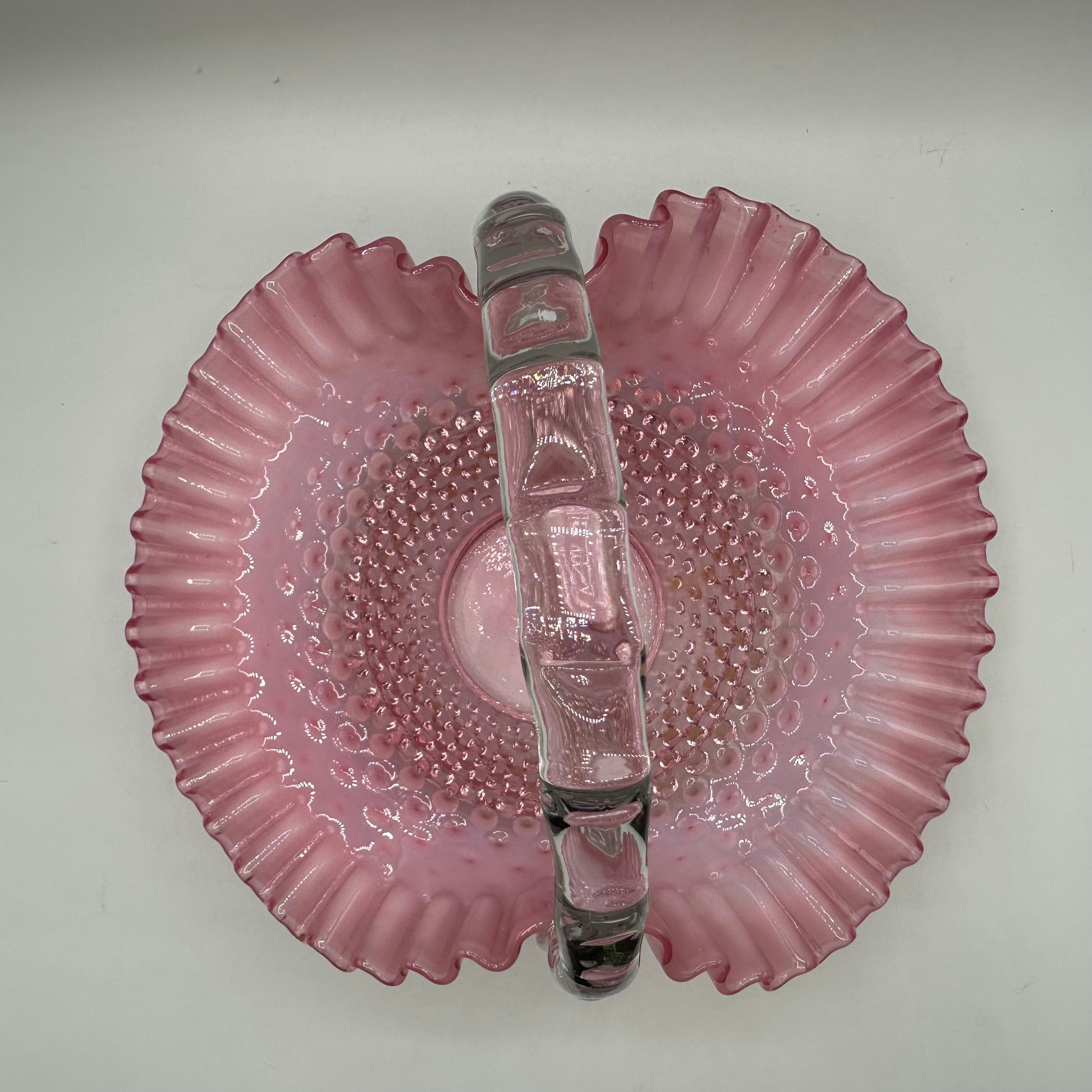 This stunning brides' basket by Fenton showcases the iconic hobnail pattern in a beautiful cranberry opalescent glass. The piece is in excellent vintage pre-owned condition, making it a wonderful addition to any collection.