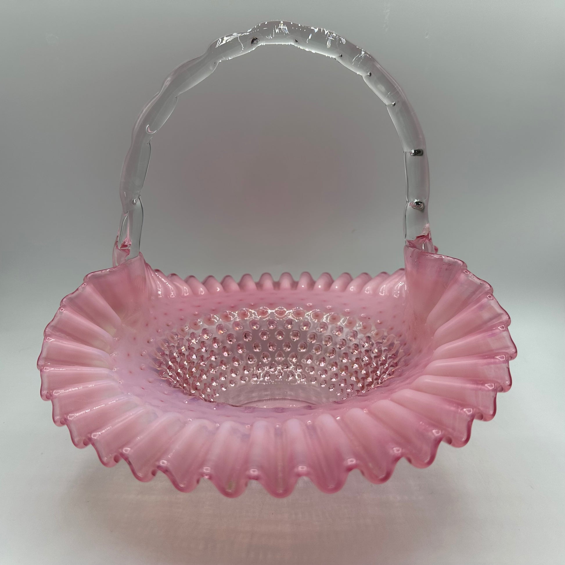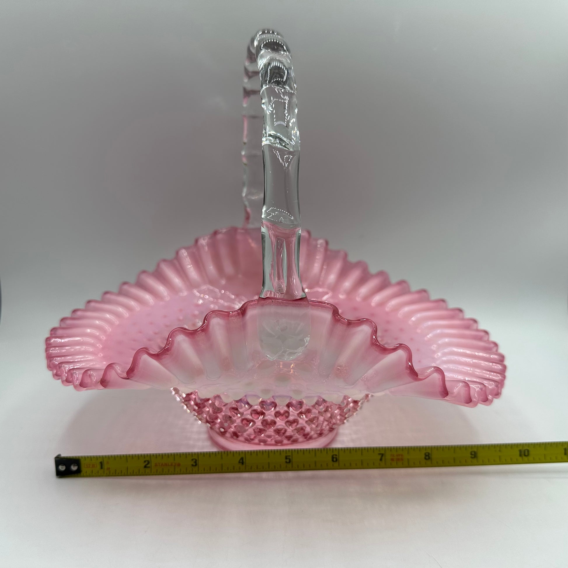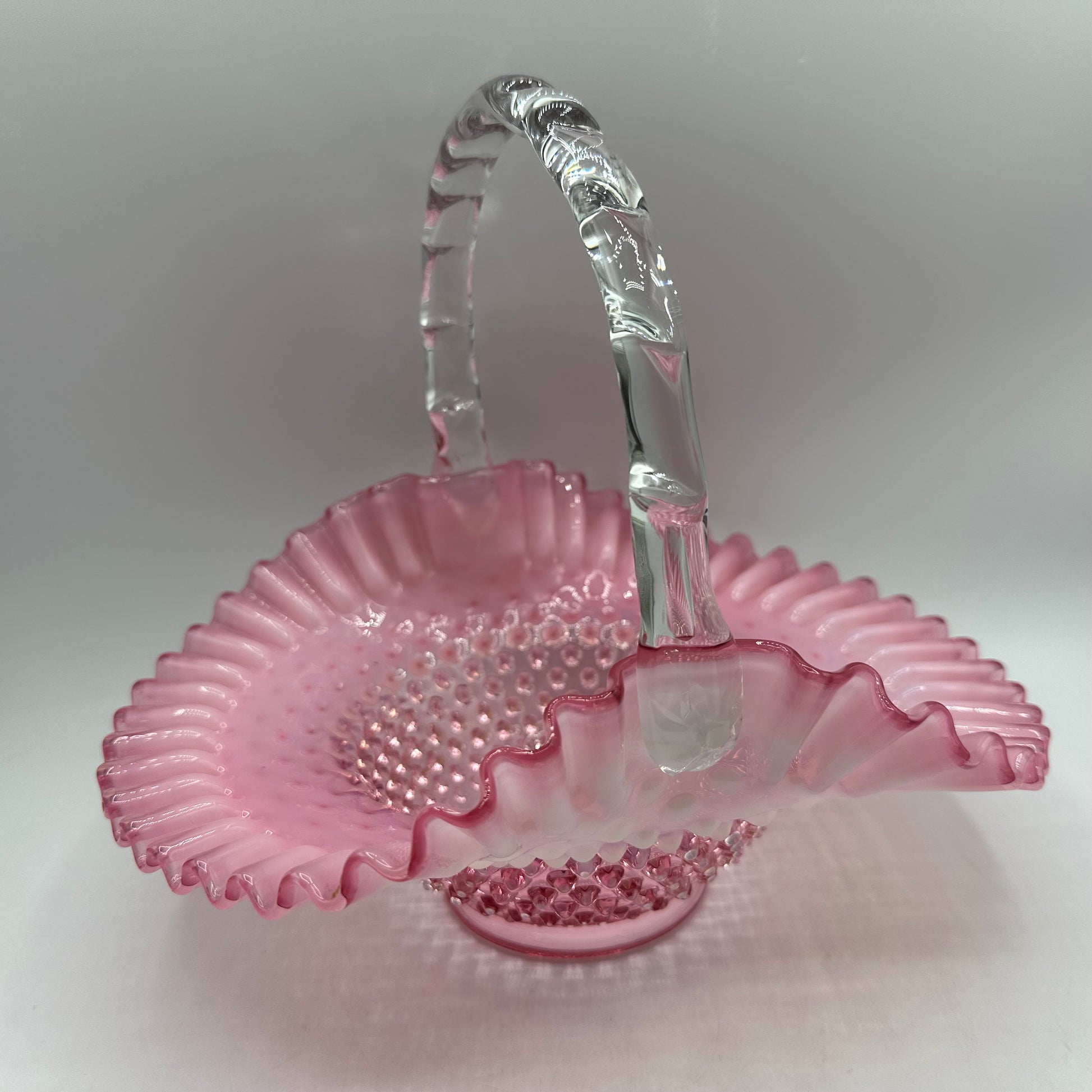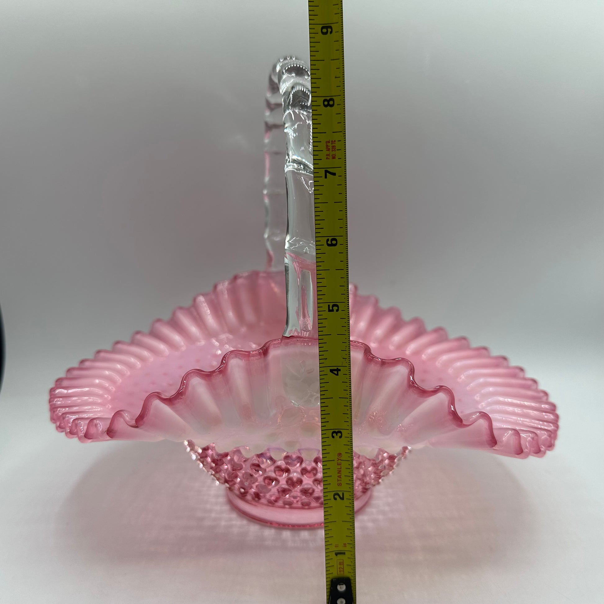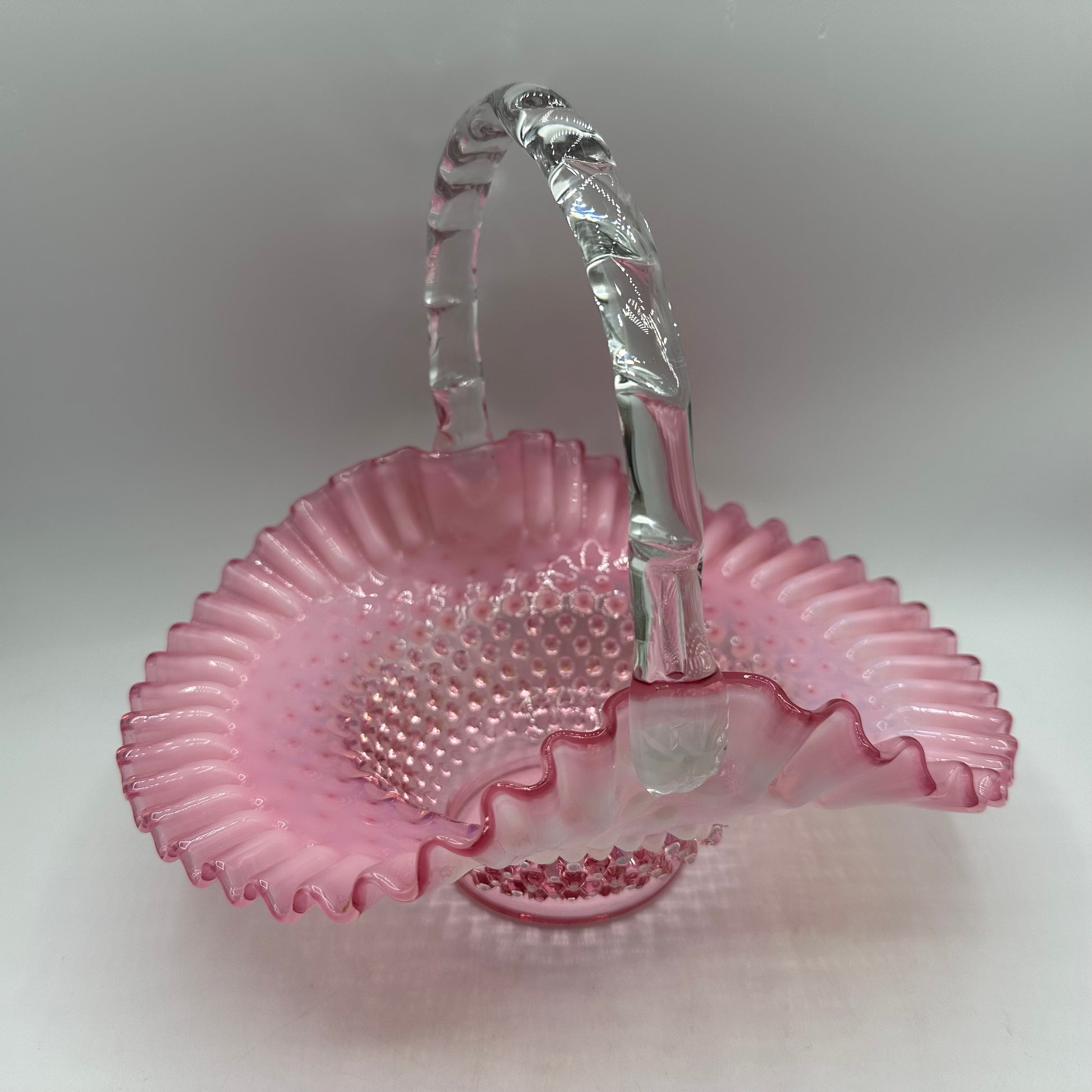 This stunning brides' basket by Fenton showcases the iconic hobnail pattern in a beautiful cranberry opalescent glass. The piece is in excellent vintage pre-owned condition, making it a wonderful addition to any collection.