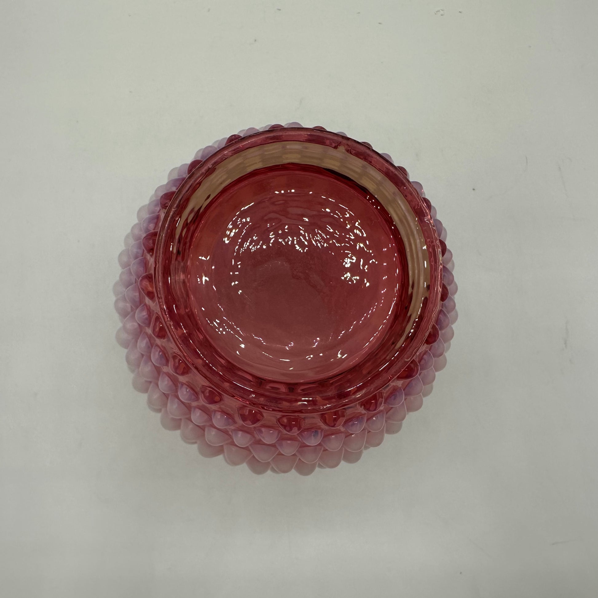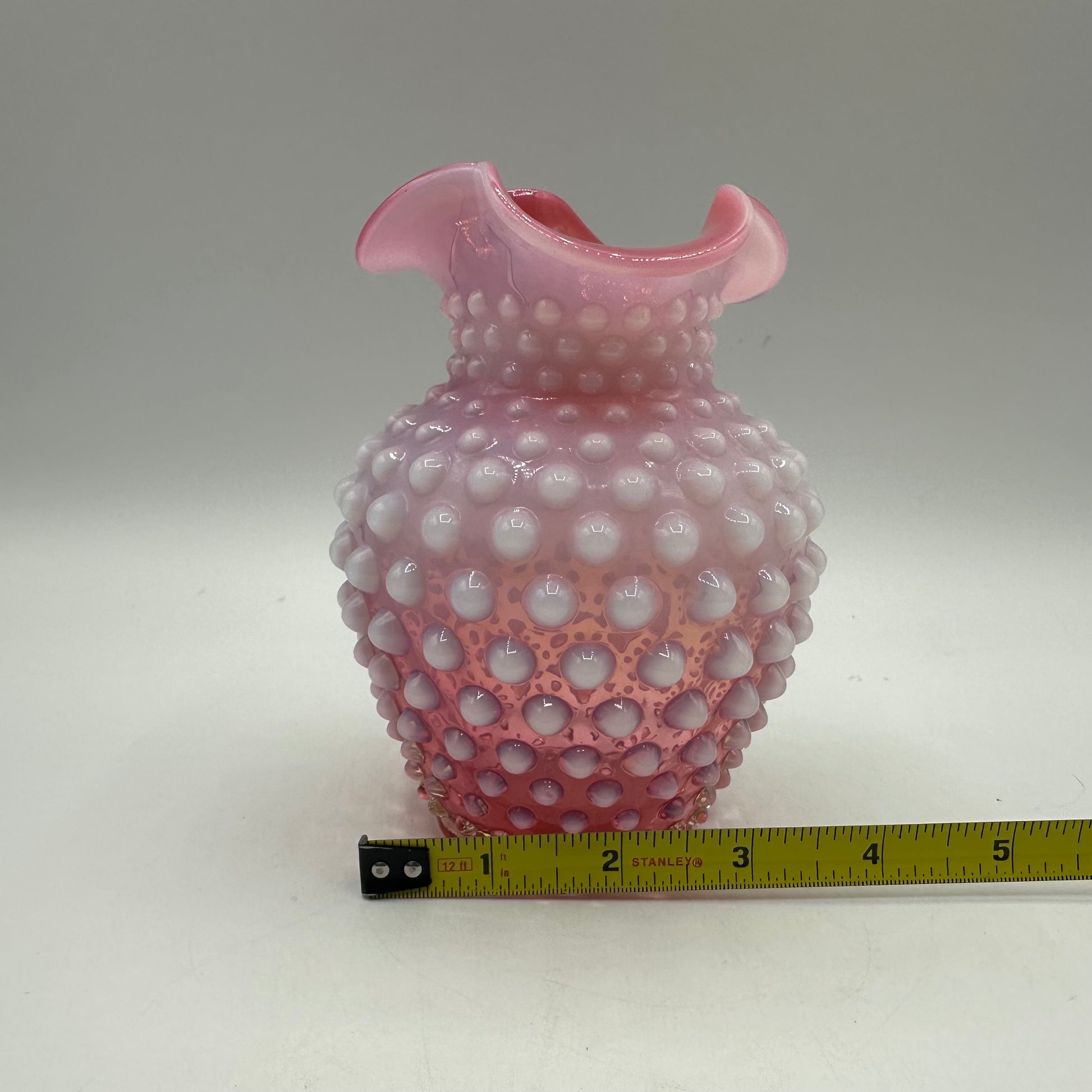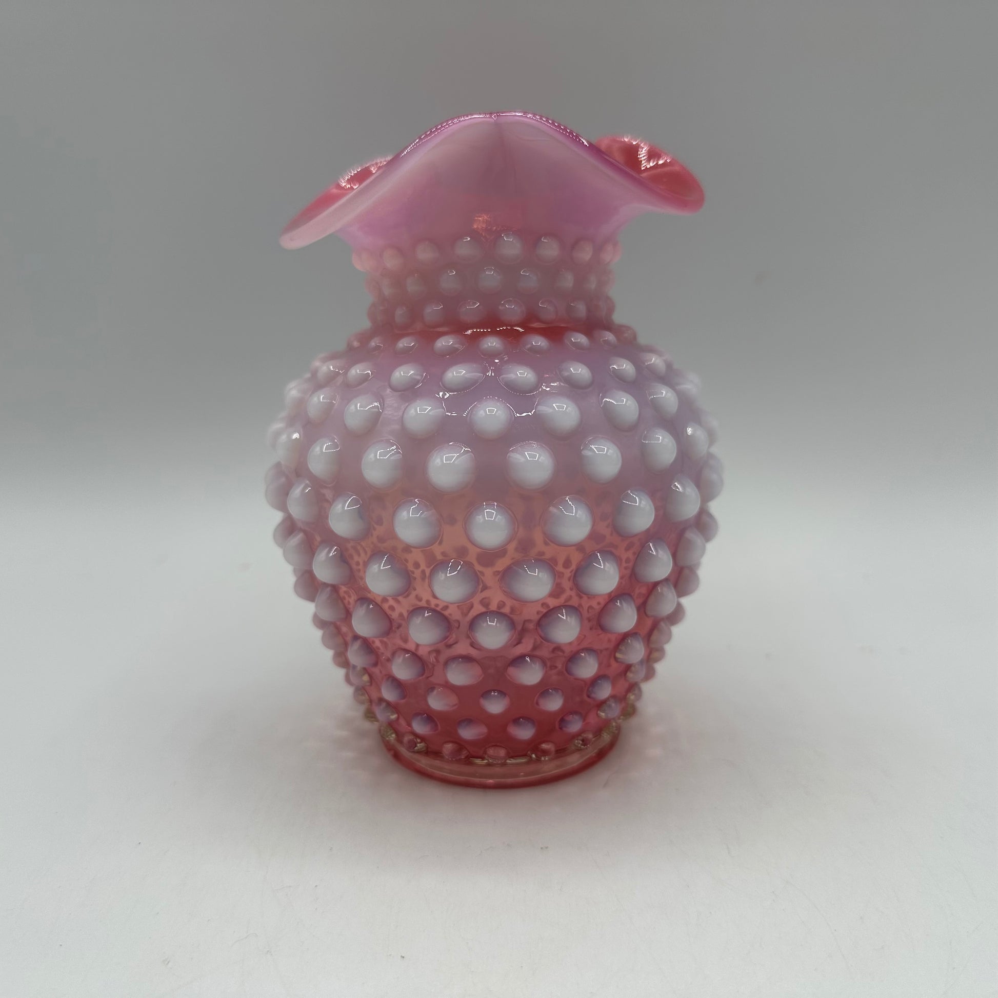 This exquisite vase is crafted by Fenton and showcases a stunning cranberry opalescent hobnail design. Standing at 5 inches tall, it features a distinctive triangular crimped rim. The vase is in excellent vintage pre-owned condition, making it a charming addition to any collection or decor.