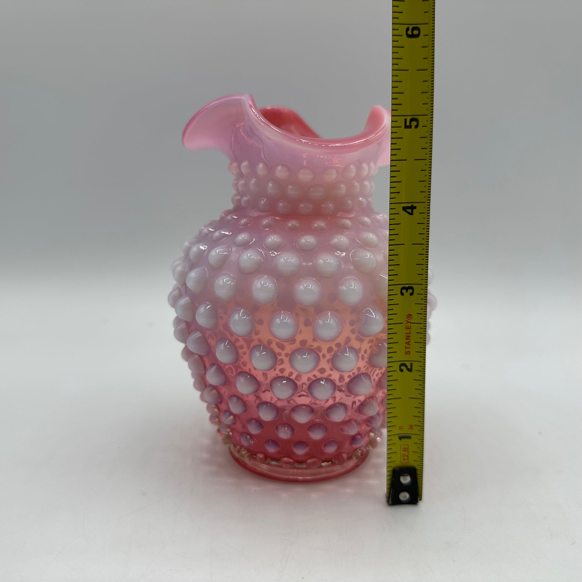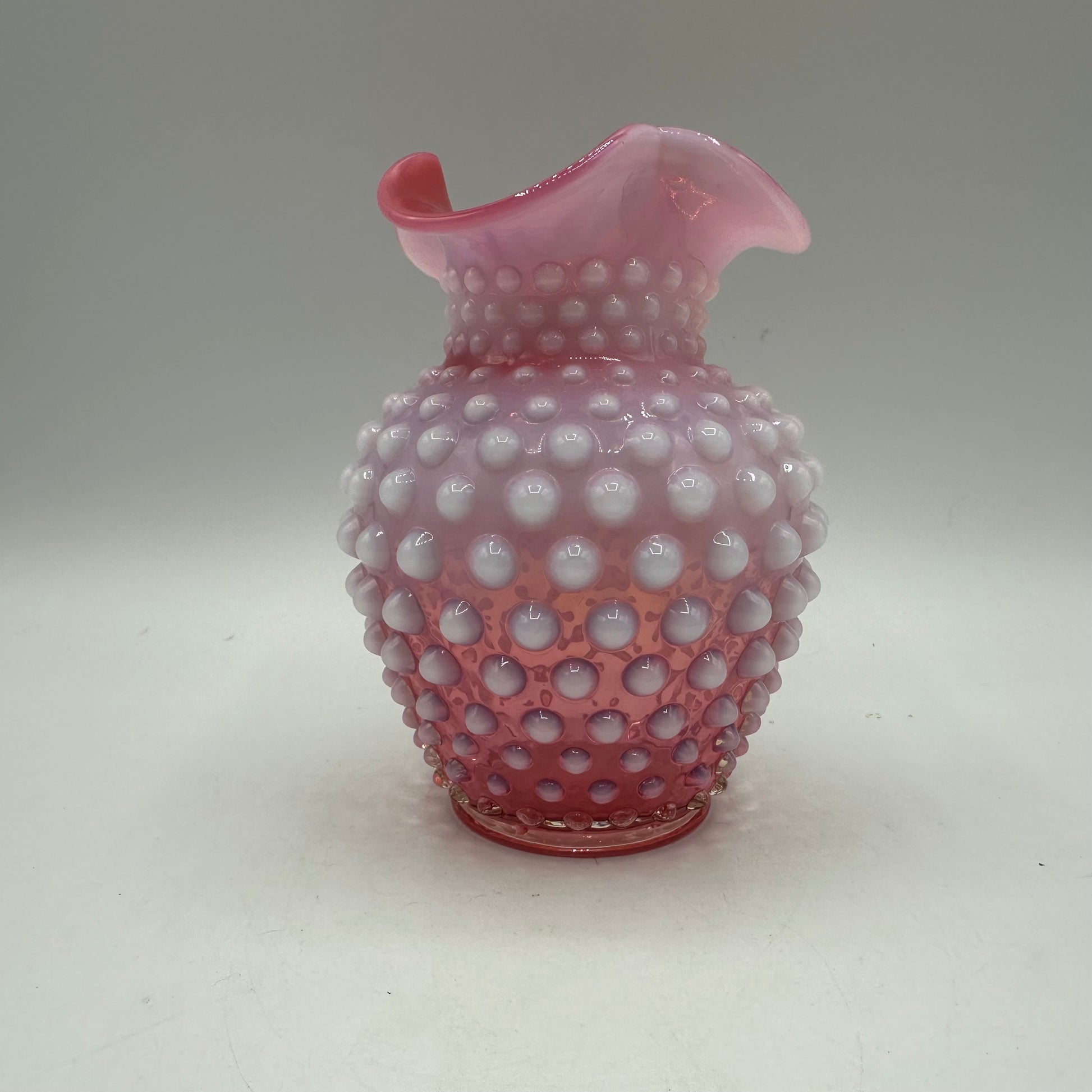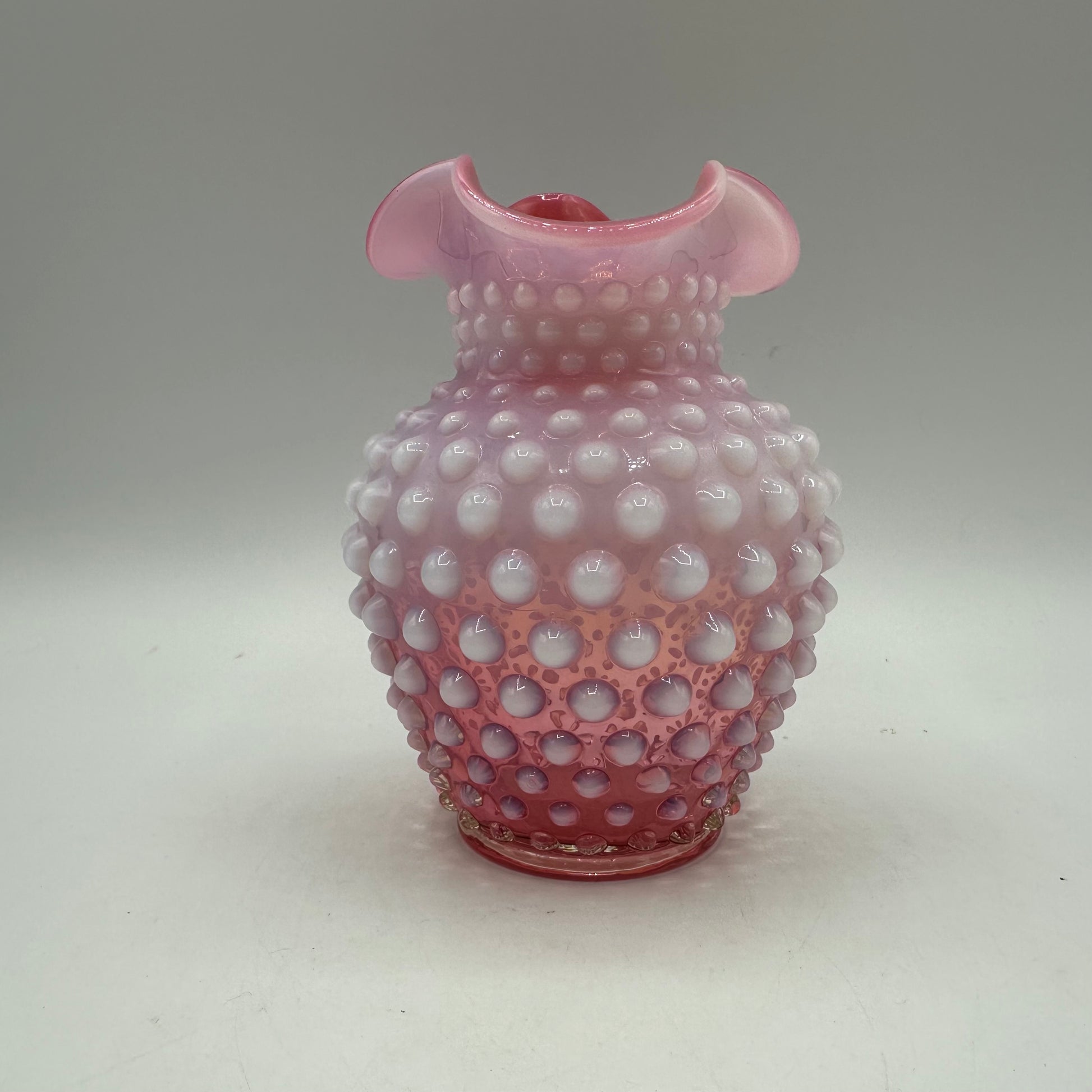 This exquisite vase is crafted by Fenton and showcases a stunning cranberry opalescent hobnail design. Standing at 5 inches tall, it features a distinctive triangular crimped rim. The vase is in excellent vintage pre-owned condition, making it a charming addition to any collection or decor.