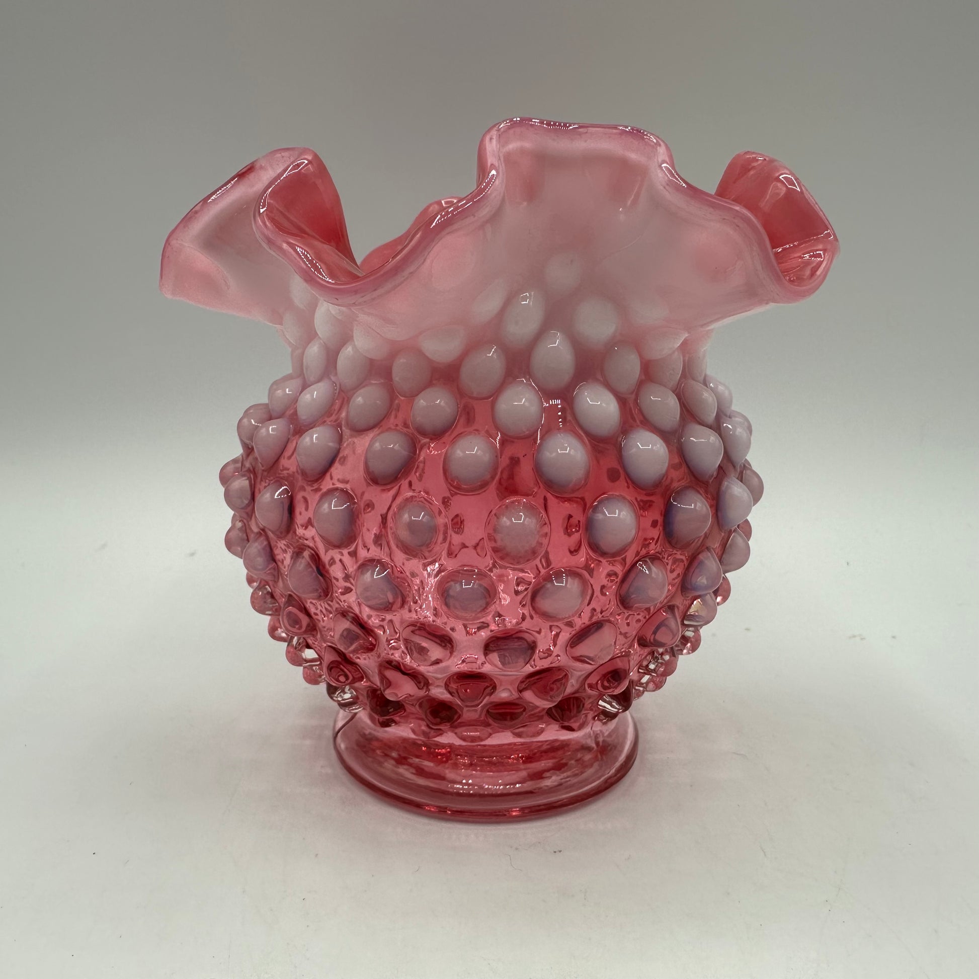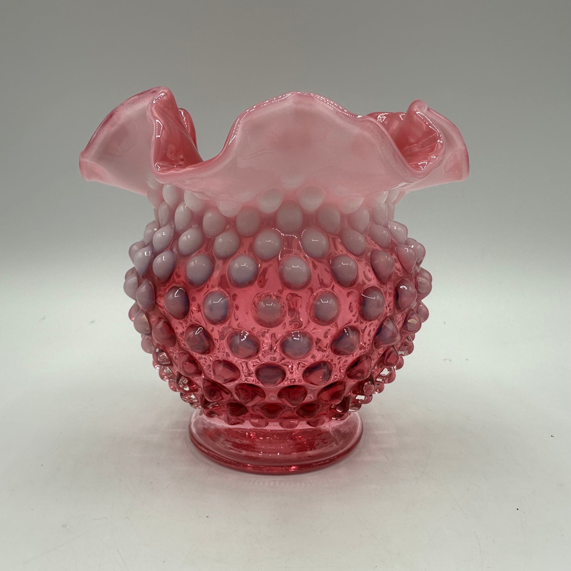 Fenton Cranberry Opalescent Hobnail Double Crimped Vase 4.25" Tall