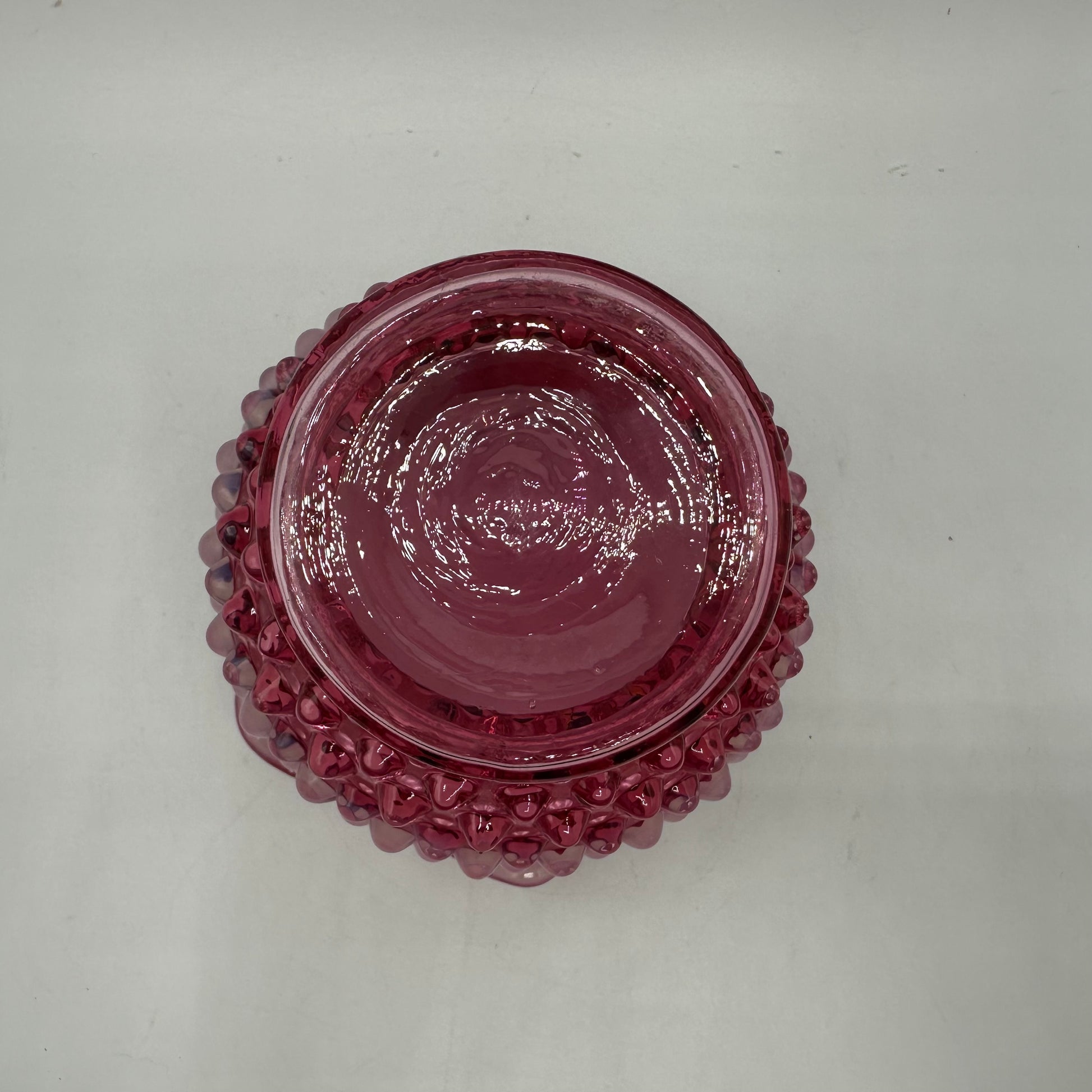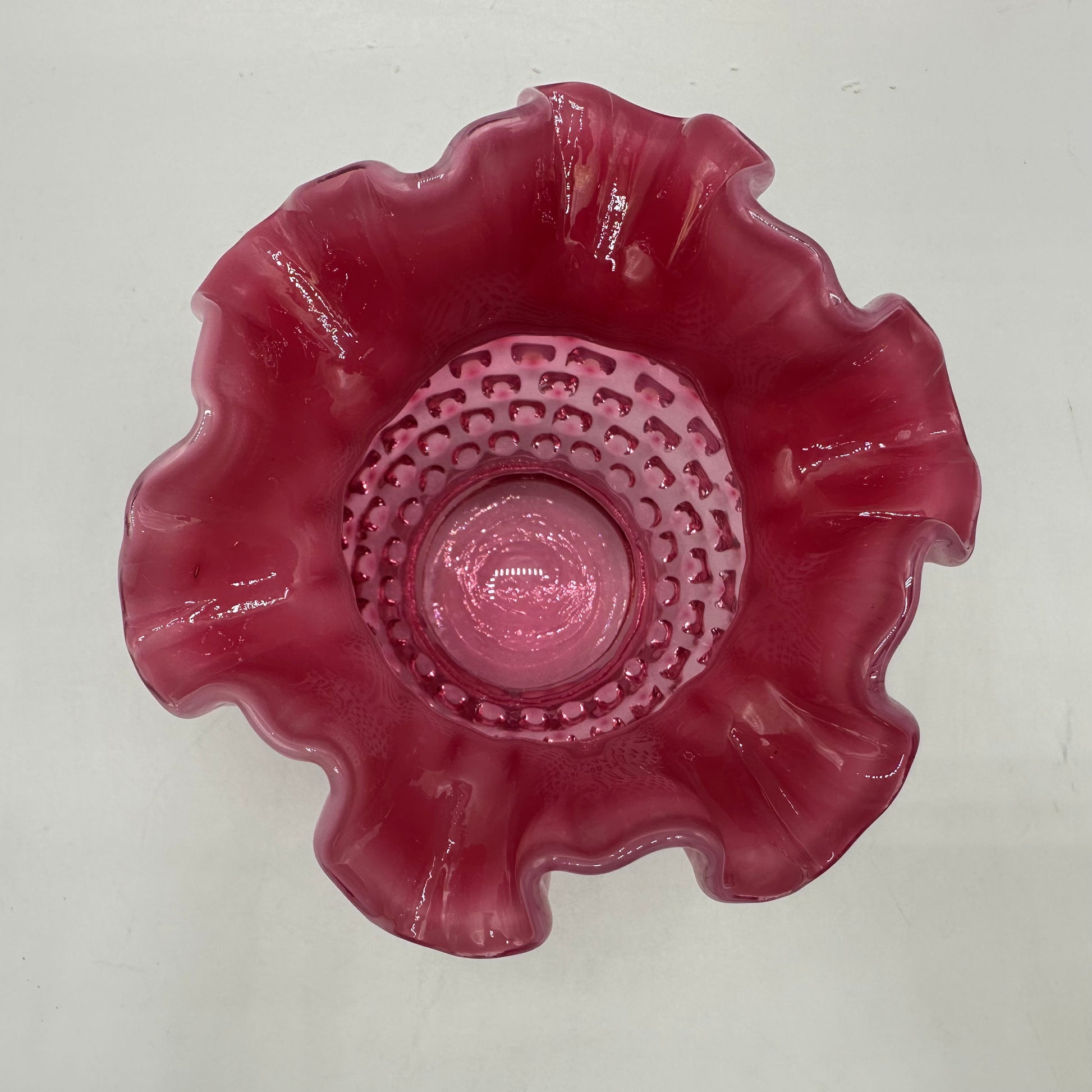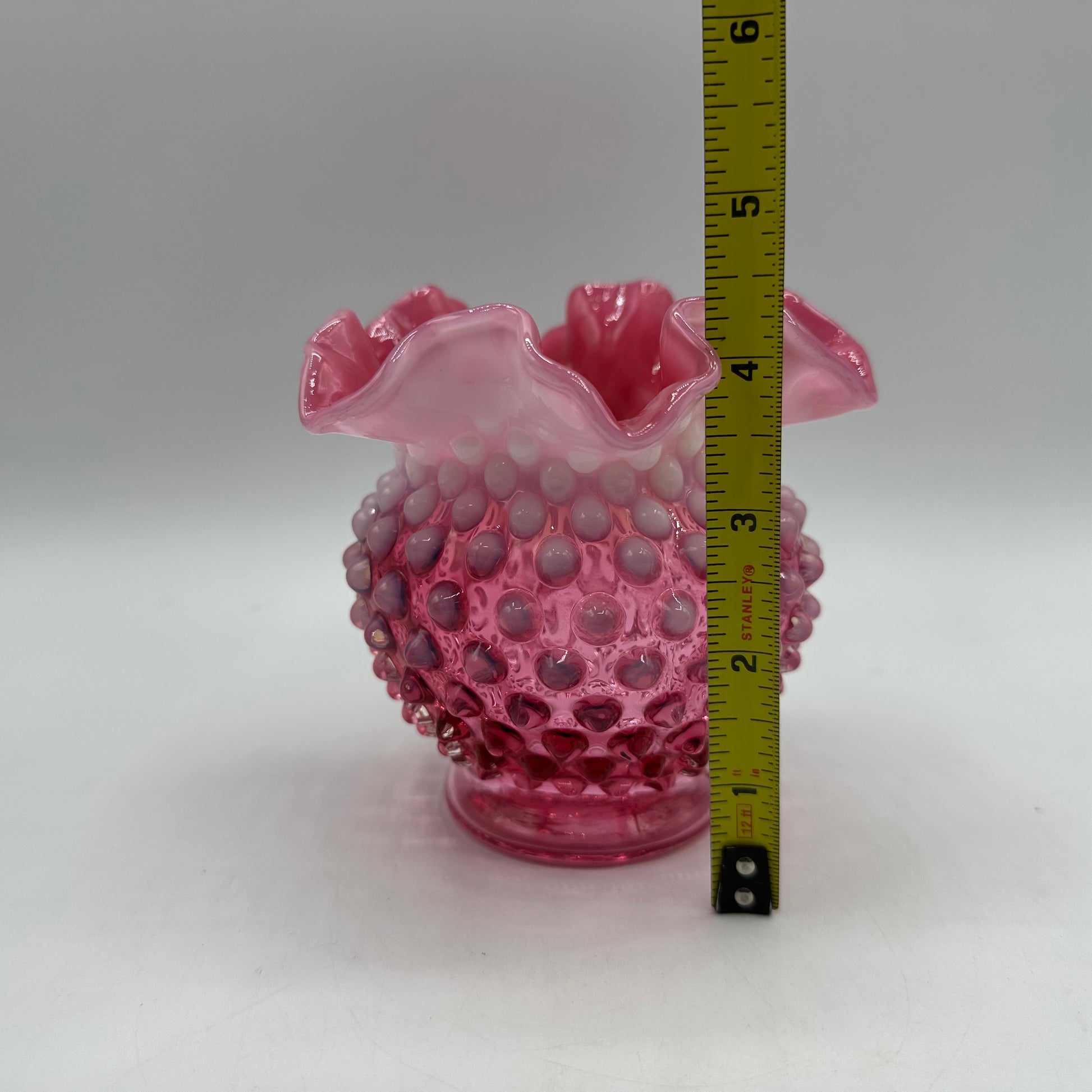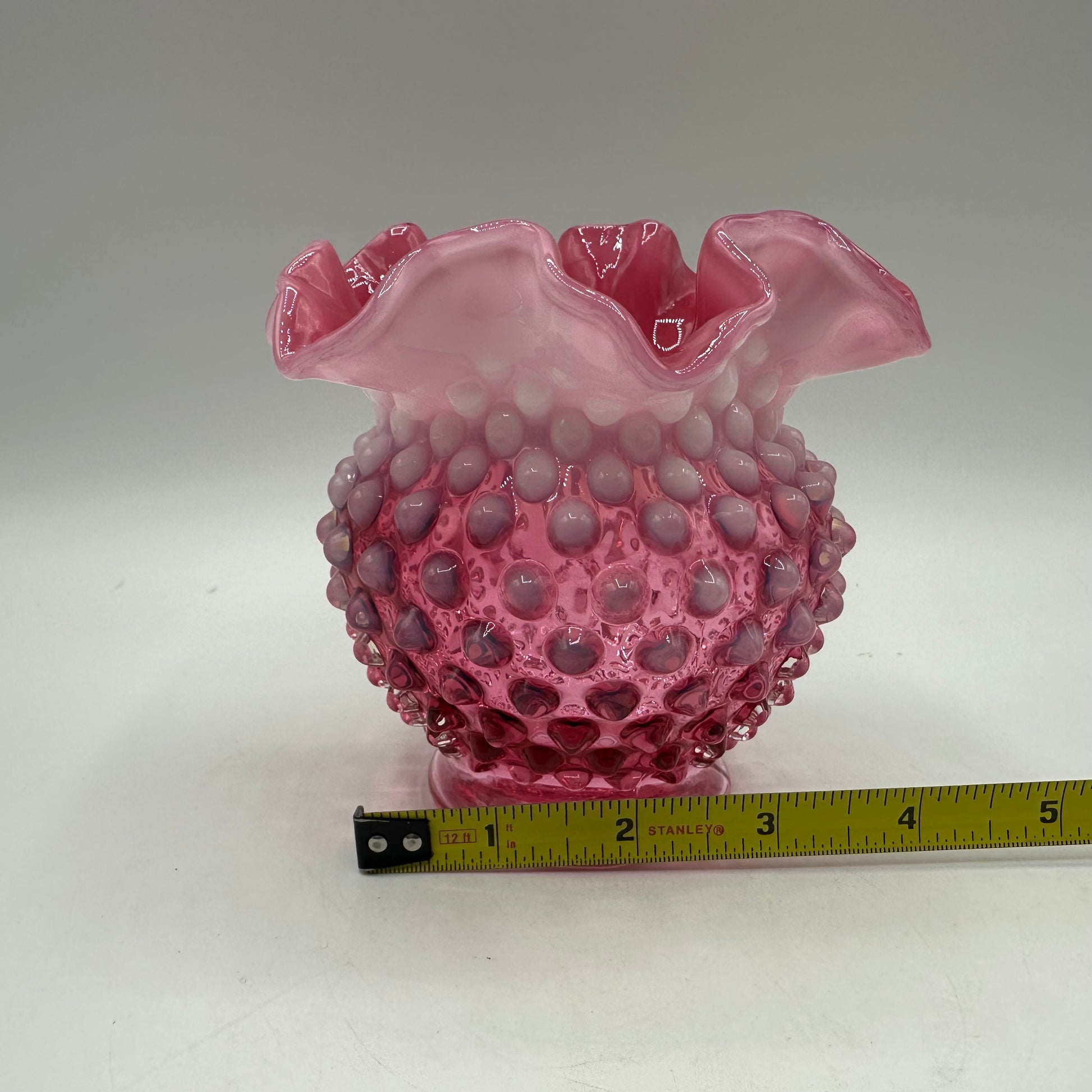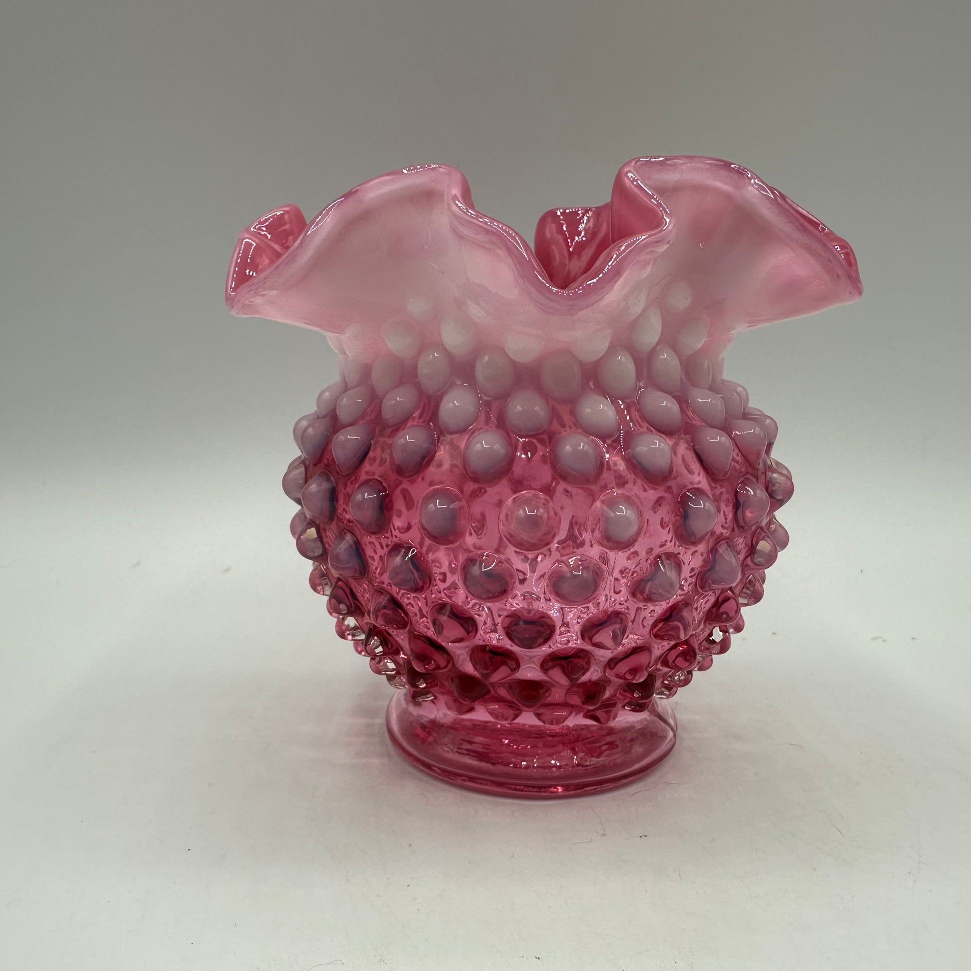 This beautiful vase from Fenton is crafted from exquisite cranberry opalescent hobnail glass. Measuring 4.25 inches in height, it boasts an elegant crimped design. The vase is in excellent vintage pre-owned condition, making it an ideal choice for collectors or as a decorative accent in any space.