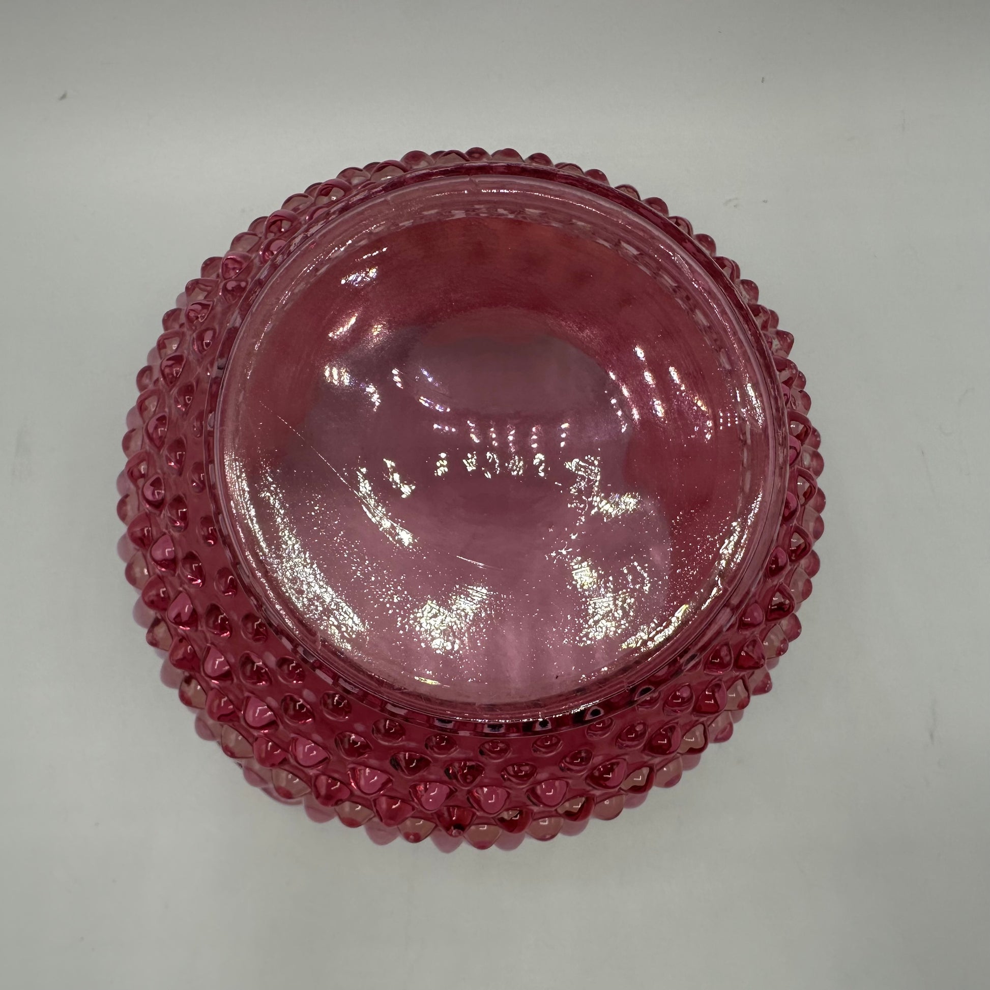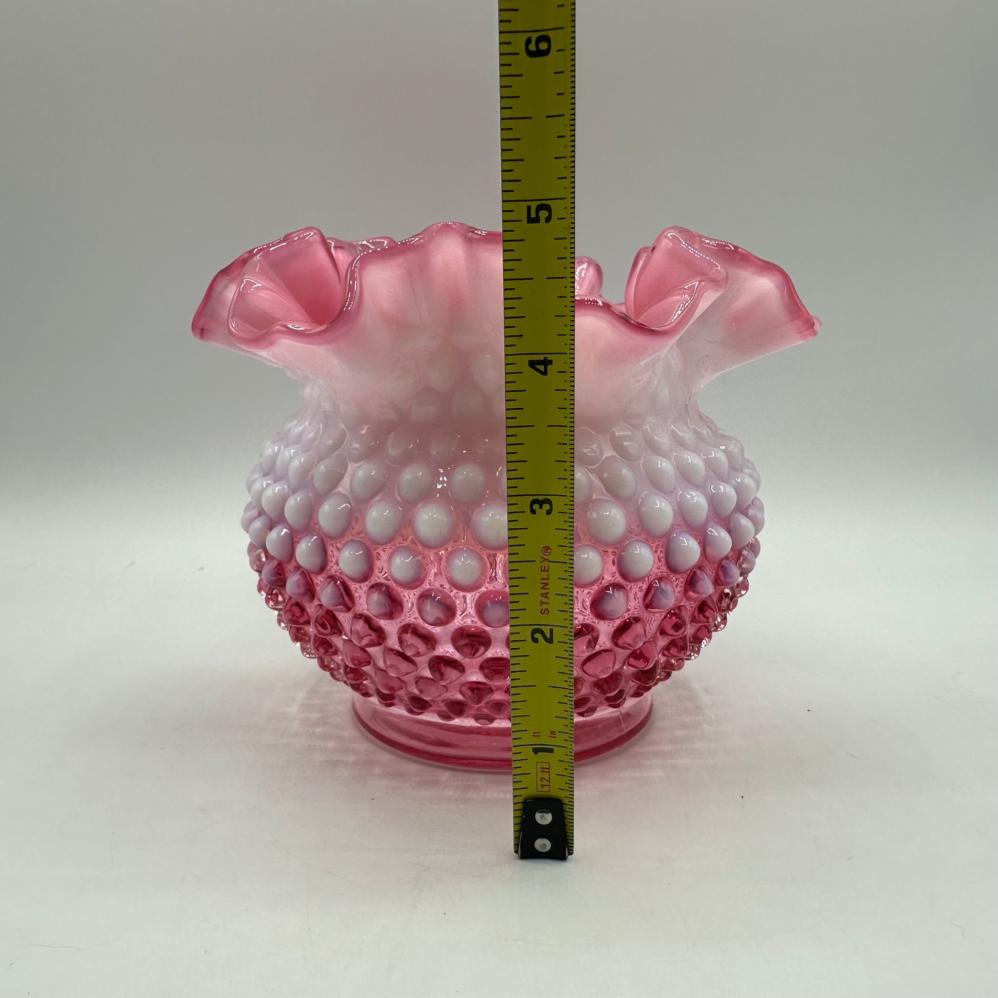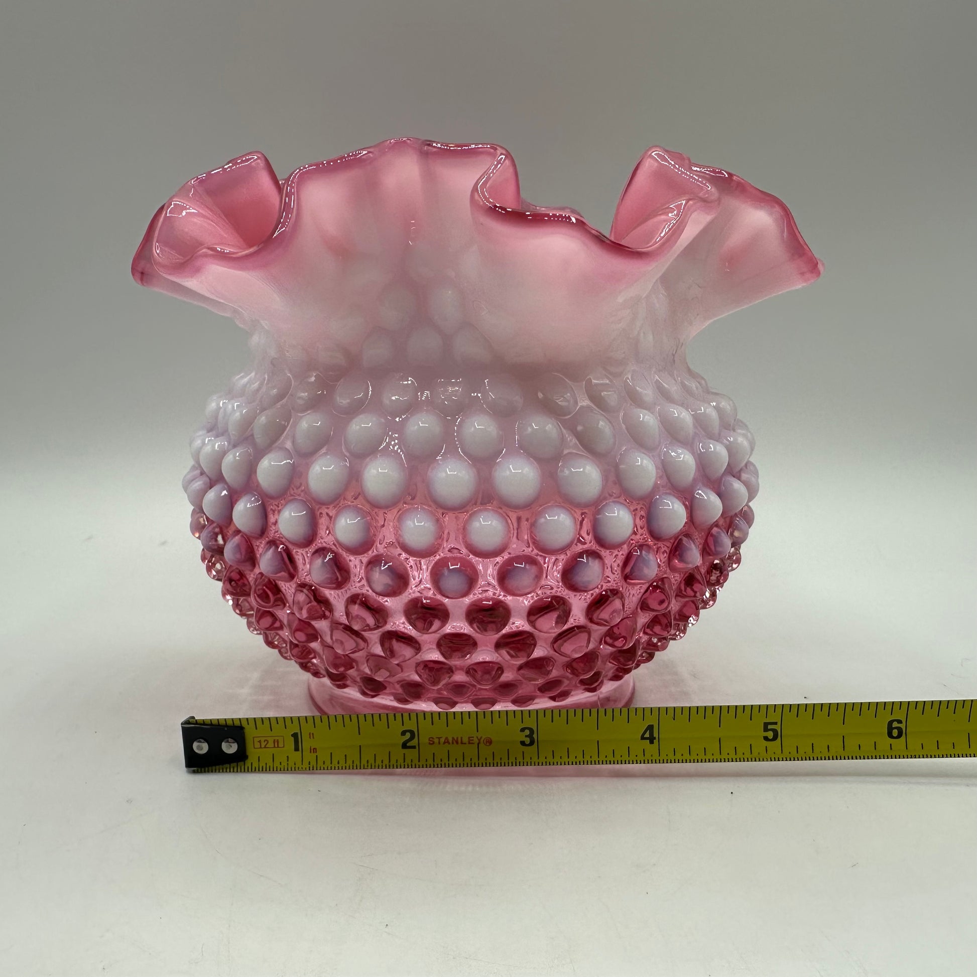 This Fenton vase is a stunning piece crafted from cranberry opalescent hobnail glass. It stands at 4.75 inches tall and features a beautifully designed double crimped rim. The vase is in excellent vintage pre-owned condition, making it a wonderful addition to any collection.