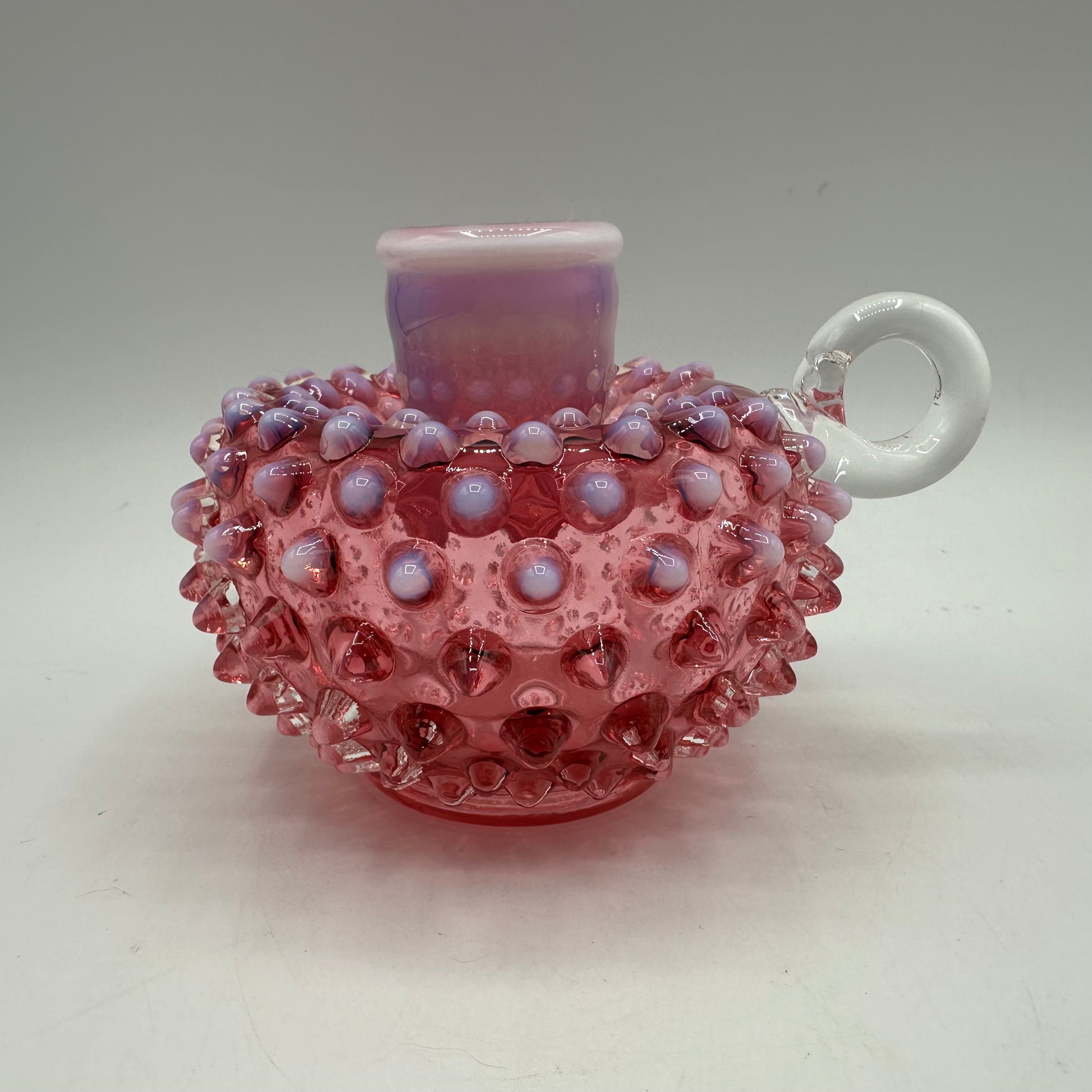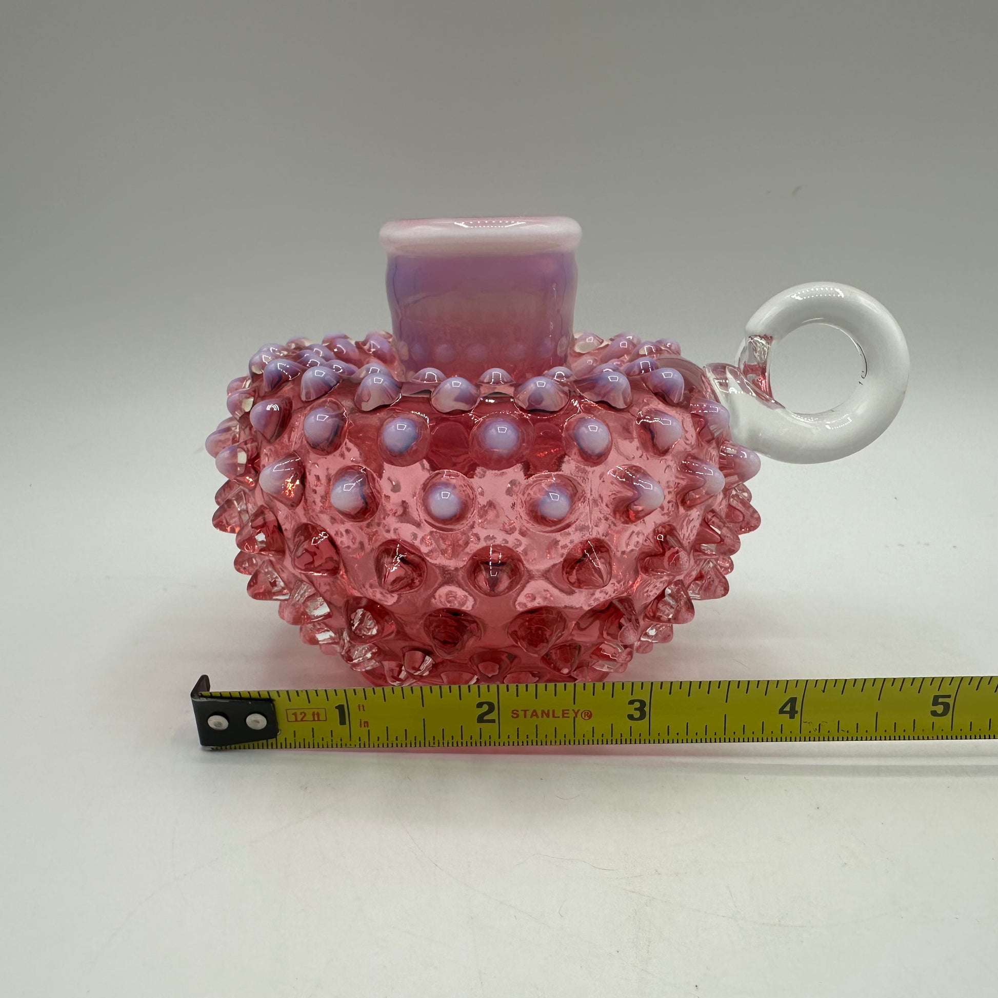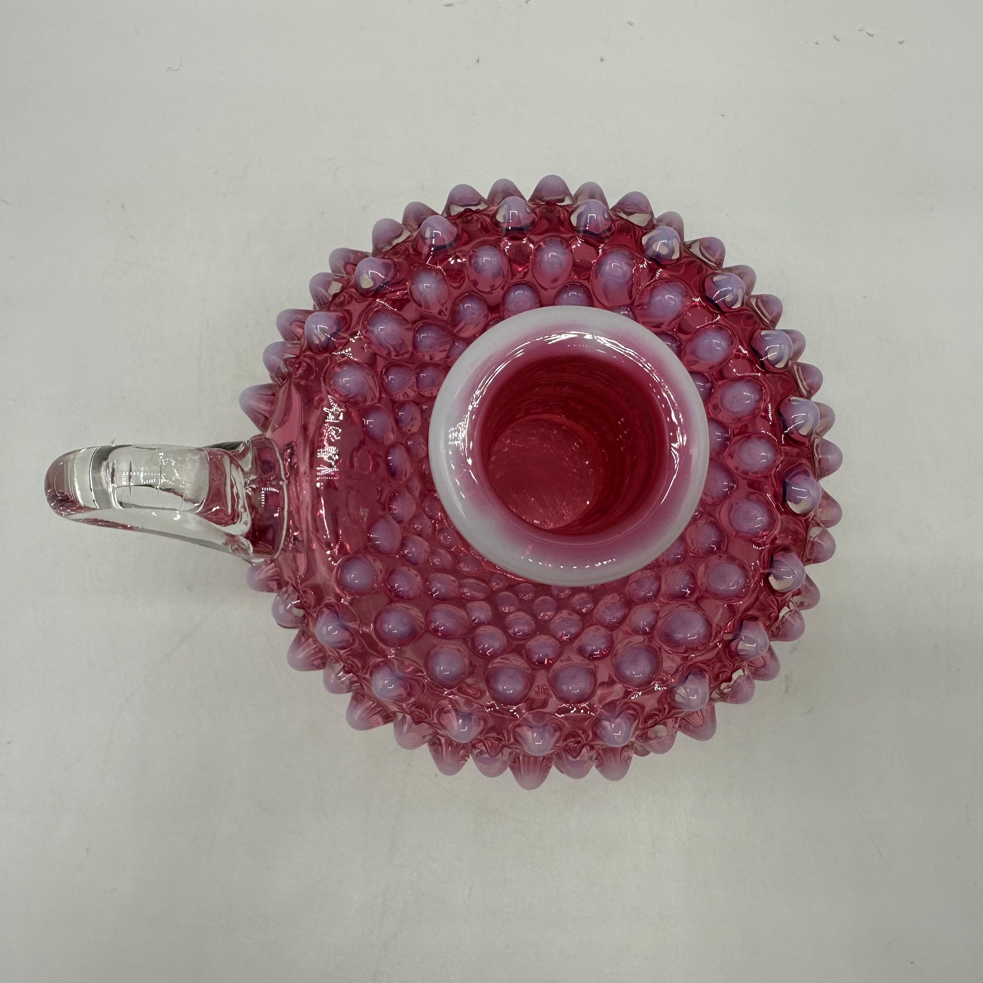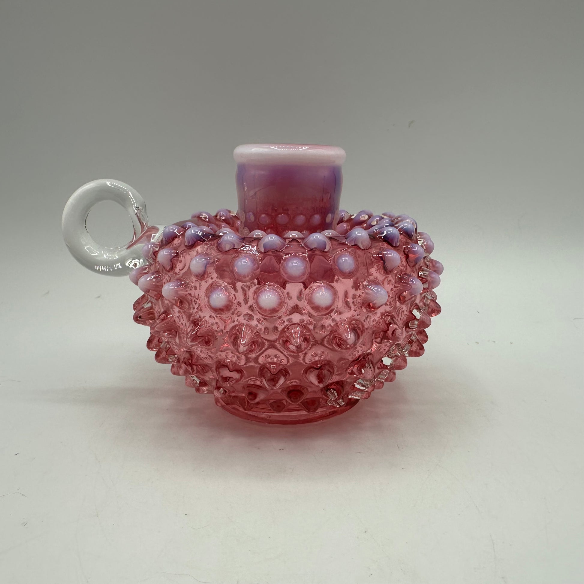 This exquisite tapered candle holder from Fenton showcases the iconic hobnail pattern. Made of cranberry opalescent glass, it features a clear handle for added elegance. The candle holder is in excellent vintage pre-owned condition, making it a perfect addition to any home décor.
