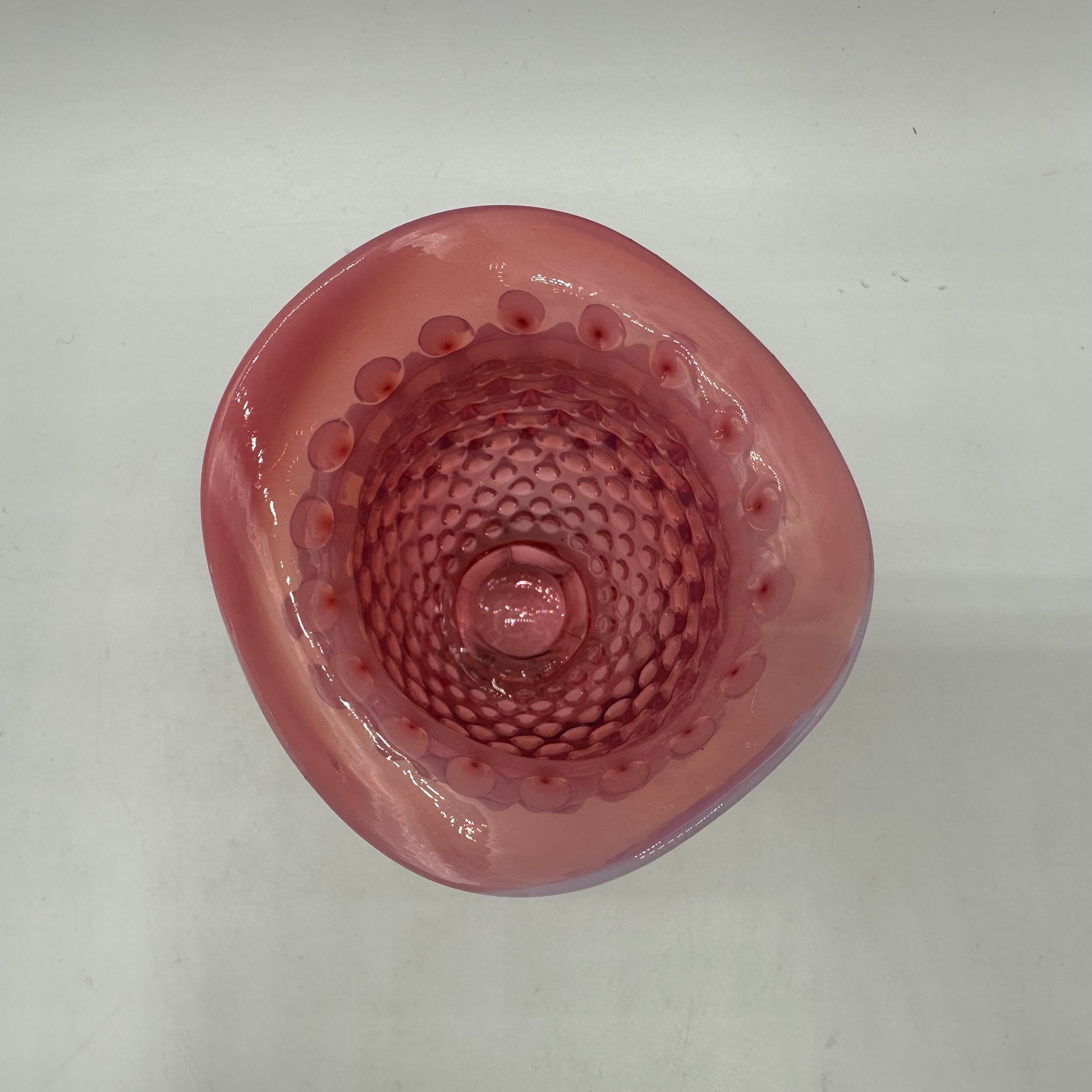 This elegant rimmed vase by Fenton showcases the distinctive hobnail pattern, crafted from exquisite cranberry opalescent glass. The piece is in excellent vintage pre-owned condition, making it a wonderful addition for collectors or anyone looking to enhance their home decor.
