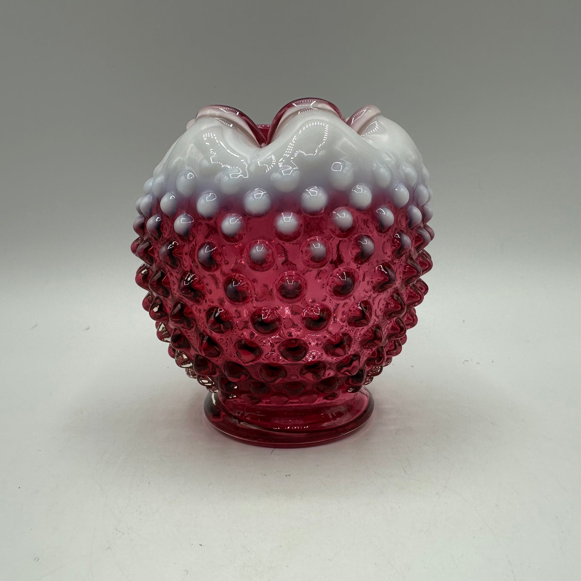 This exquisite rose bowl from Fenton showcases a stunning cranberry opalescent glass, in a distinctive hobnail pattern. The piece is in excellent vintage condition, making it a noteworthy addition for collectors or decorators alike.