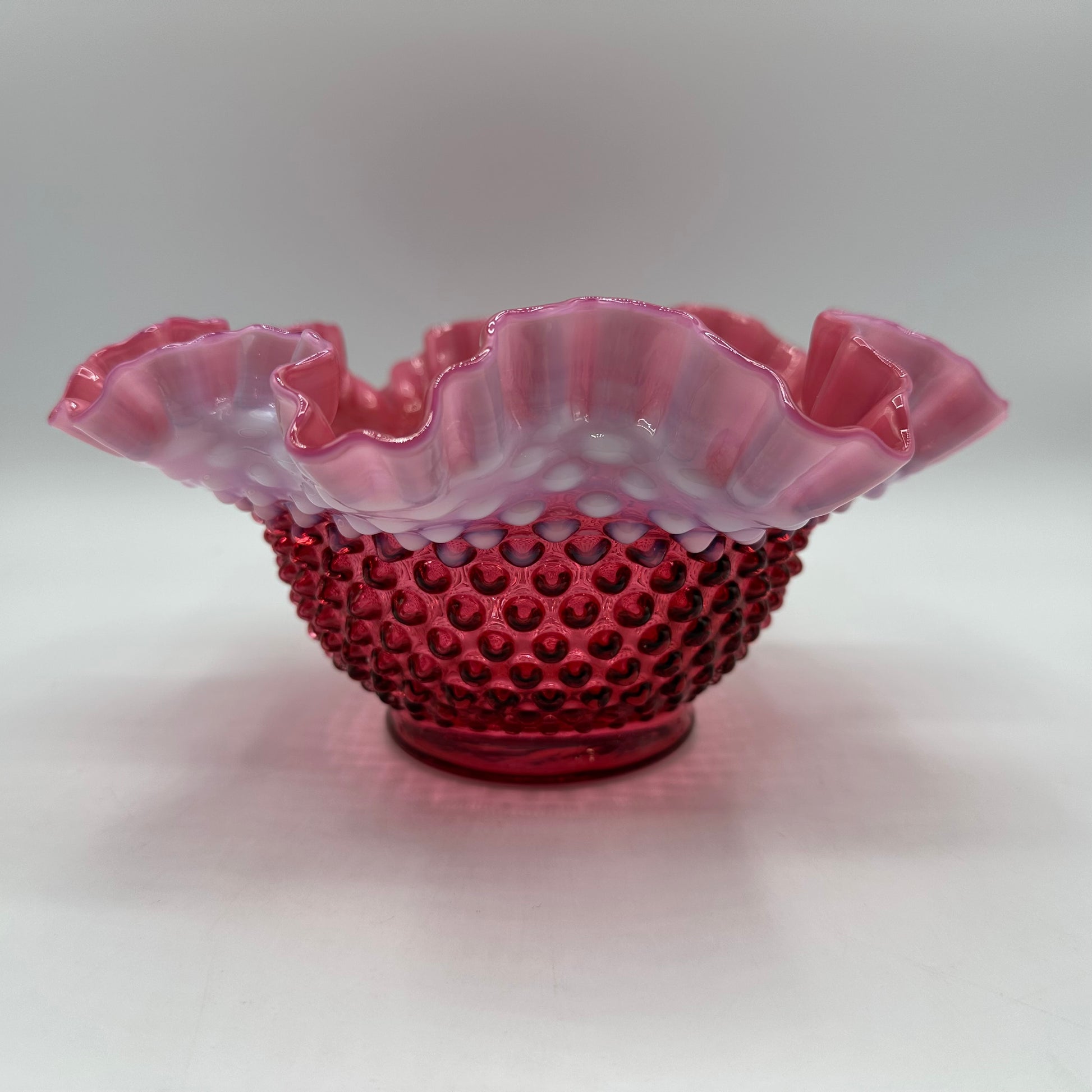 This is a stunning bowl from Fenton, crafted from cranberry opalescent glass and showcasing a charming hobnail pattern along with a ruffled edge. The piece is in excellent vintage pre-owned condition, making it a wonderful addition to any collection.