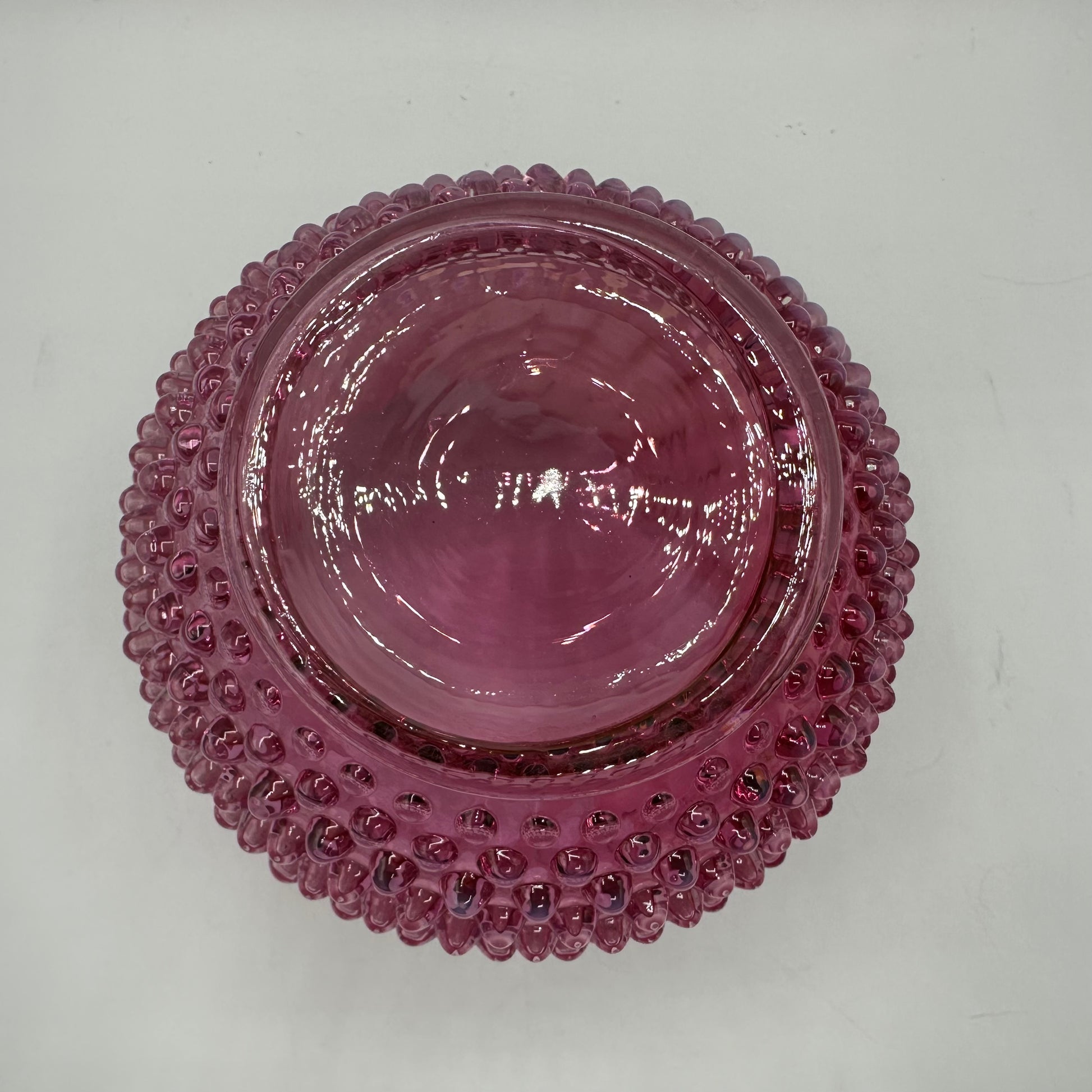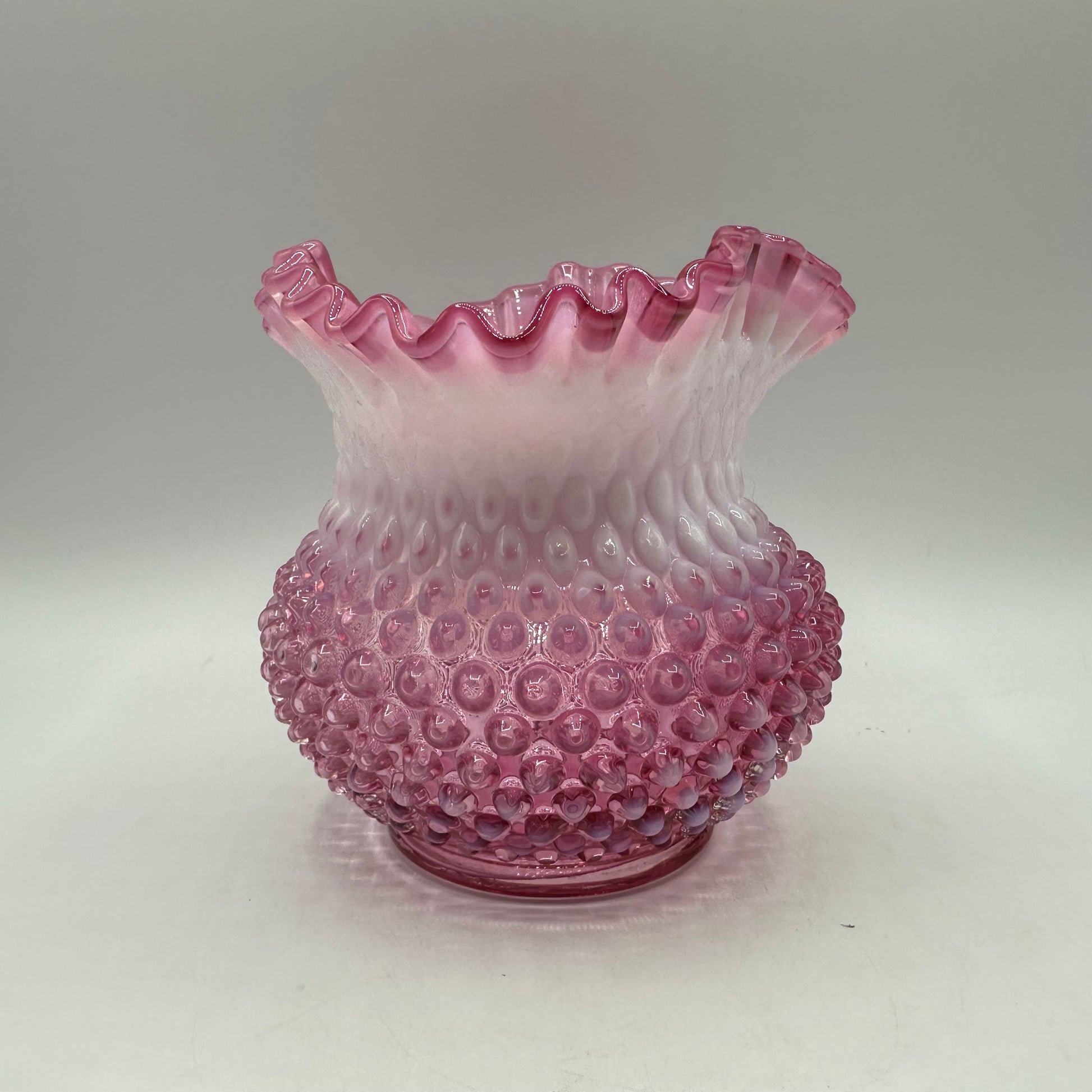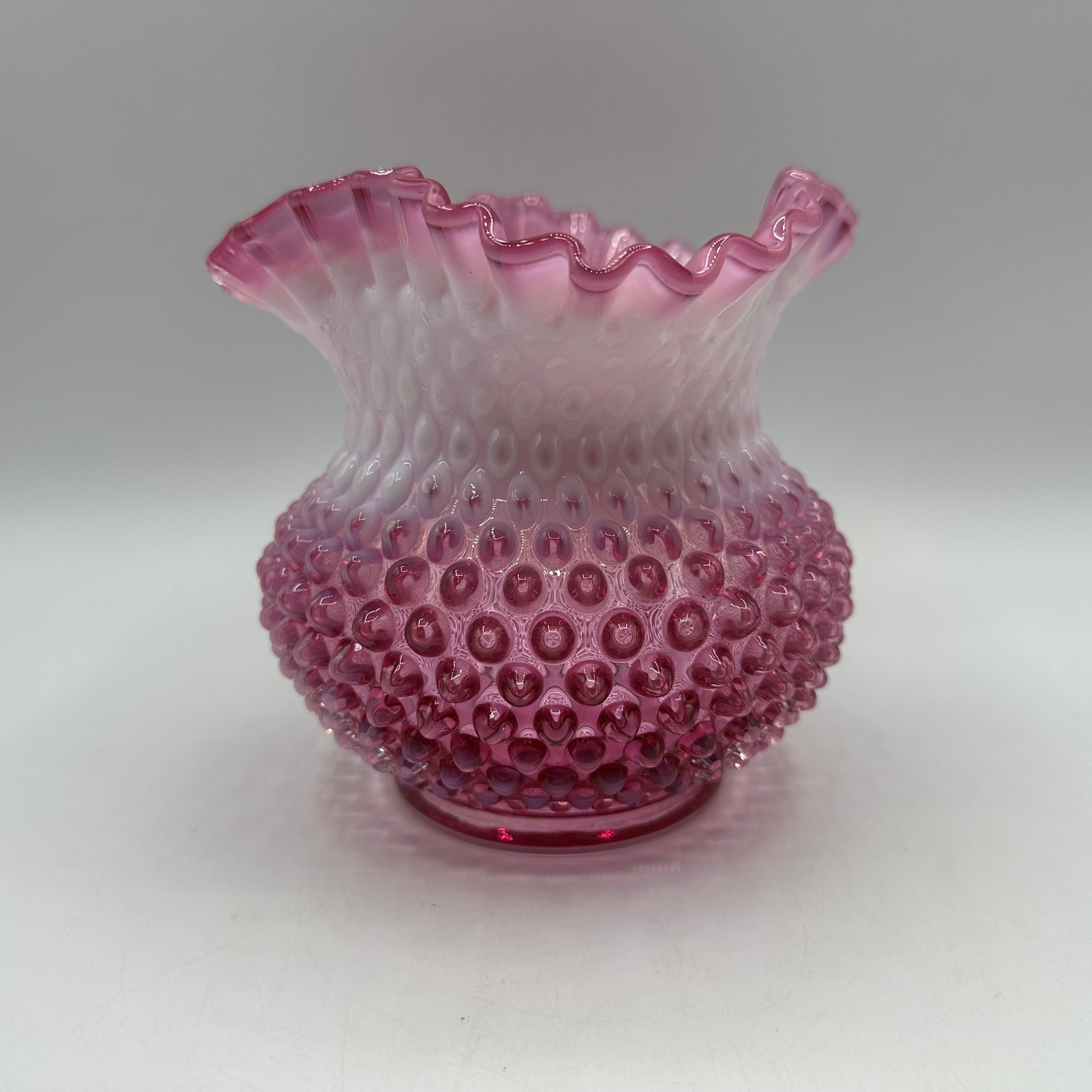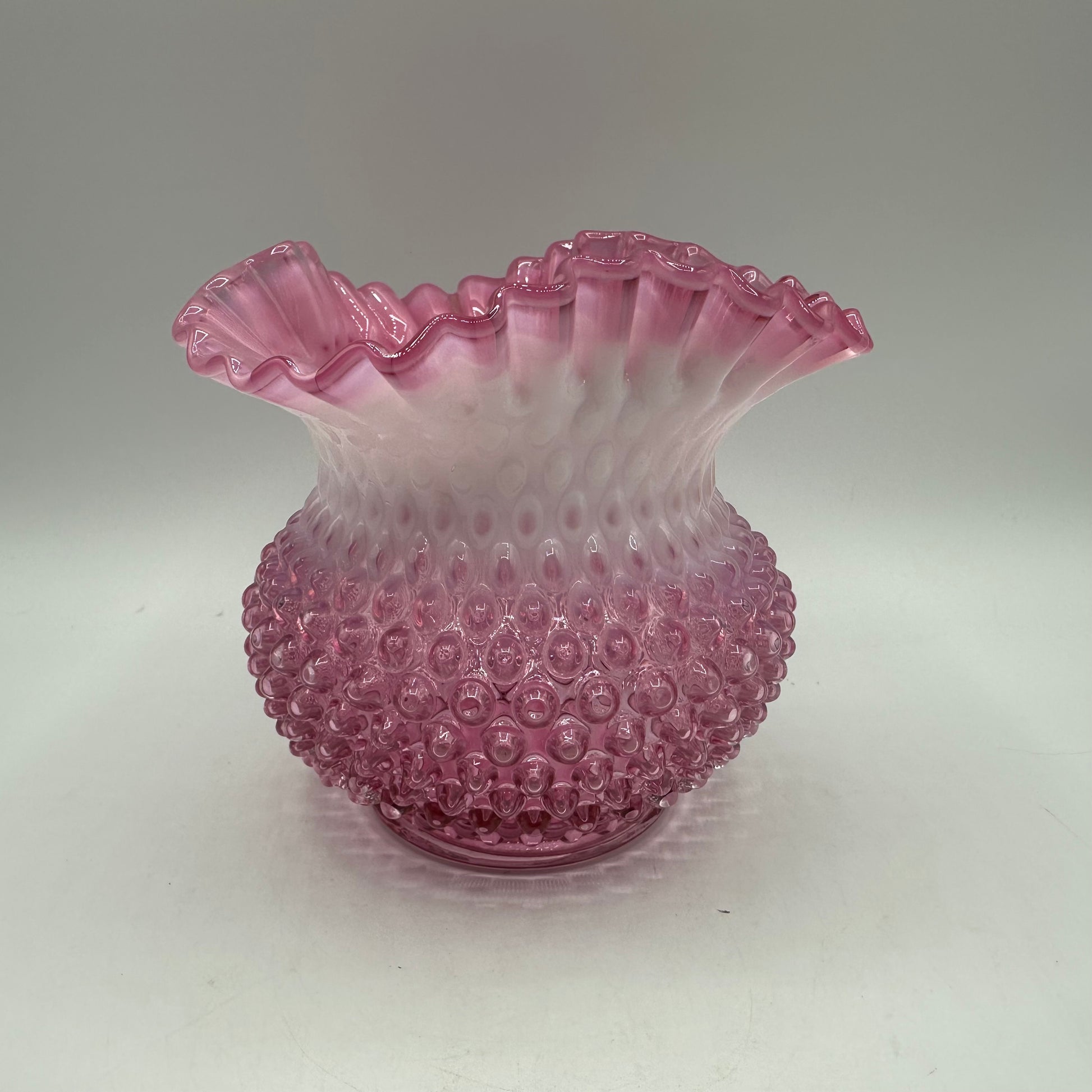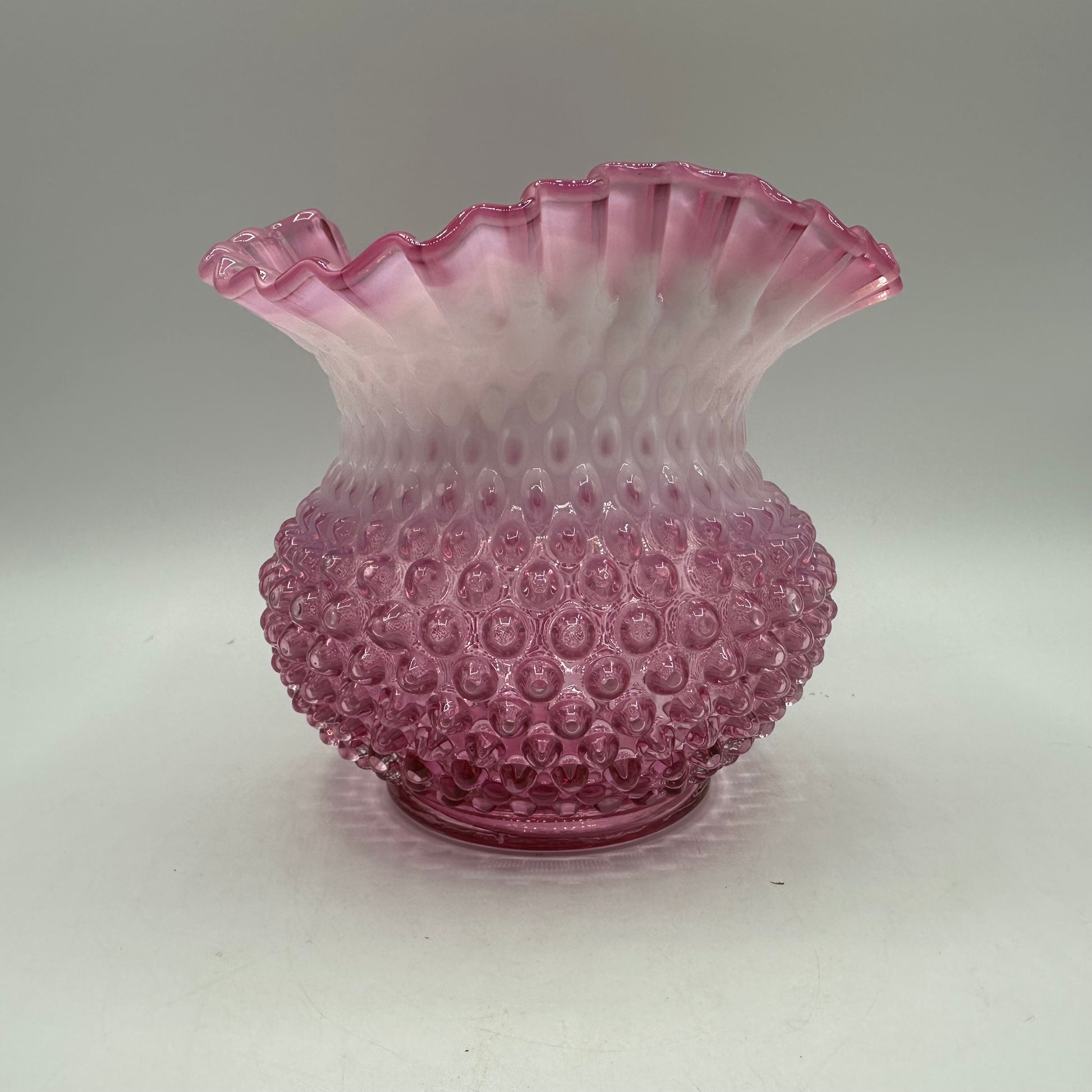 This exquisite vase from Fenton showcases a stunning cranberry opalescent glass, designed with an eye-catching hobnail pattern. It is in excellent vintage pre-owned condition, making it a remarkable piece for collectors and enthusiasts alike.