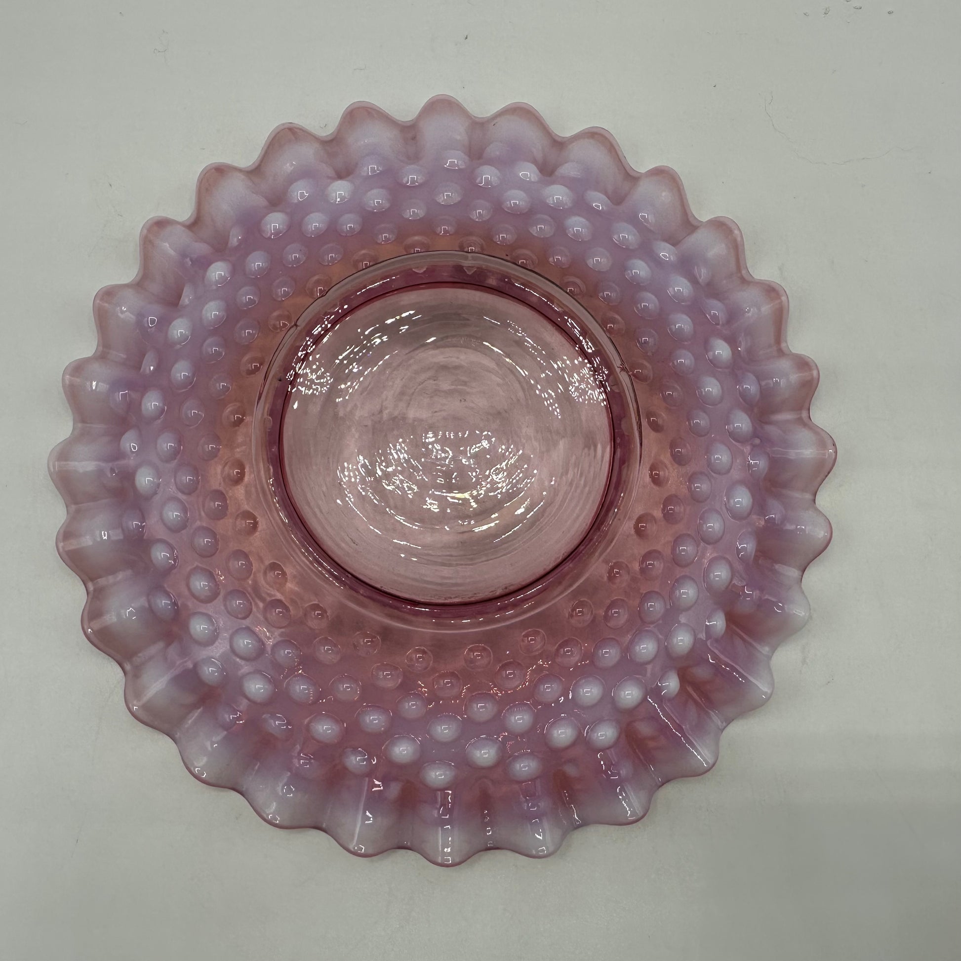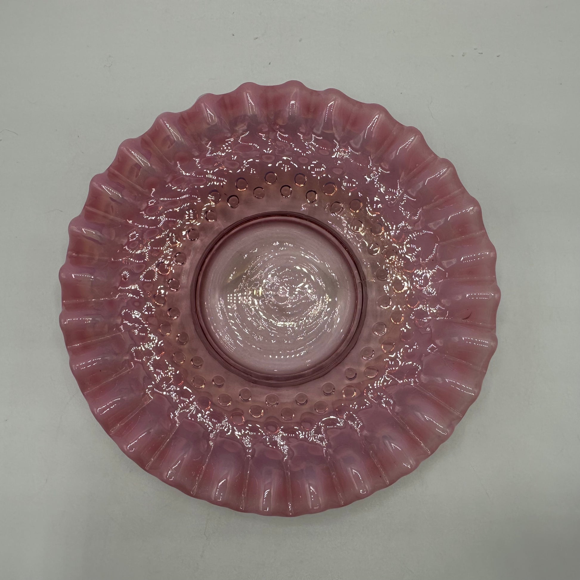 This underplate, crafted by Fenton, showcases a beautiful cranberry opalescent glass with a distinctive hobnail pattern. It is in excellent vintage pre-owned condition, making it a charming addition to any collection.