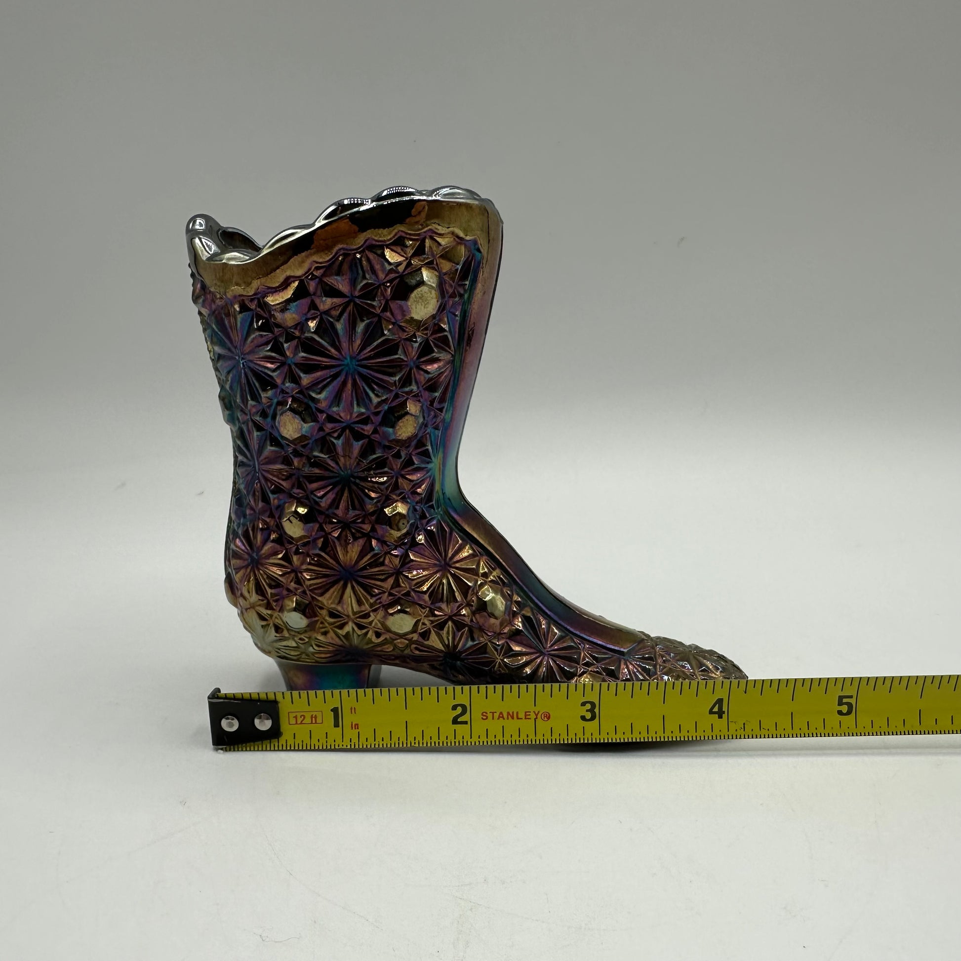 Introducing a charming boot figurine crafted by Fenton, showcasing the iconic Daisy and Button pattern in beautiful Iridescent Carnival glass. This piece is in excellent vintage pre-owned condition, making it a great addition to any collection.