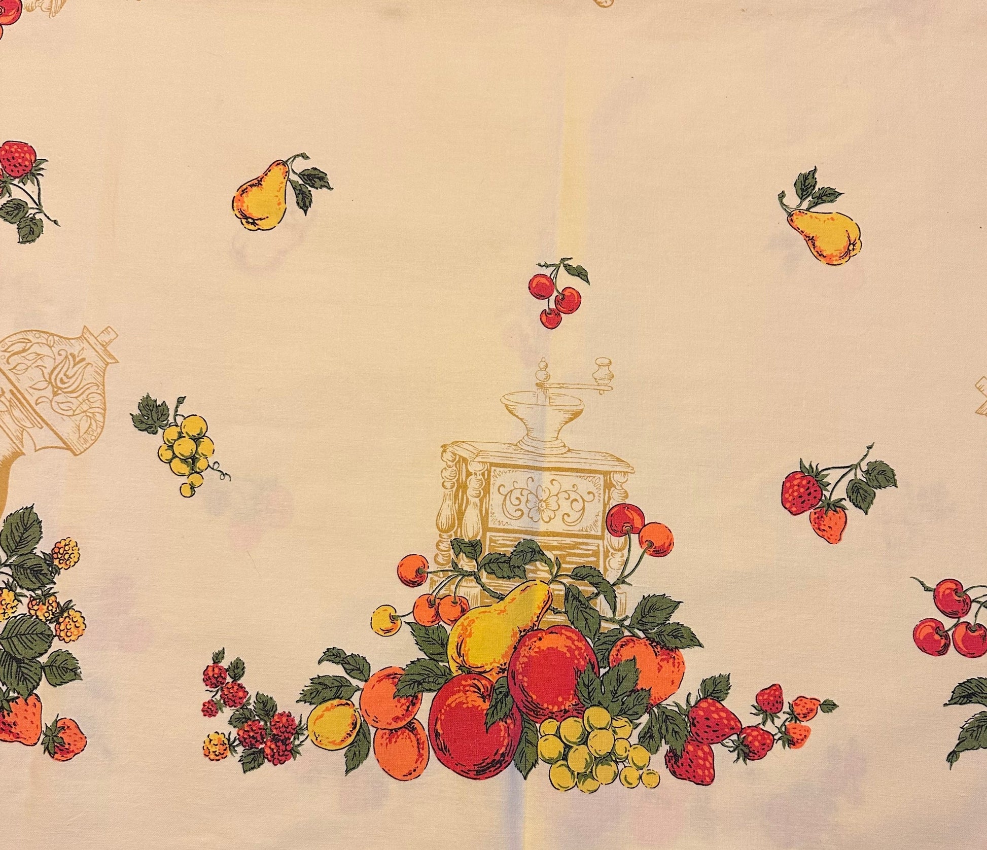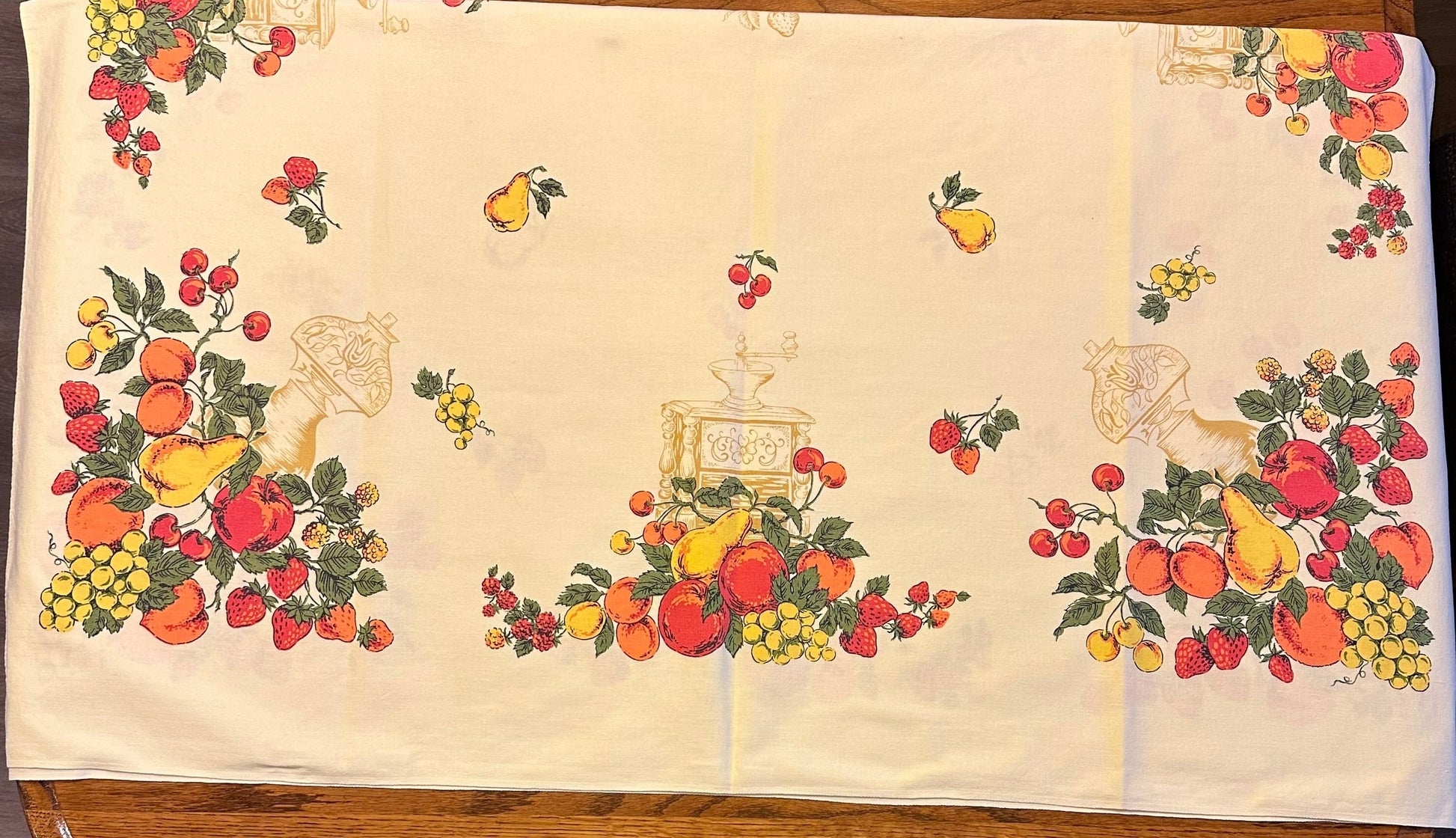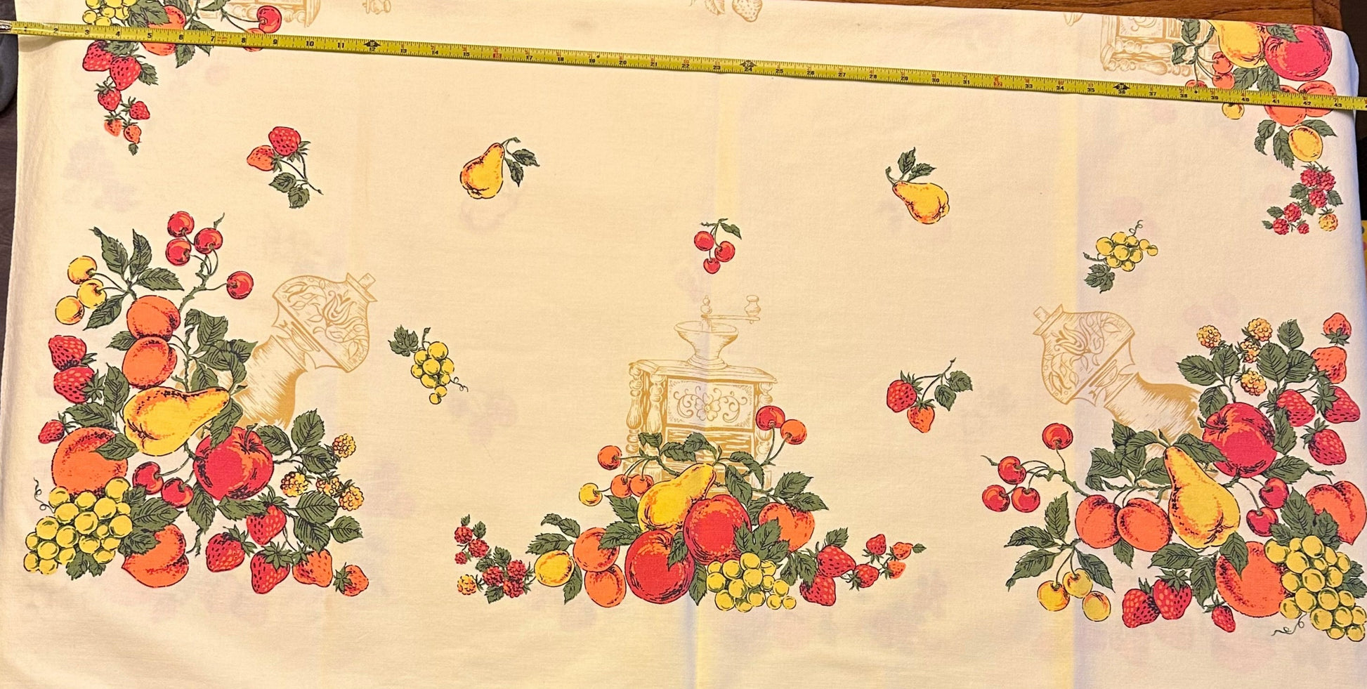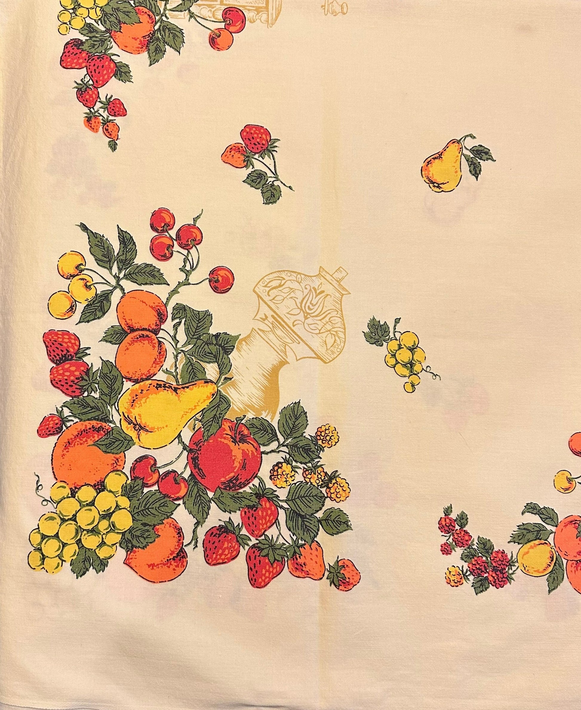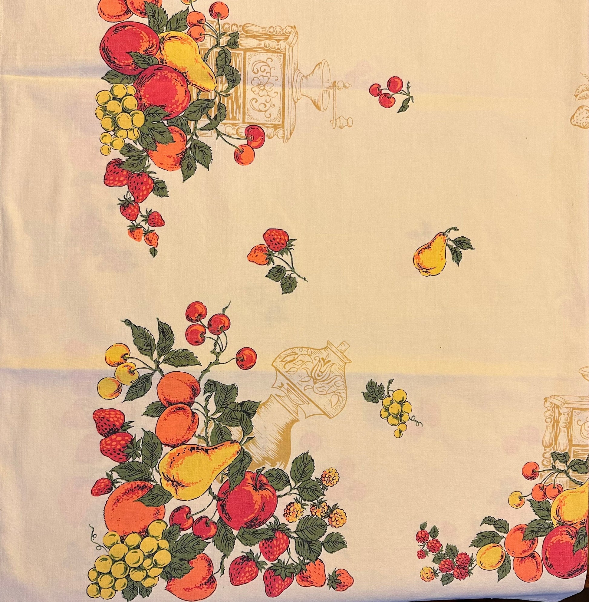A beautiful light yellow vintage tablecloth featuring a fruit pattern. The pattern covers the outer border with smaller fruit pieces progressing towards the center. The tablecloth is in excellent vintage used condition and measures 57" X 78".