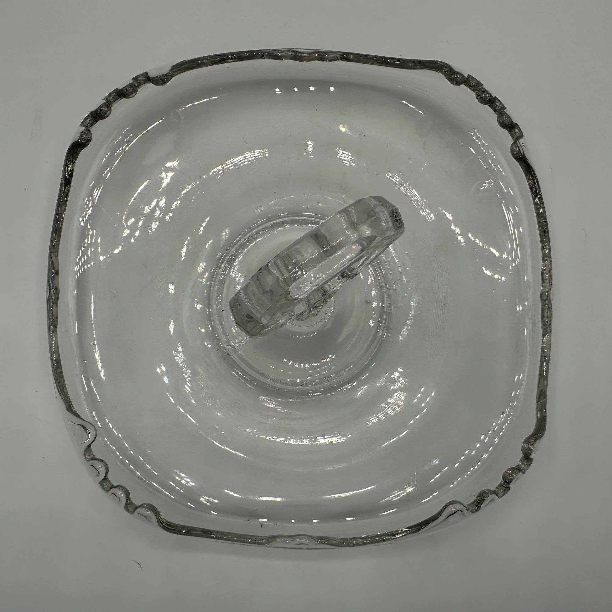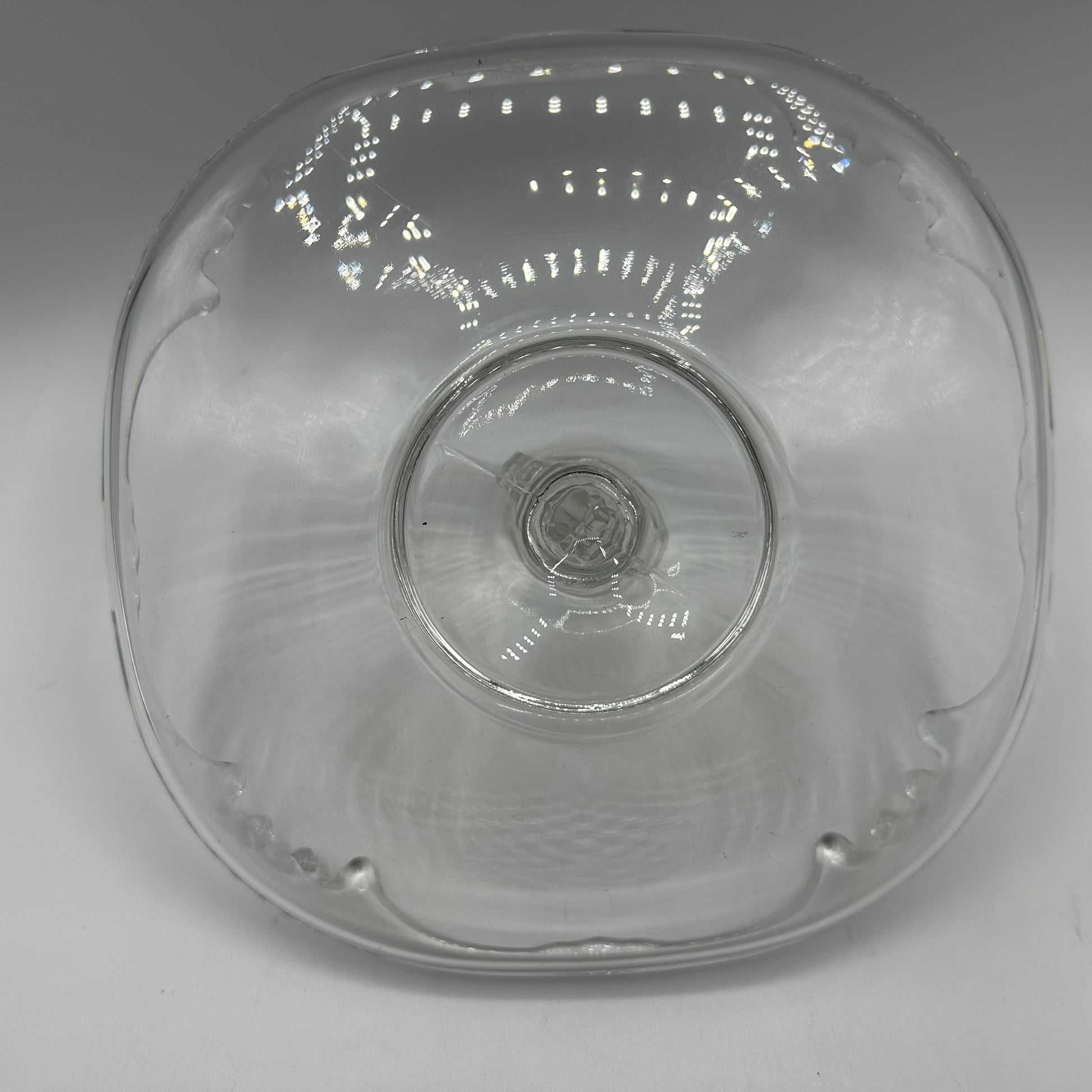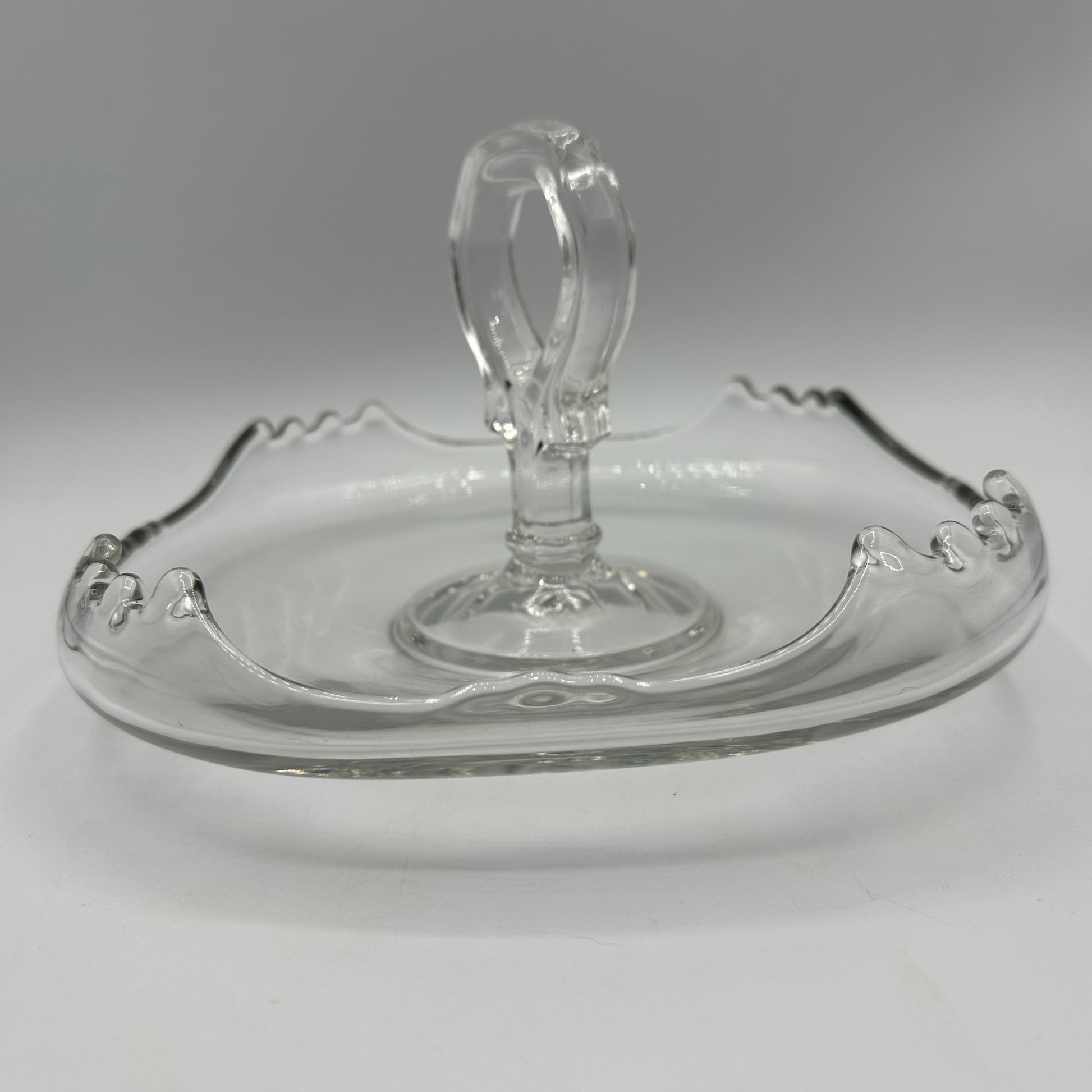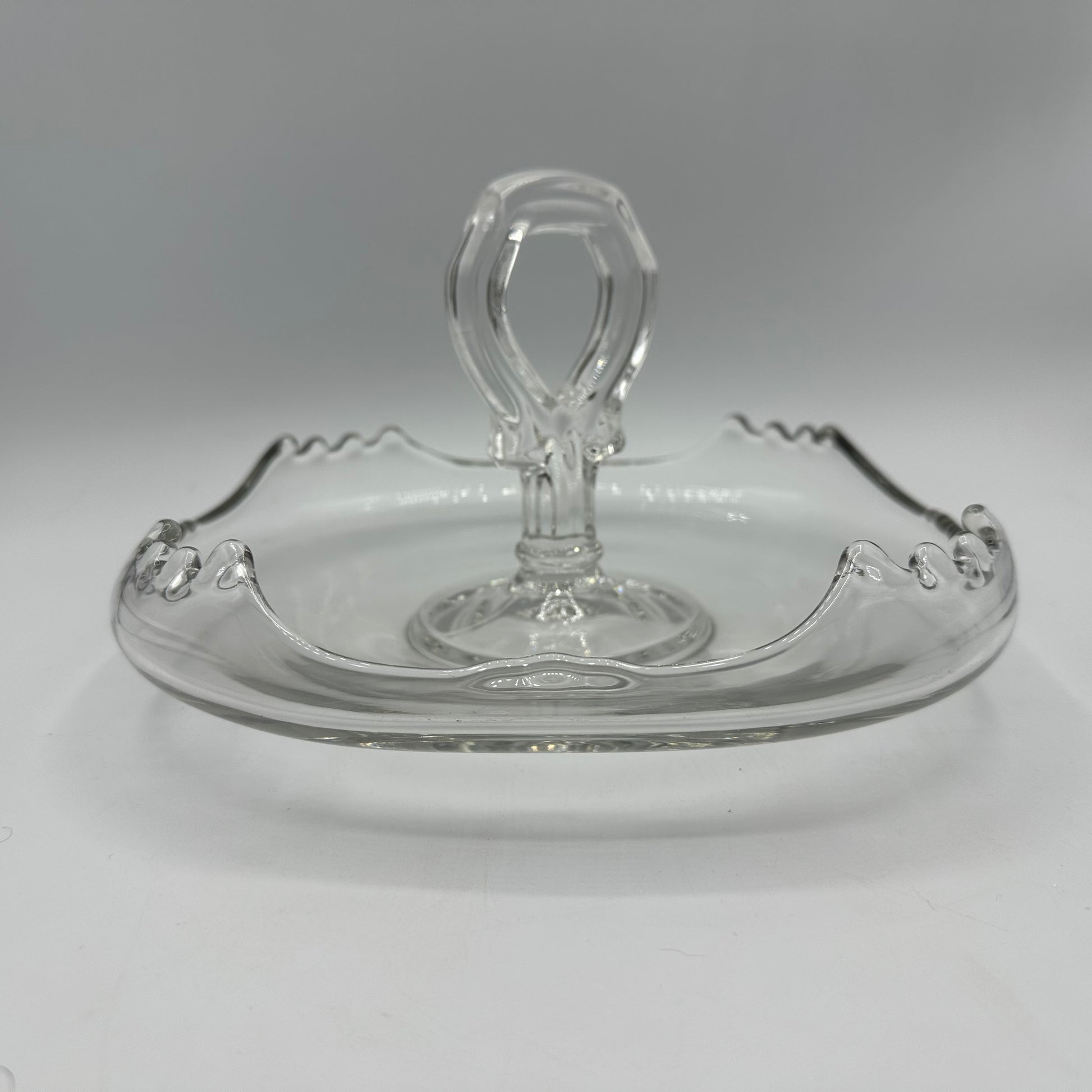 A beautiful clear tidbit tray with curved edges. The tray measures about 9" across and is in excellent vintage used condition.
