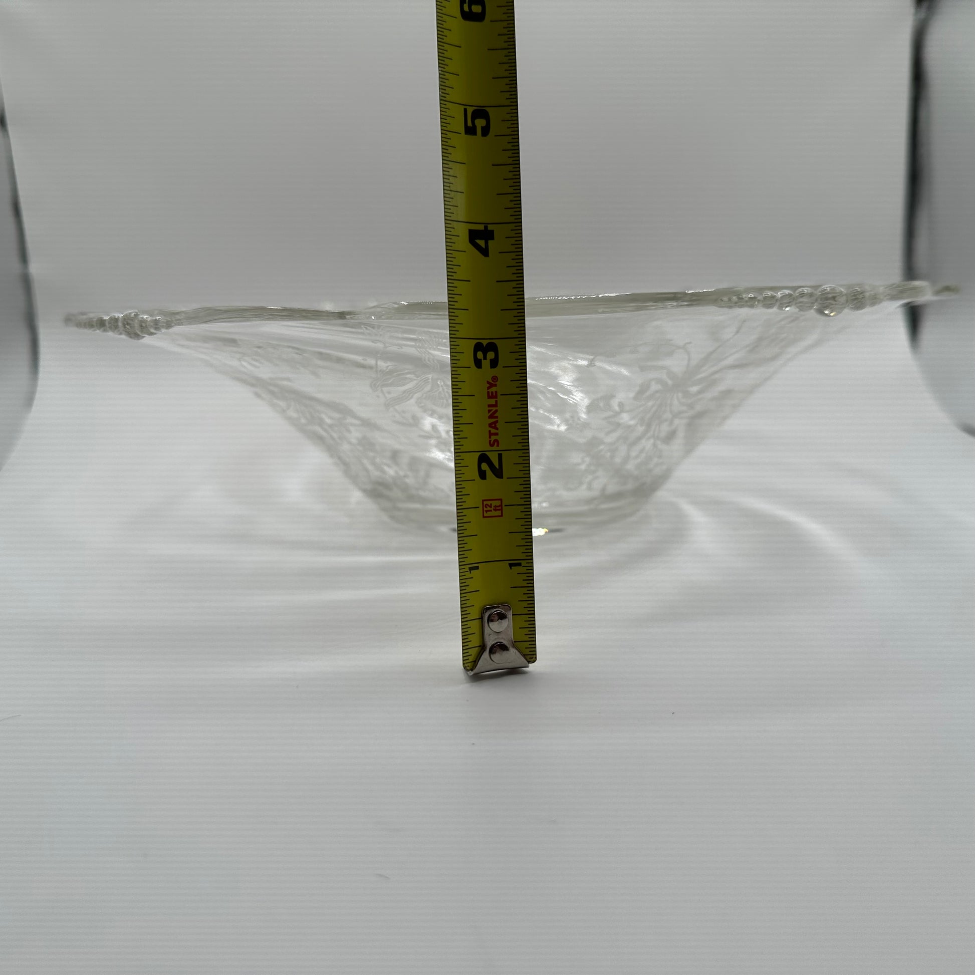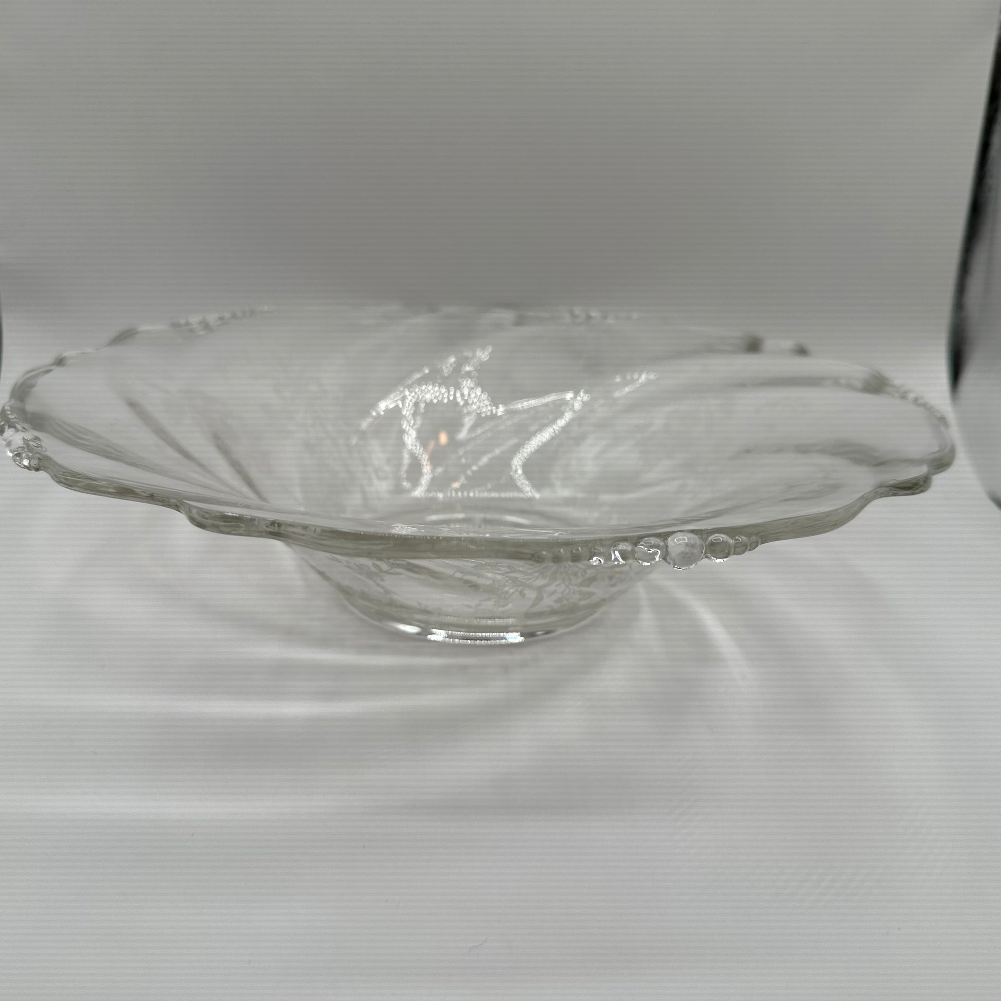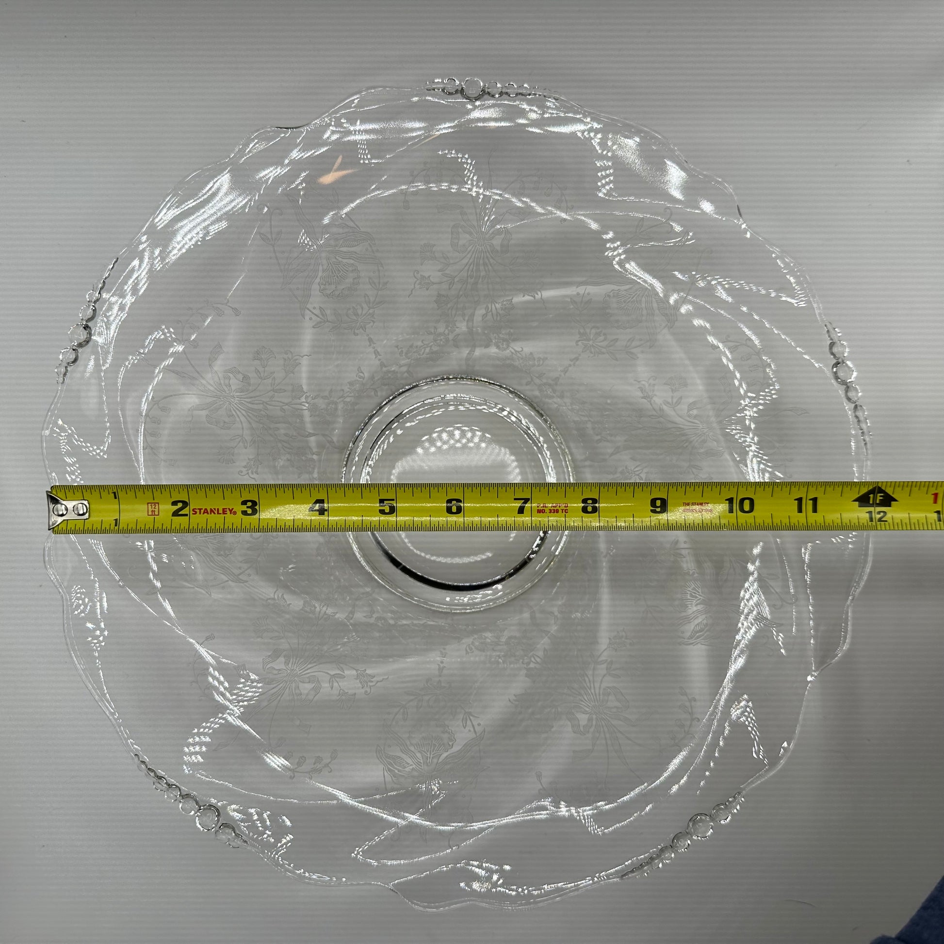 This stunning bowl from Heisey Glass showcases the elegant Orchid pattern, measuring 12.5 inches in diameter. It is in excellent pre-owned condition, reflecting its vintage charm and quality craftsmanship.