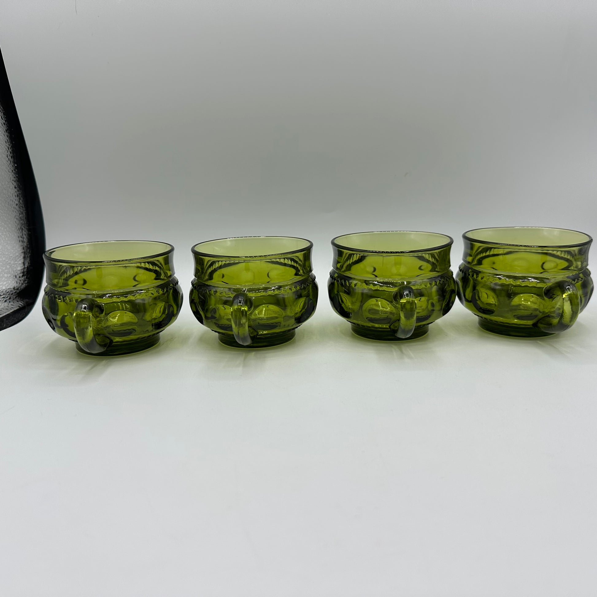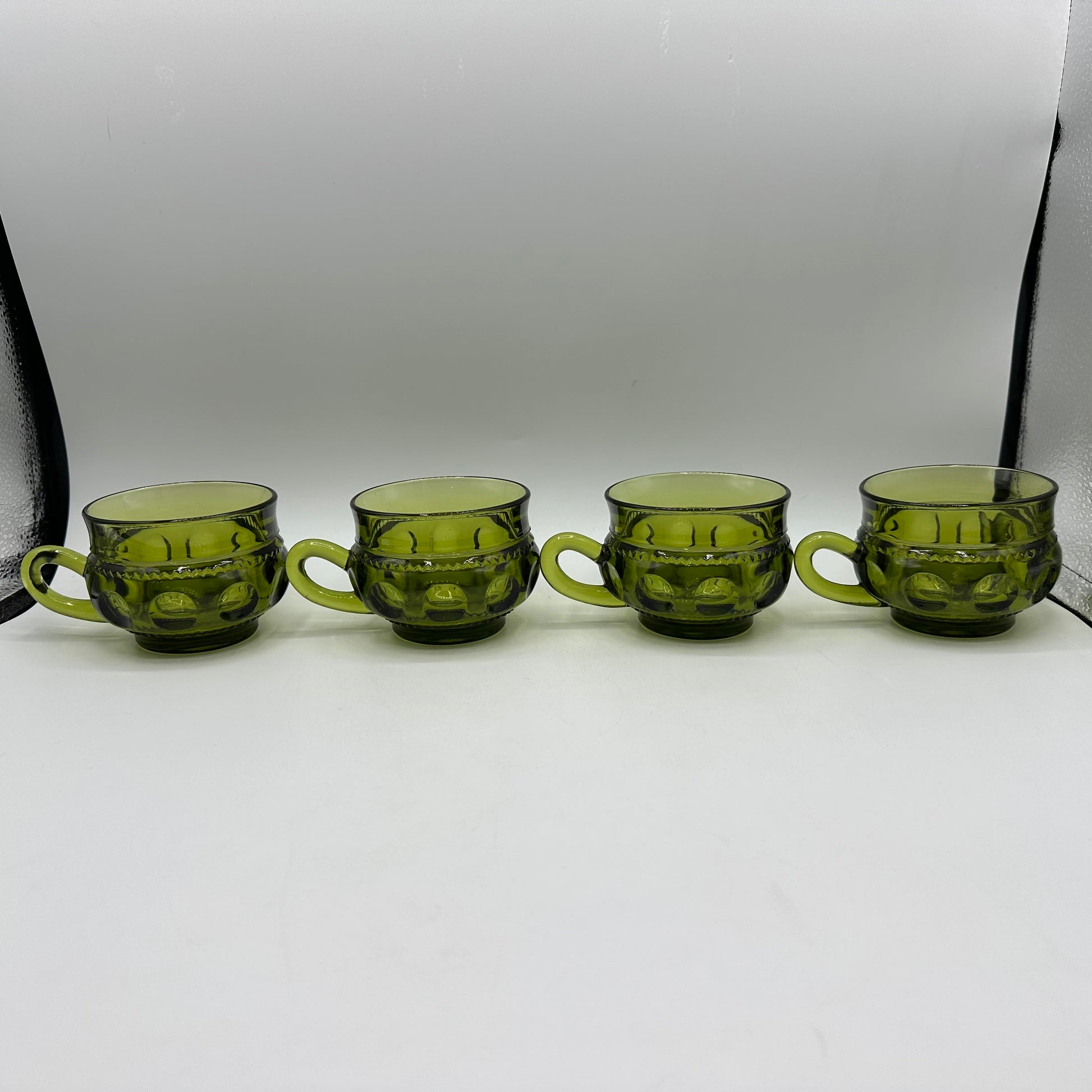 This set includes four snack plates along with a cup, crafted by Indiana Glass. Each piece showcases the Kings Crown Thumbprint design in a beautiful Avocado green color. The items are in excellent vintage pre-owned condition, making them a lovely addition to any collection.