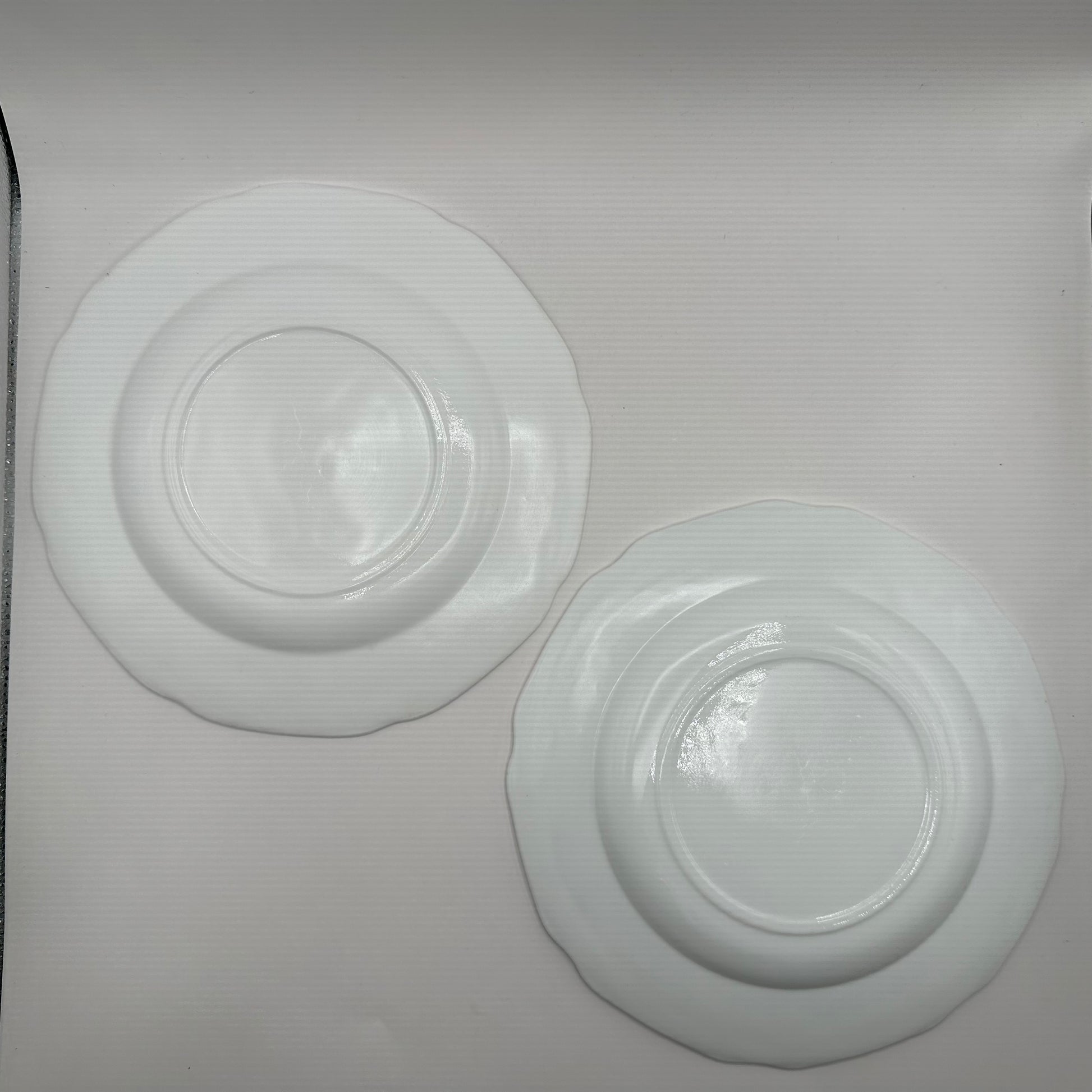 This is a beautiful set of two milk glass plates from Indiana Glass, showcasing the charming Colony Harvest pattern. The plates have some minor scratching from past usage.