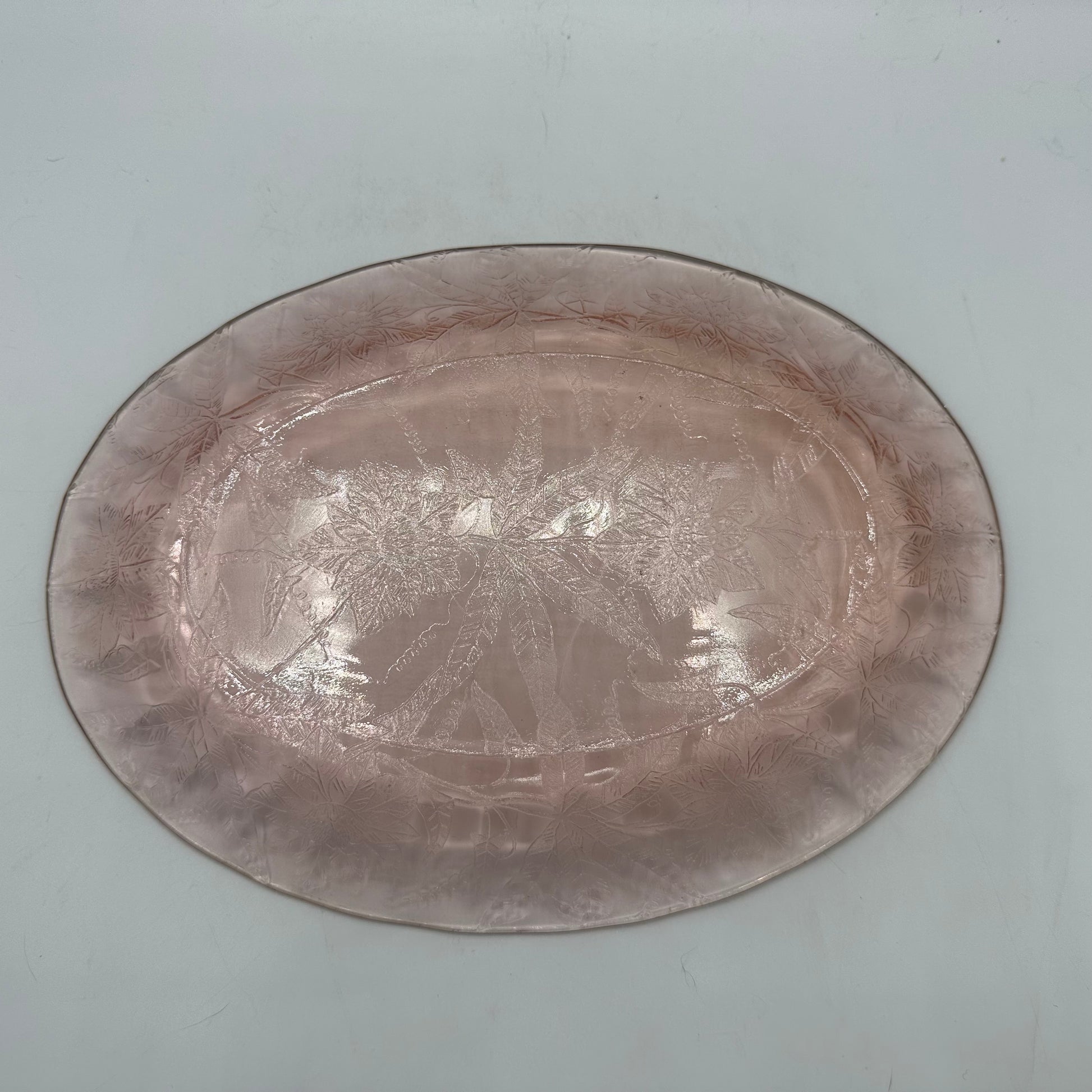 A wonderful depression glass platter from Jeannette Glass. It features the floral poinsettia pattern in pink measuring 10" wide. The platter is in excellent vintage used condition.