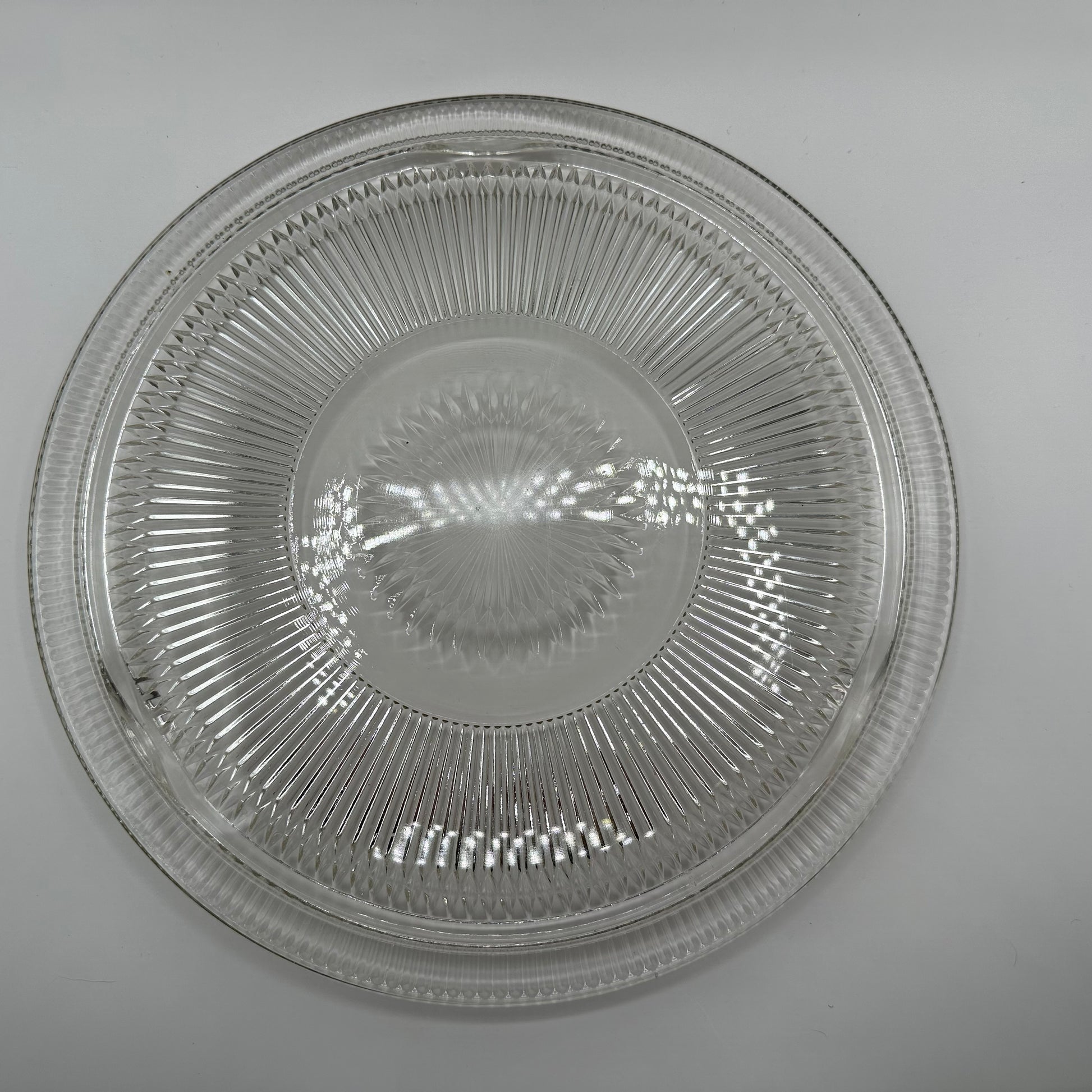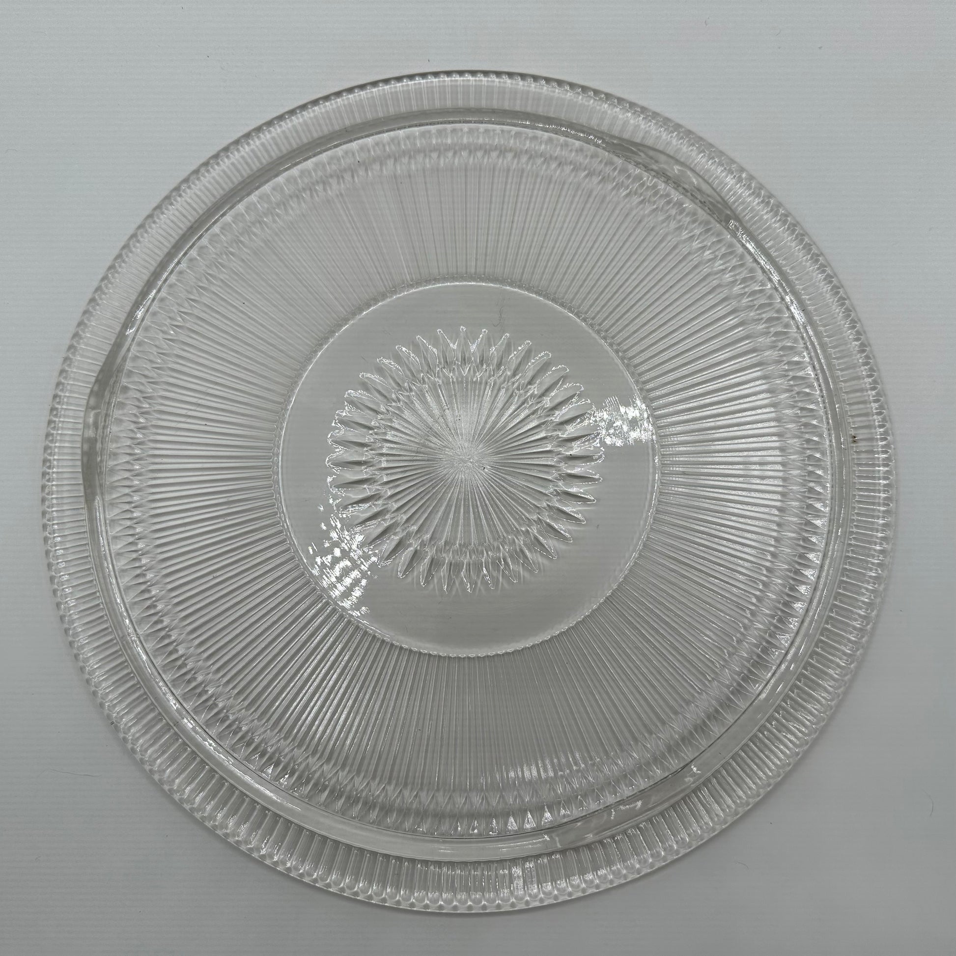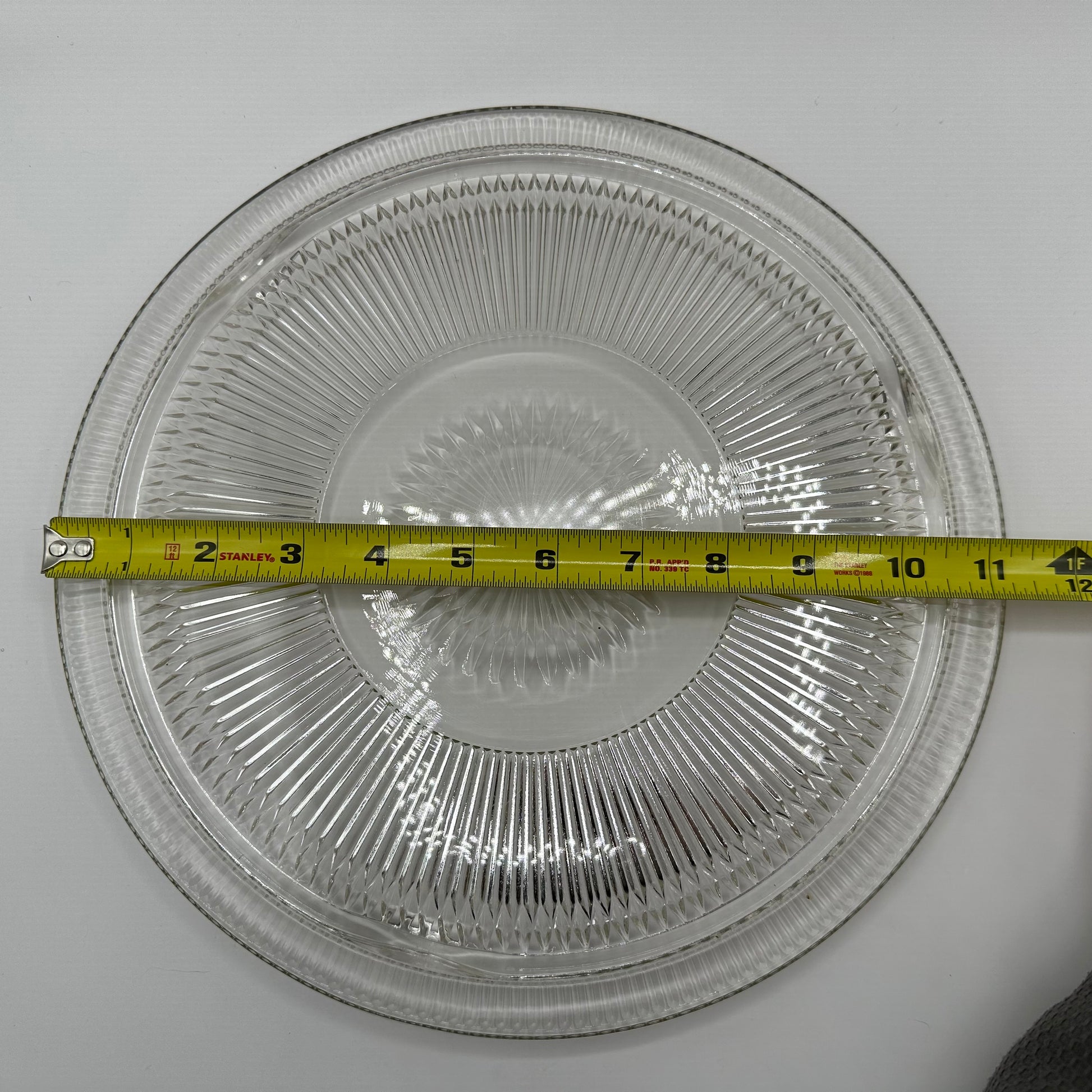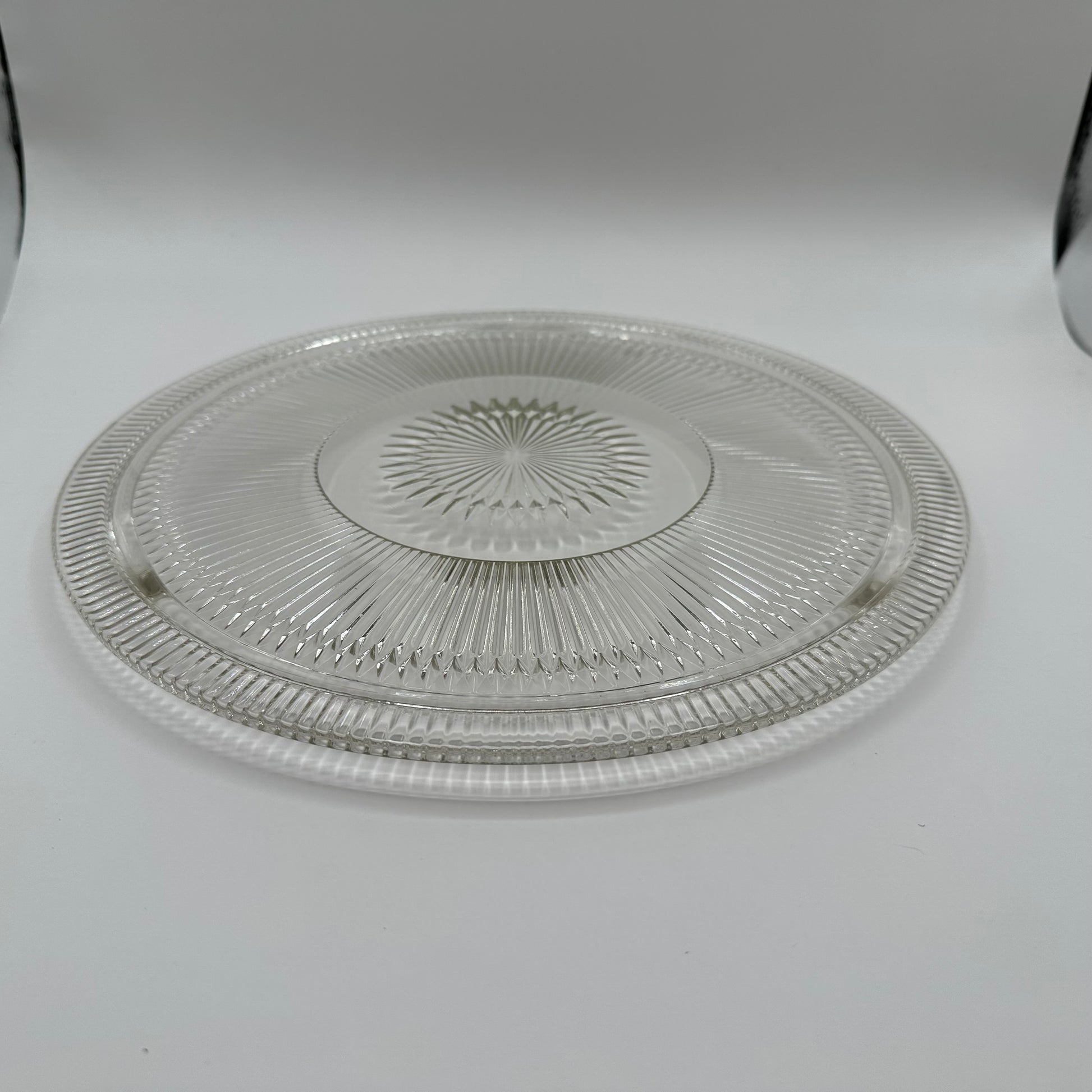 Discover this stunning cake plate from Jeannette Glass, showcasing the elegant Anniversary pattern on clear glass. With a generous diameter of about 11 inches, it's perfect for serving your favorite desserts. This exquisite piece is in excellent vintage pre-owned condition, making it a charming addition to any collection.