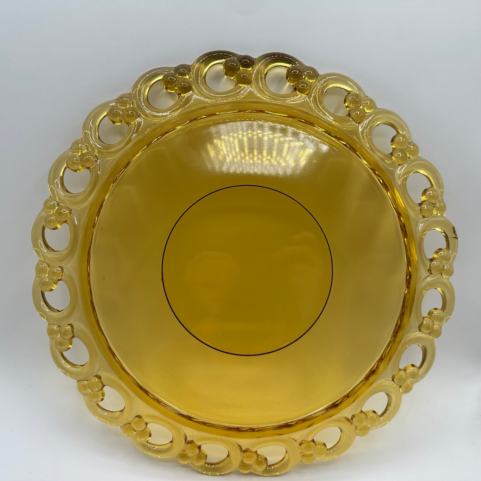 Discover the charm of this exquisite round platter by Josef Inwald. Adorned with a stunning lace pattern in warm amber glass, this piece measures approximately 12" in diameter and is in excellent vintage pre-owned condition. It’s a perfect addition to elevate your table setting!