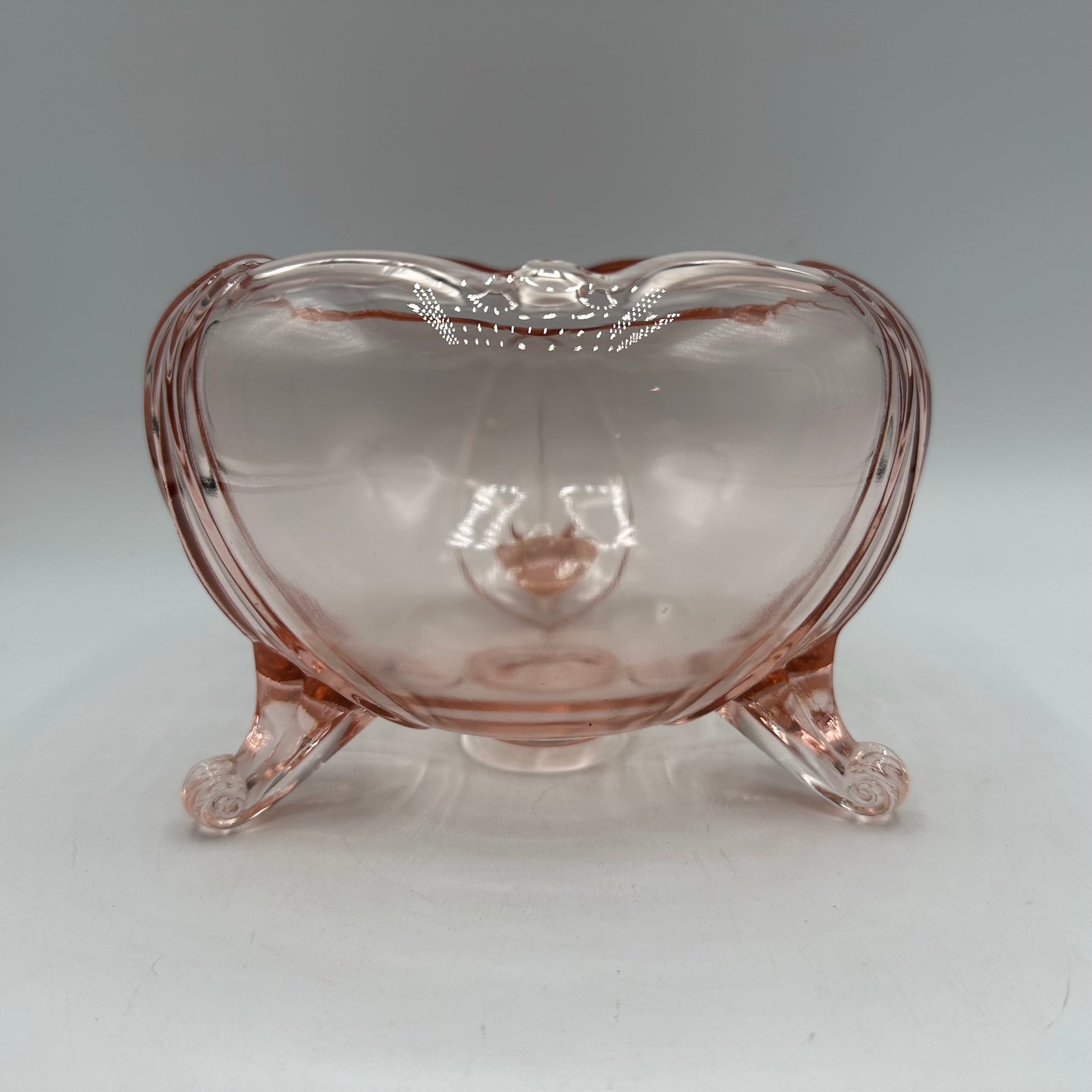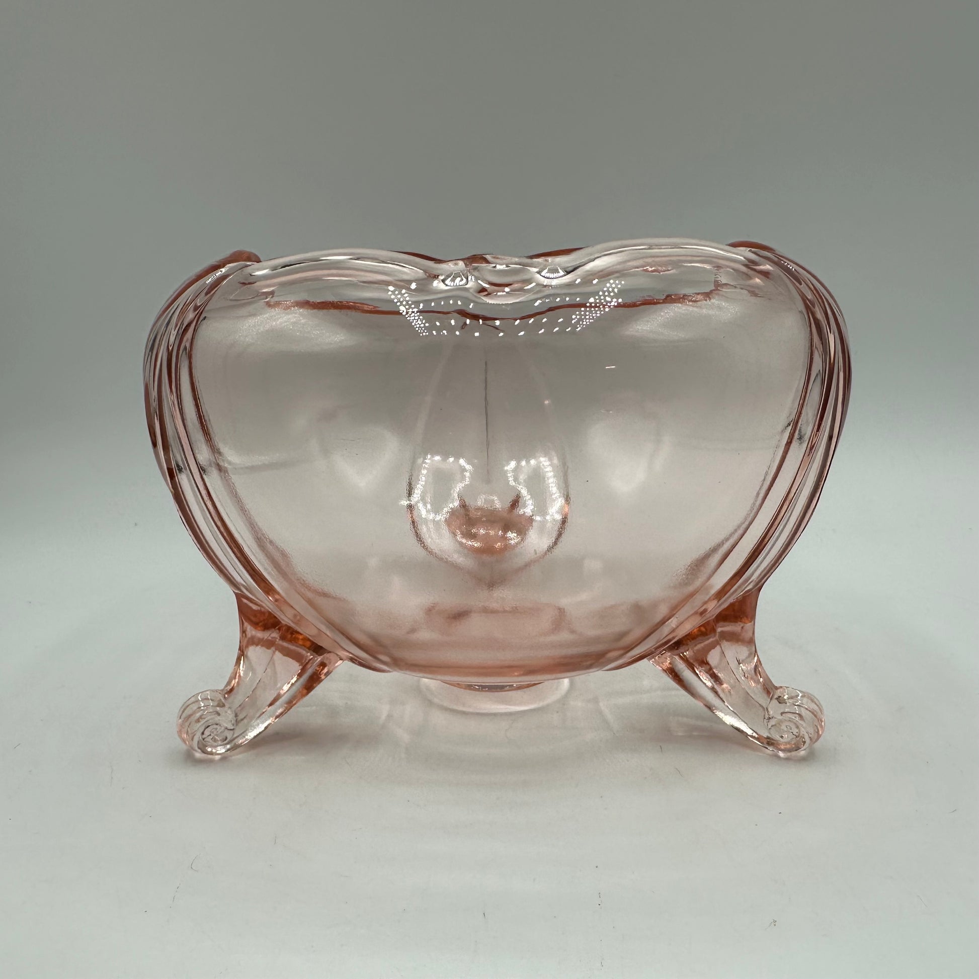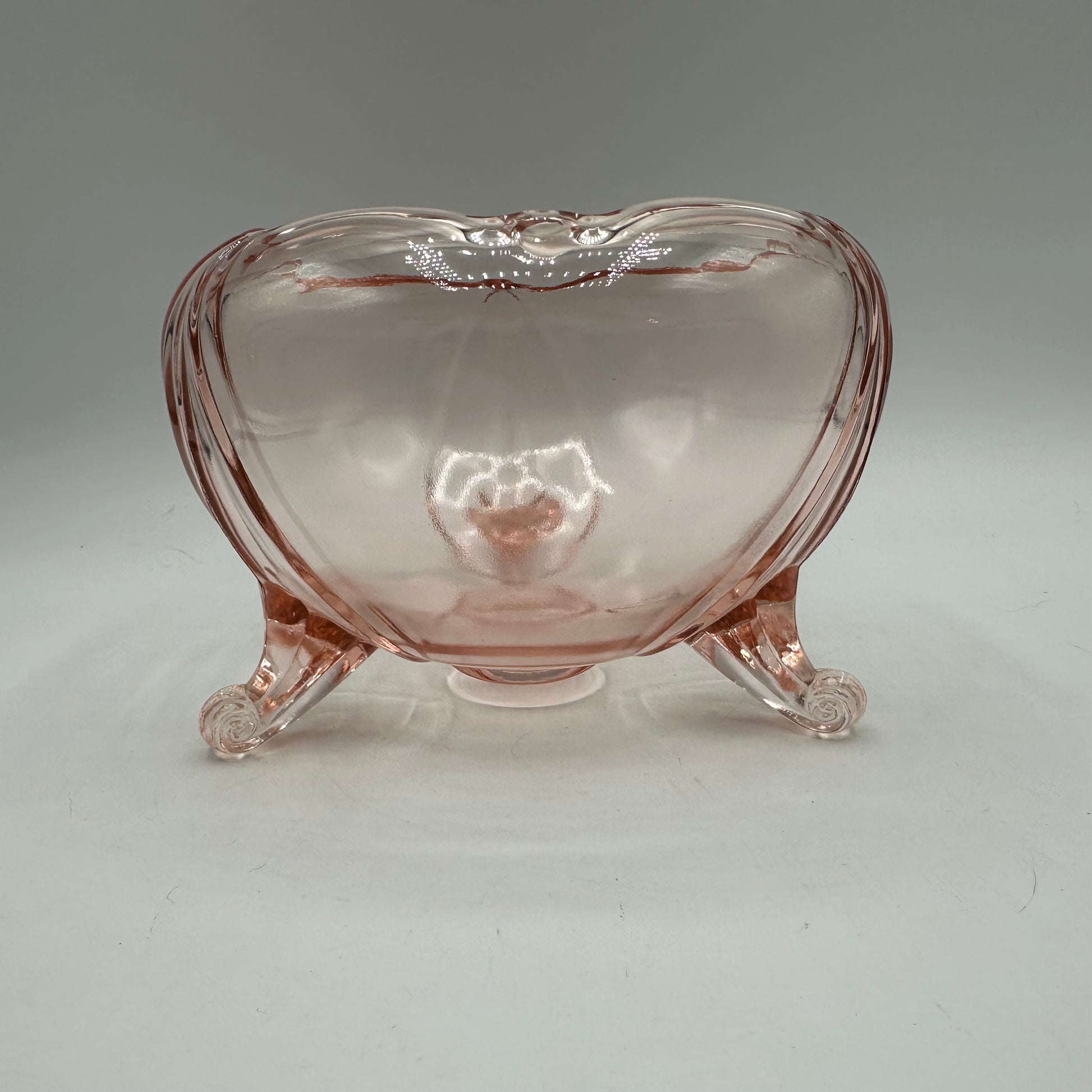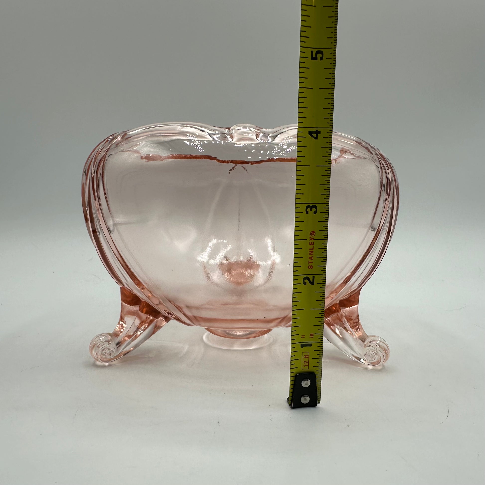 A beautiful depression era bowl from Lancaster Glass. It is petal pink and 3 toed. The bowl measures approximately 4" tall and is in excellent vintage used condition.