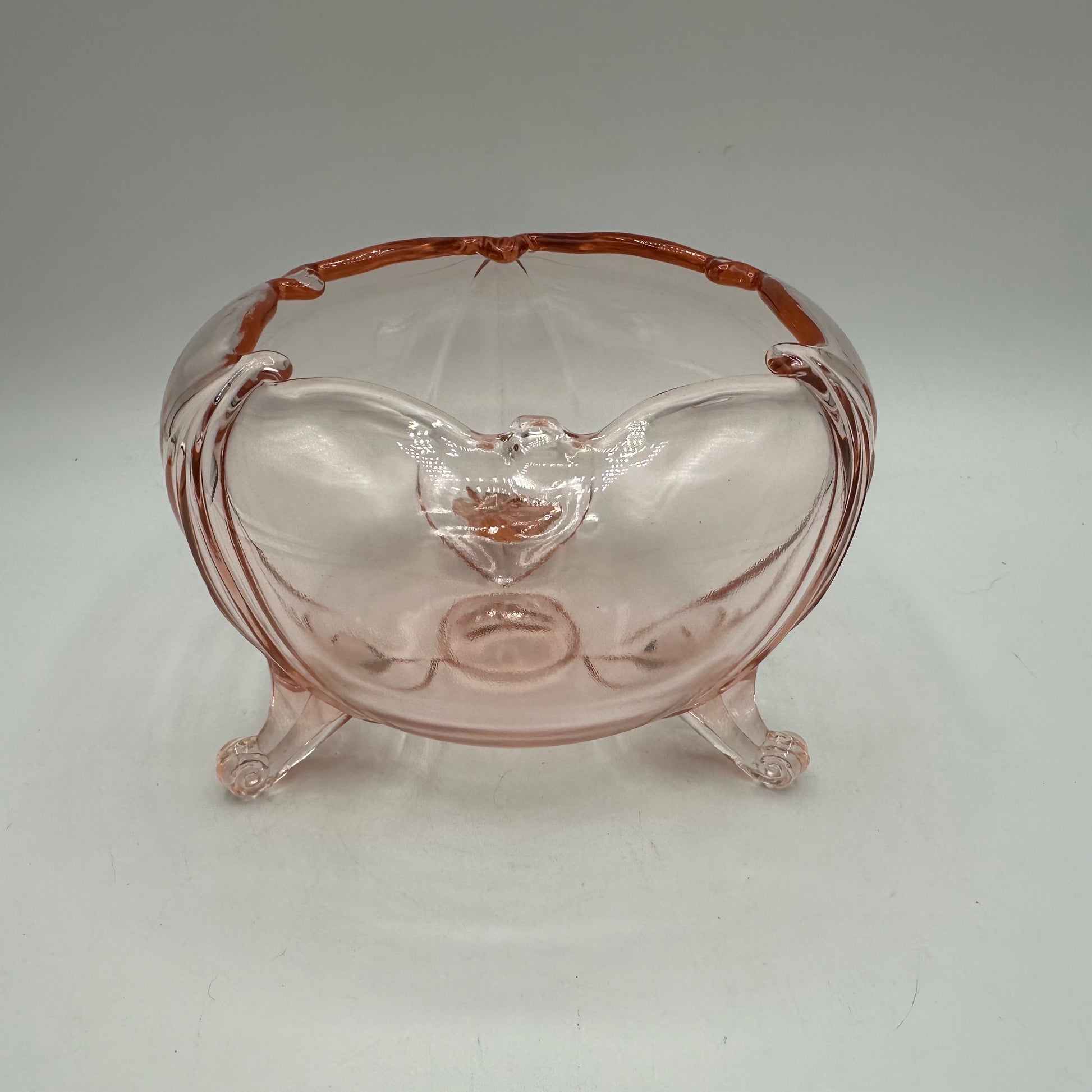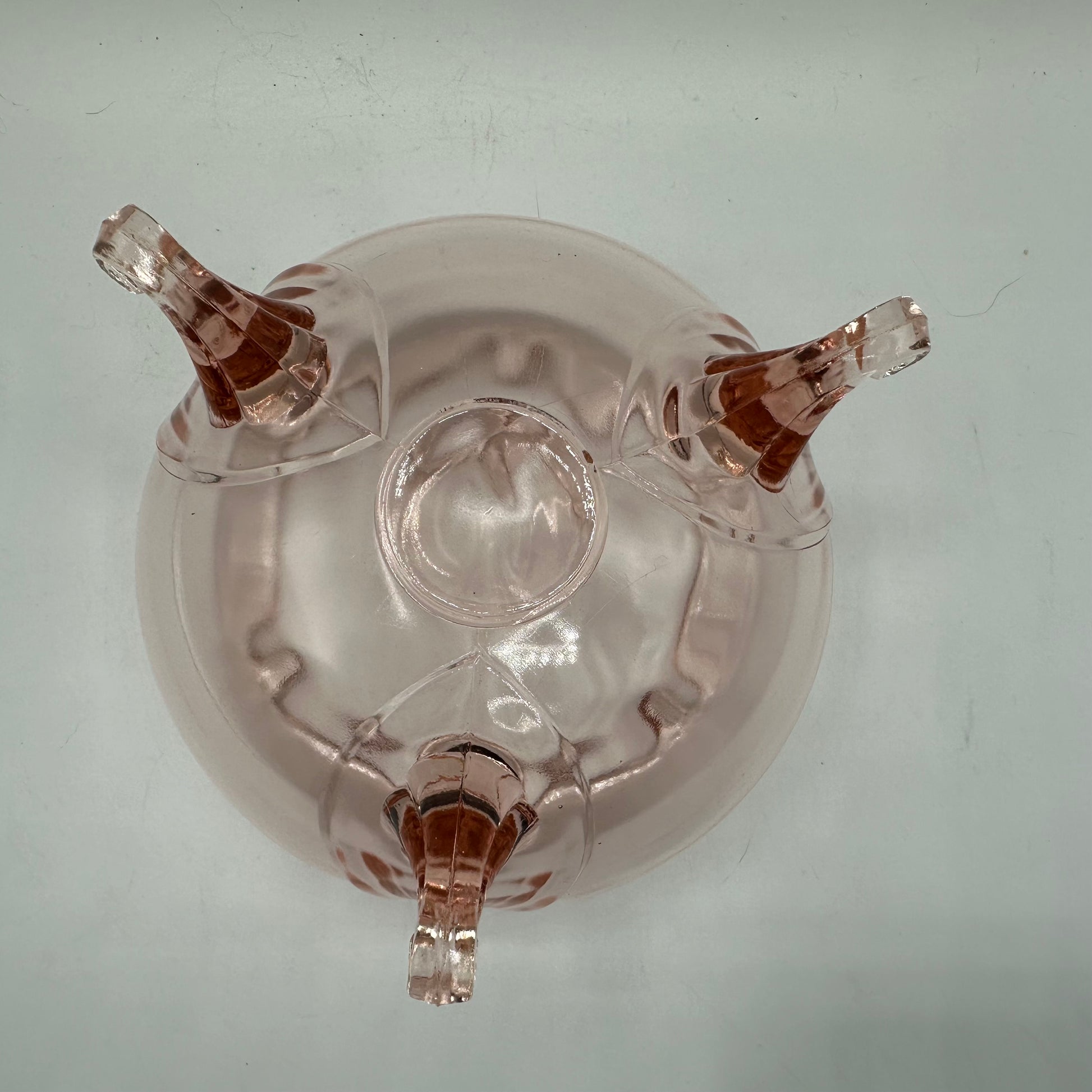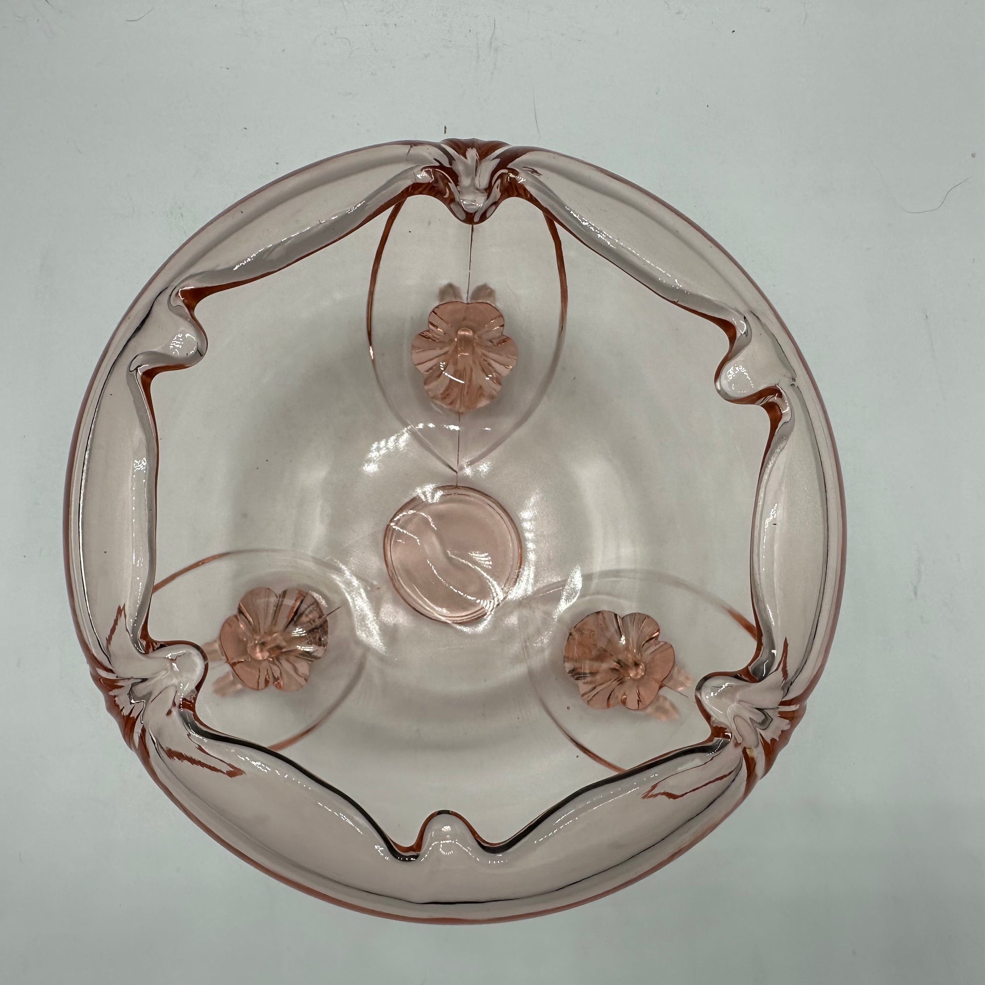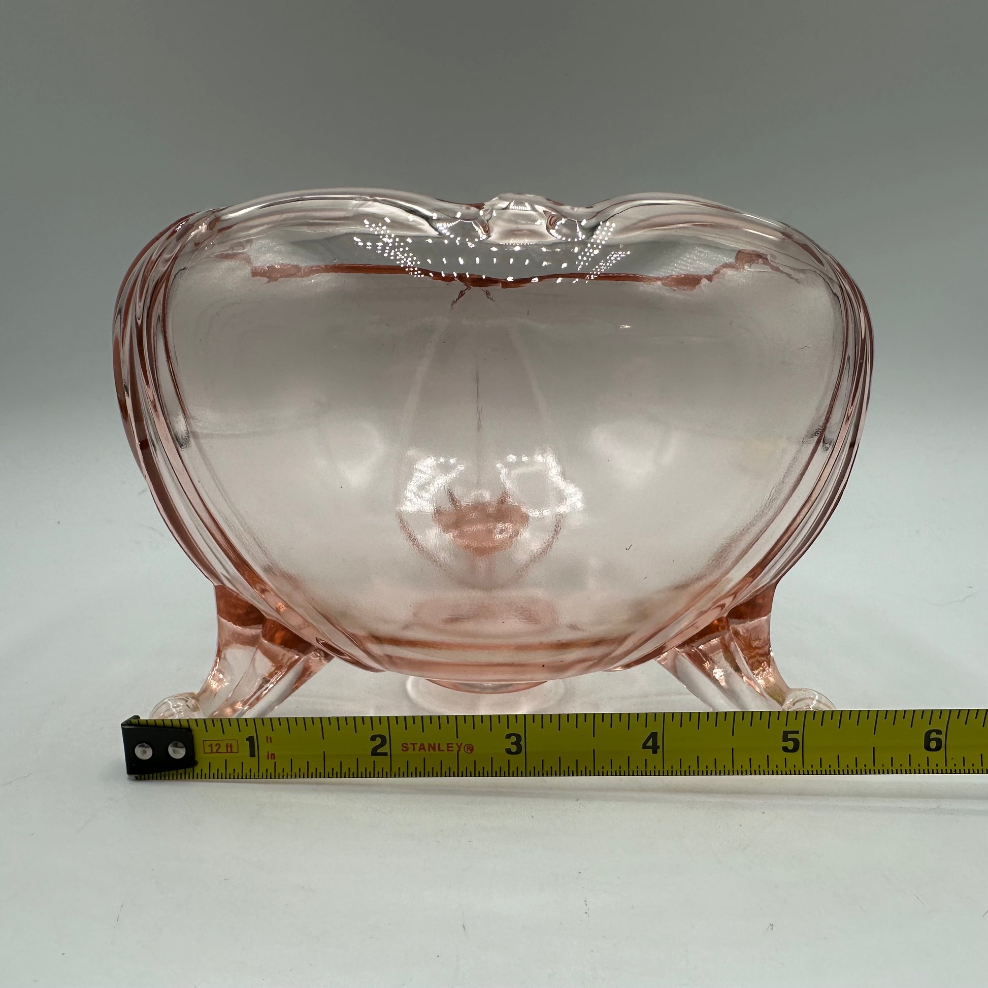 A beautiful depression era bowl from Lancaster Glass. It is petal pink and 3 toed. The bowl measures approximately 4" tall and is in excellent vintage used condition.