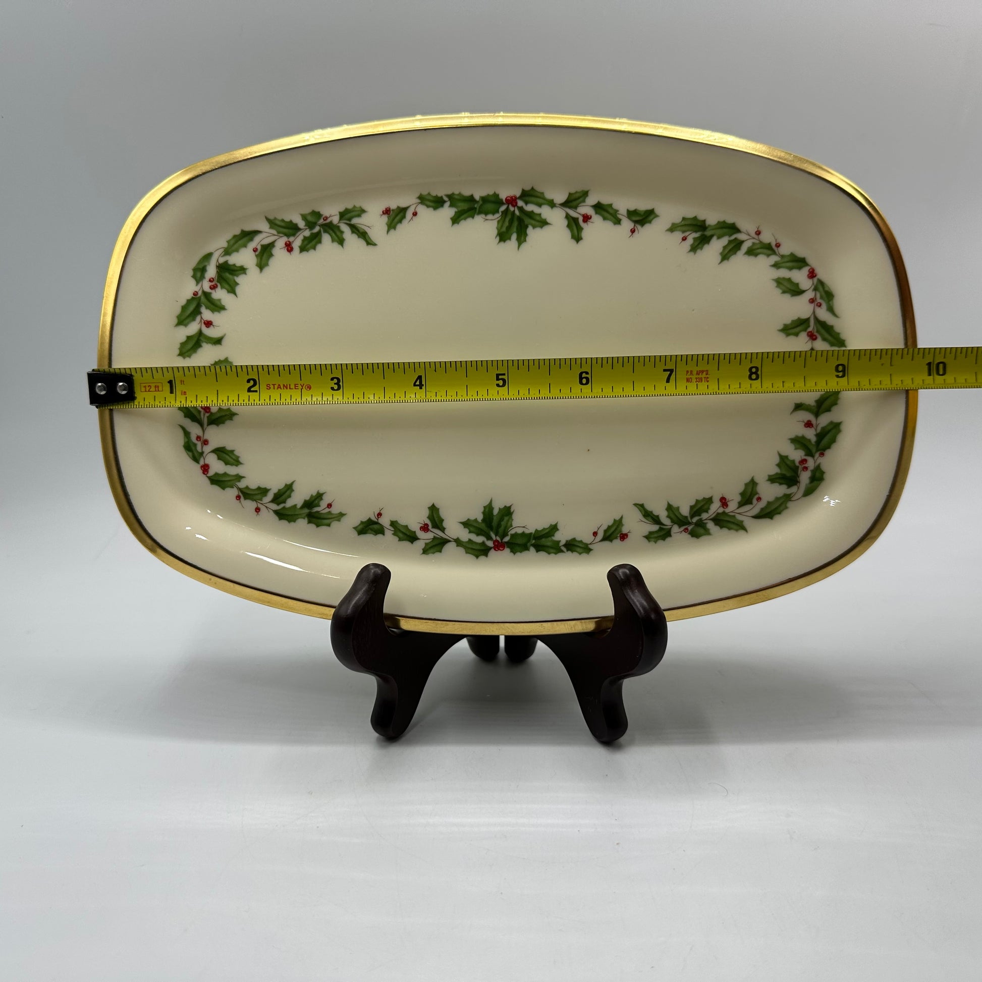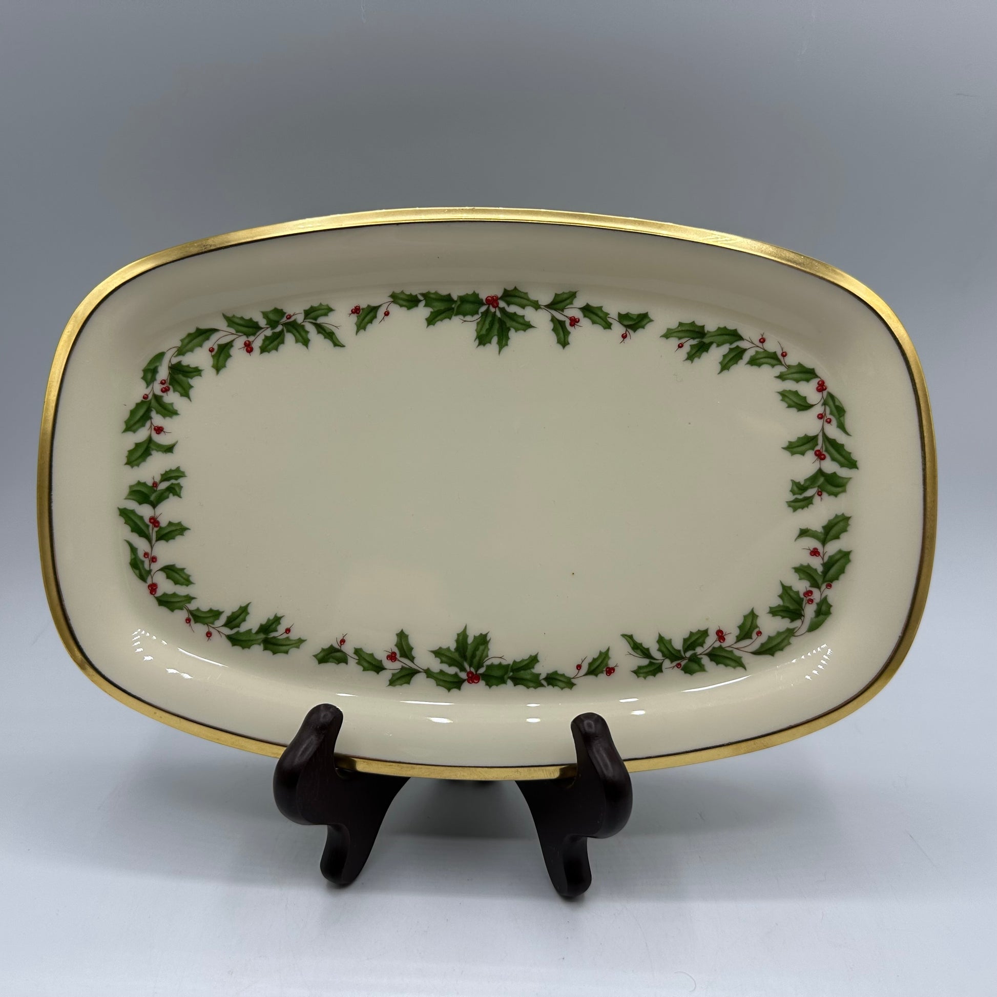 This Lenox tray is a stunning piece that showcases a charming holly and berry design, accented with elegant gold trim. It is in excellent vintage pre-owned condition, making it a lovely addition to any collection or setting.