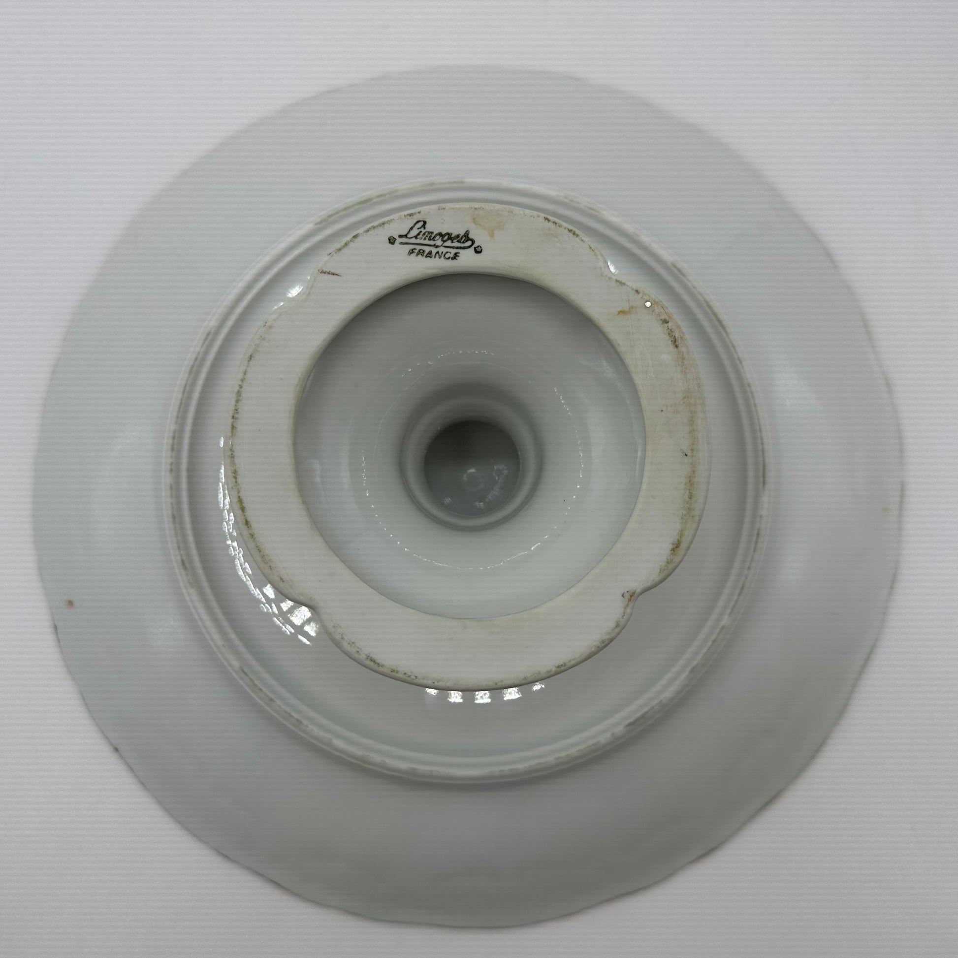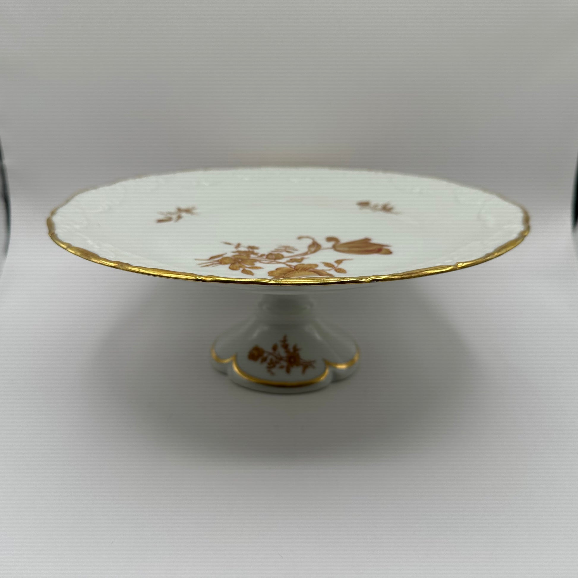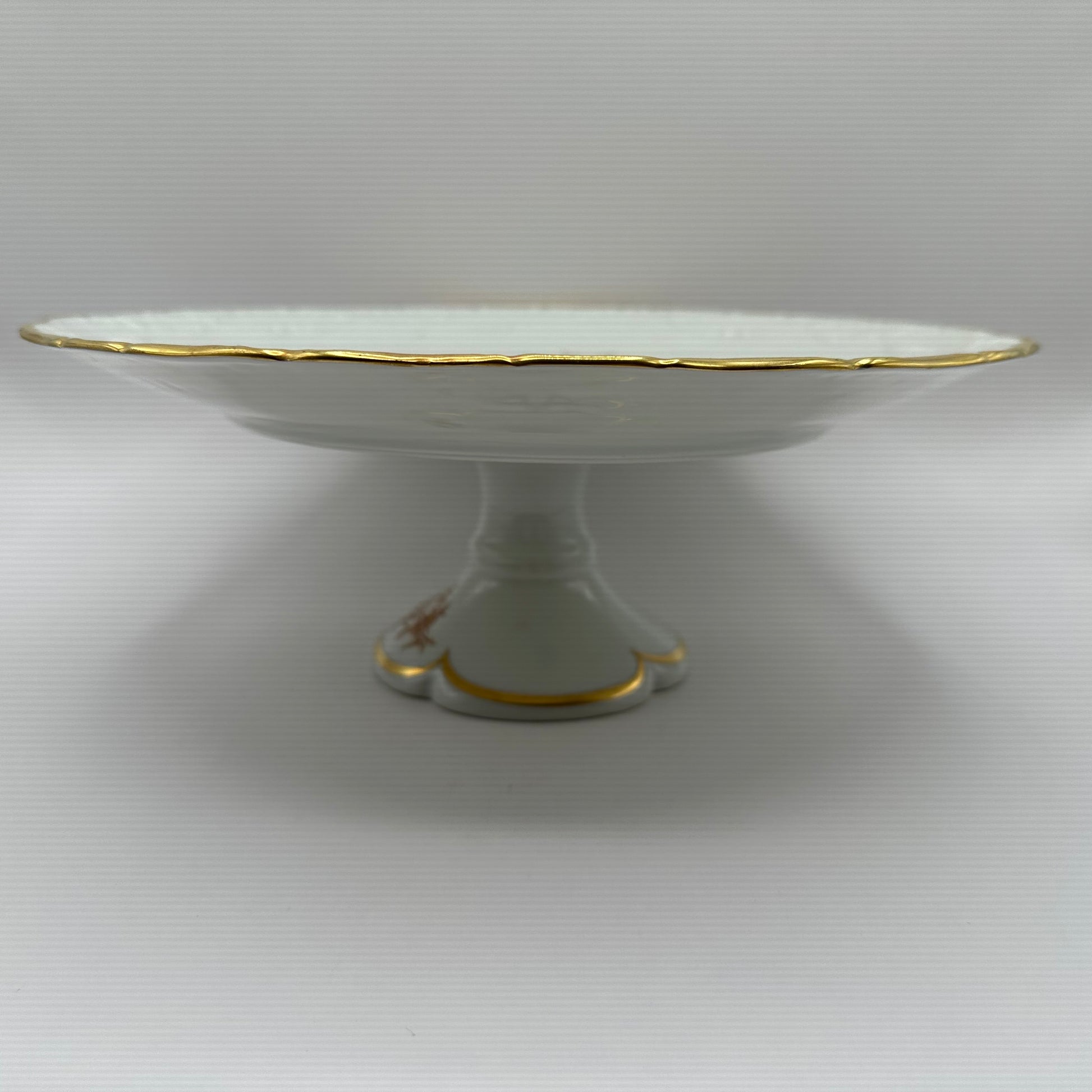 This exquisite cake stand from Limoges showcases an elegant design with gold roses accented by vibrant red details. It is in excellent condition, reflecting its vintage pre-owned status. This piece is not only a functional item for serving desserts but also a beautiful addition to any collection or display.