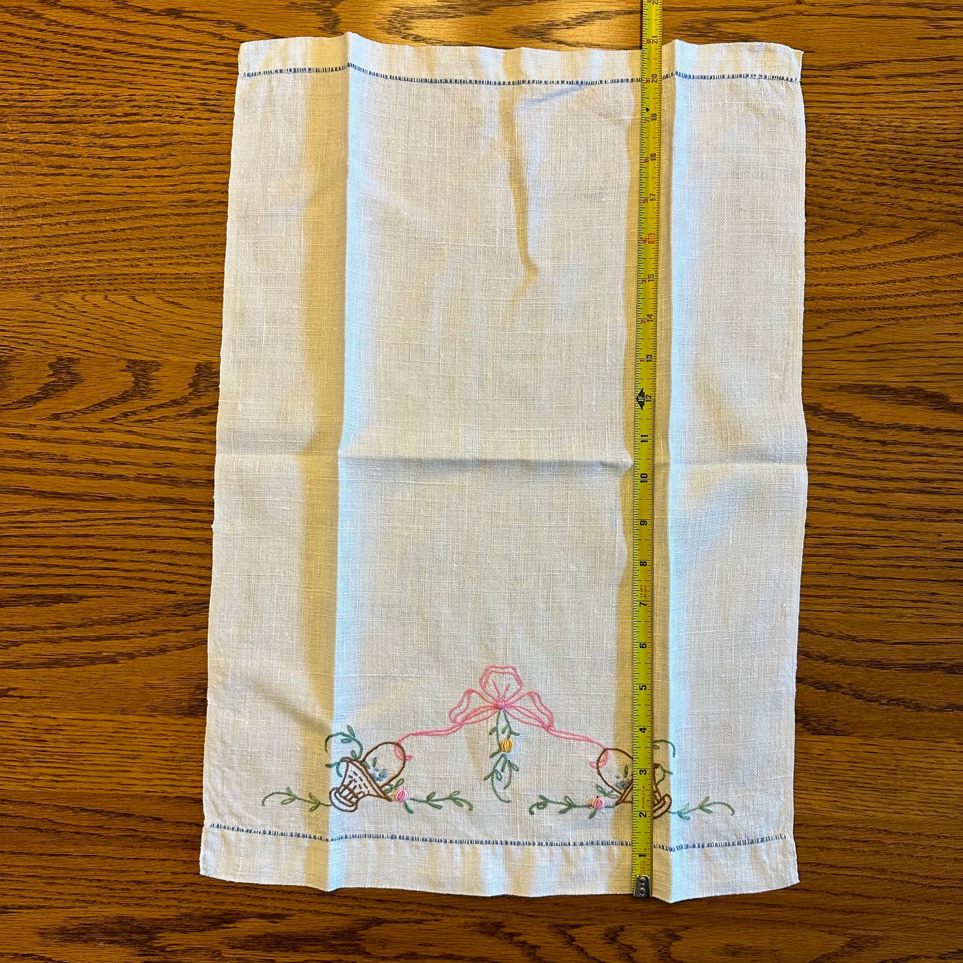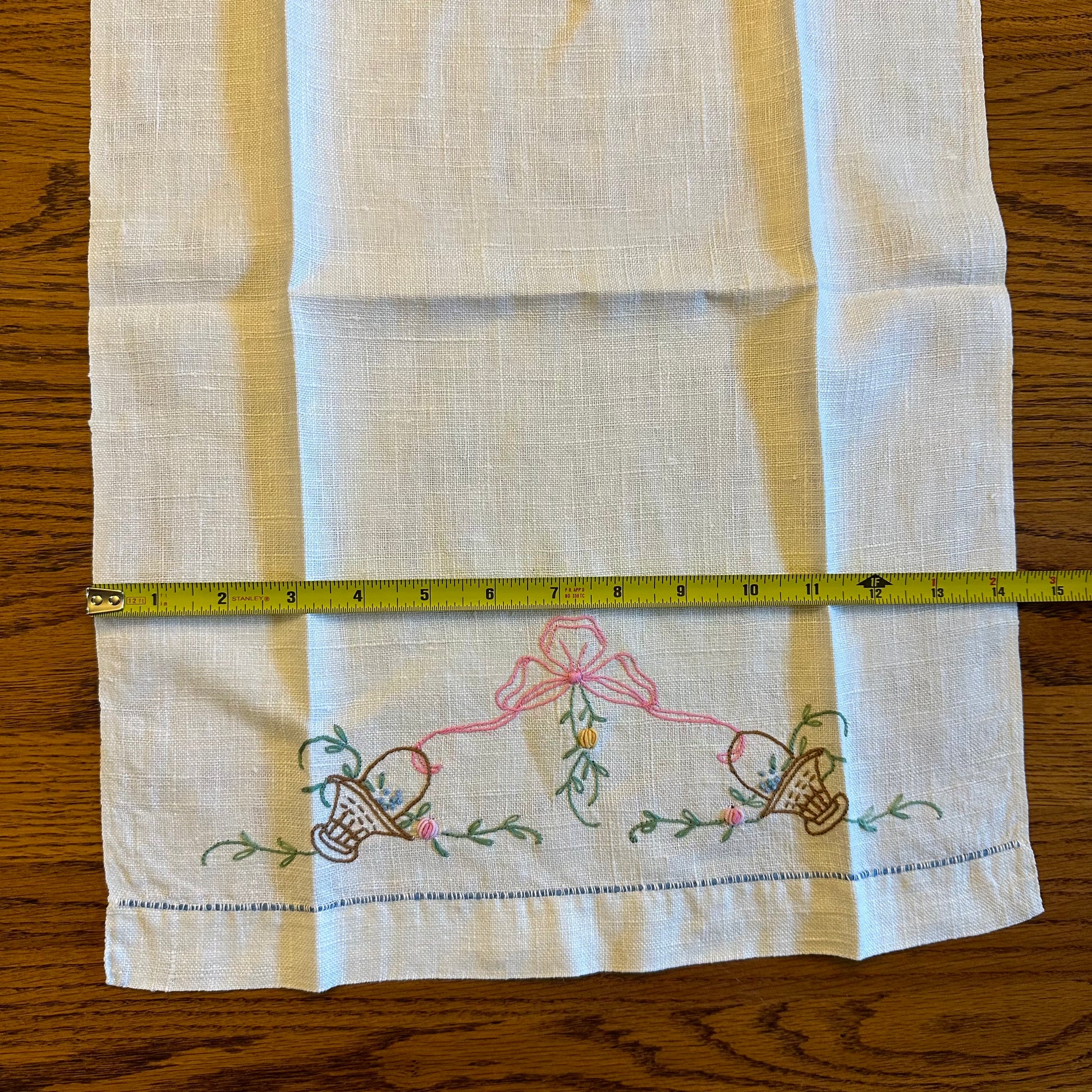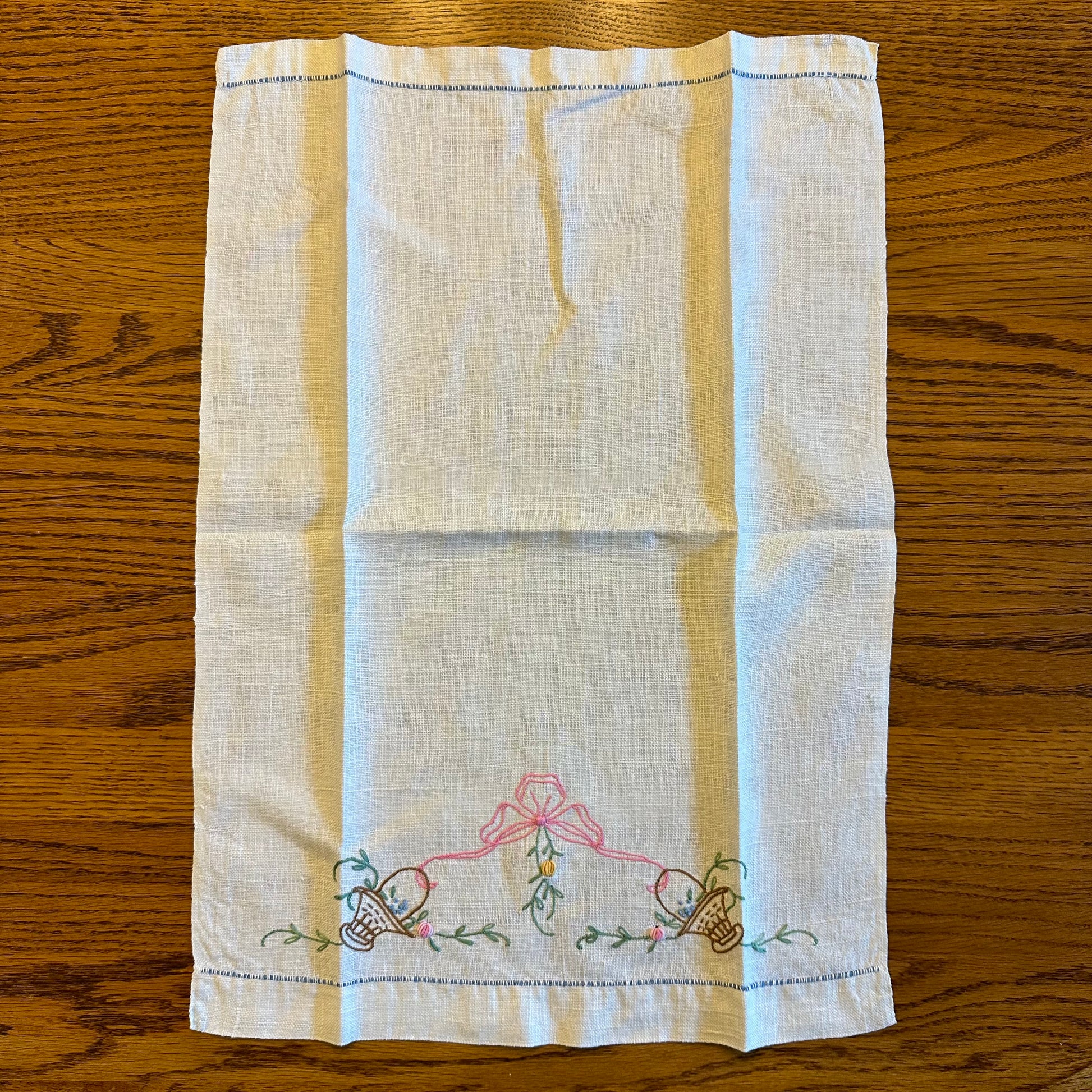 A lovely linen handtowel embroidered with baskets and bows. It is in excellent vintage used condition.