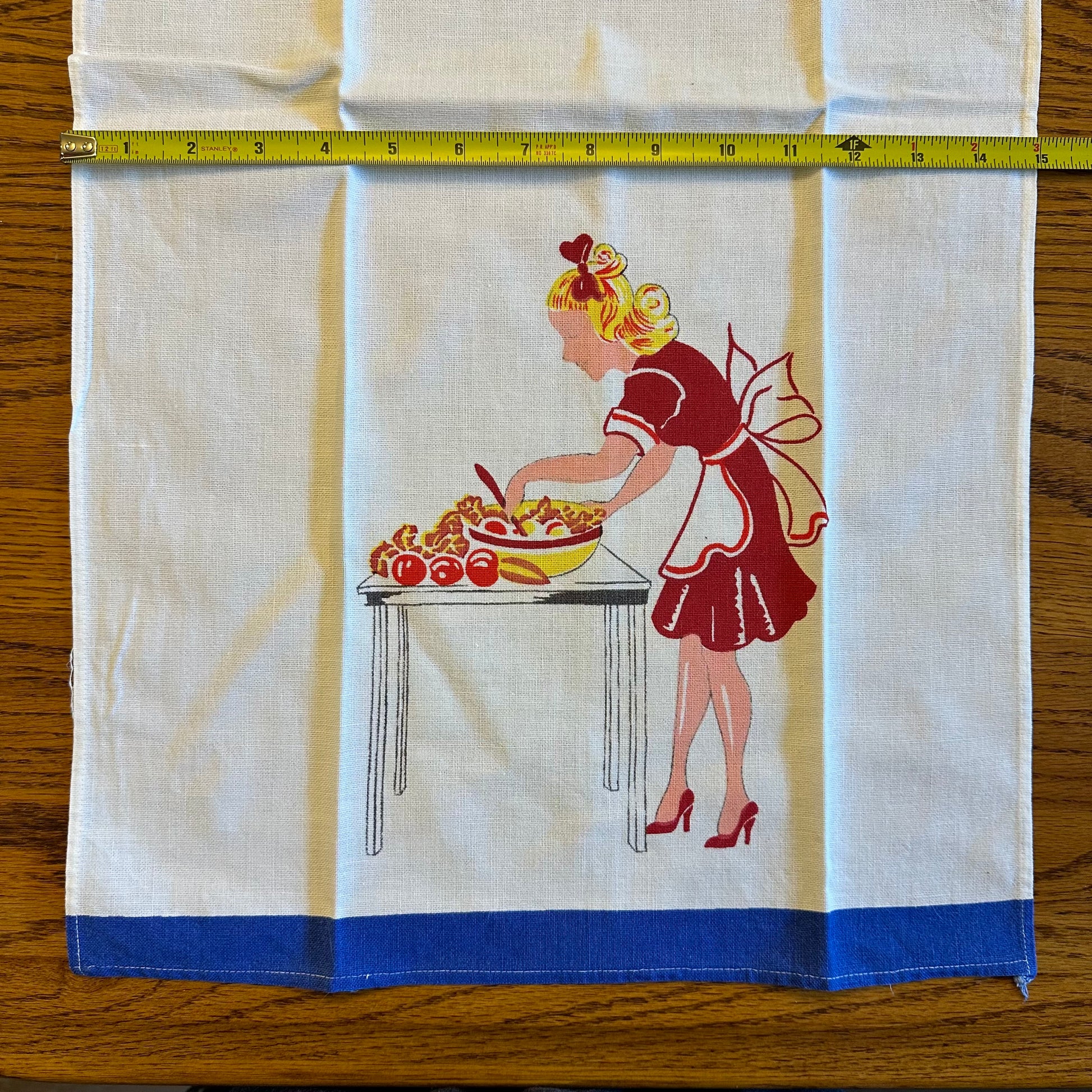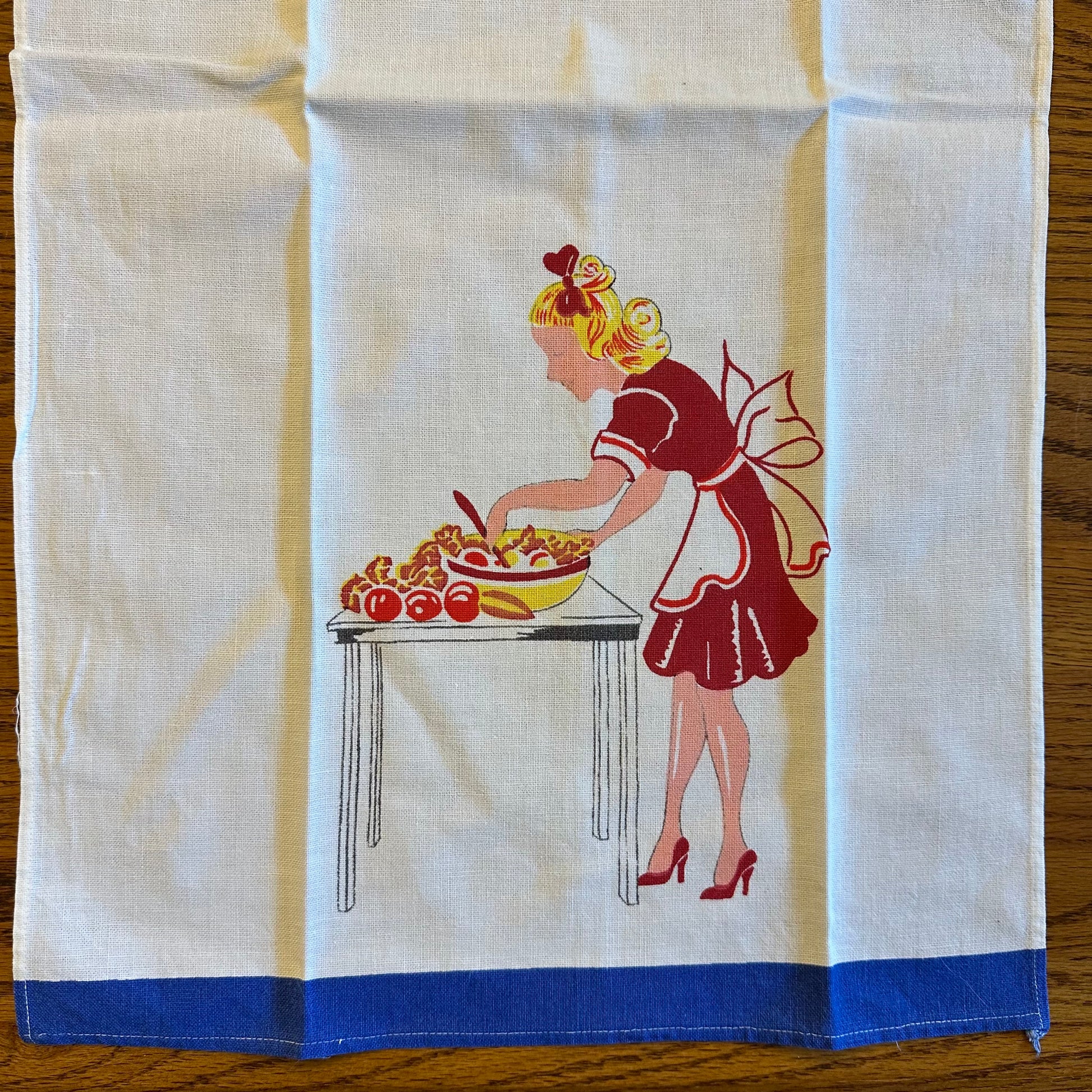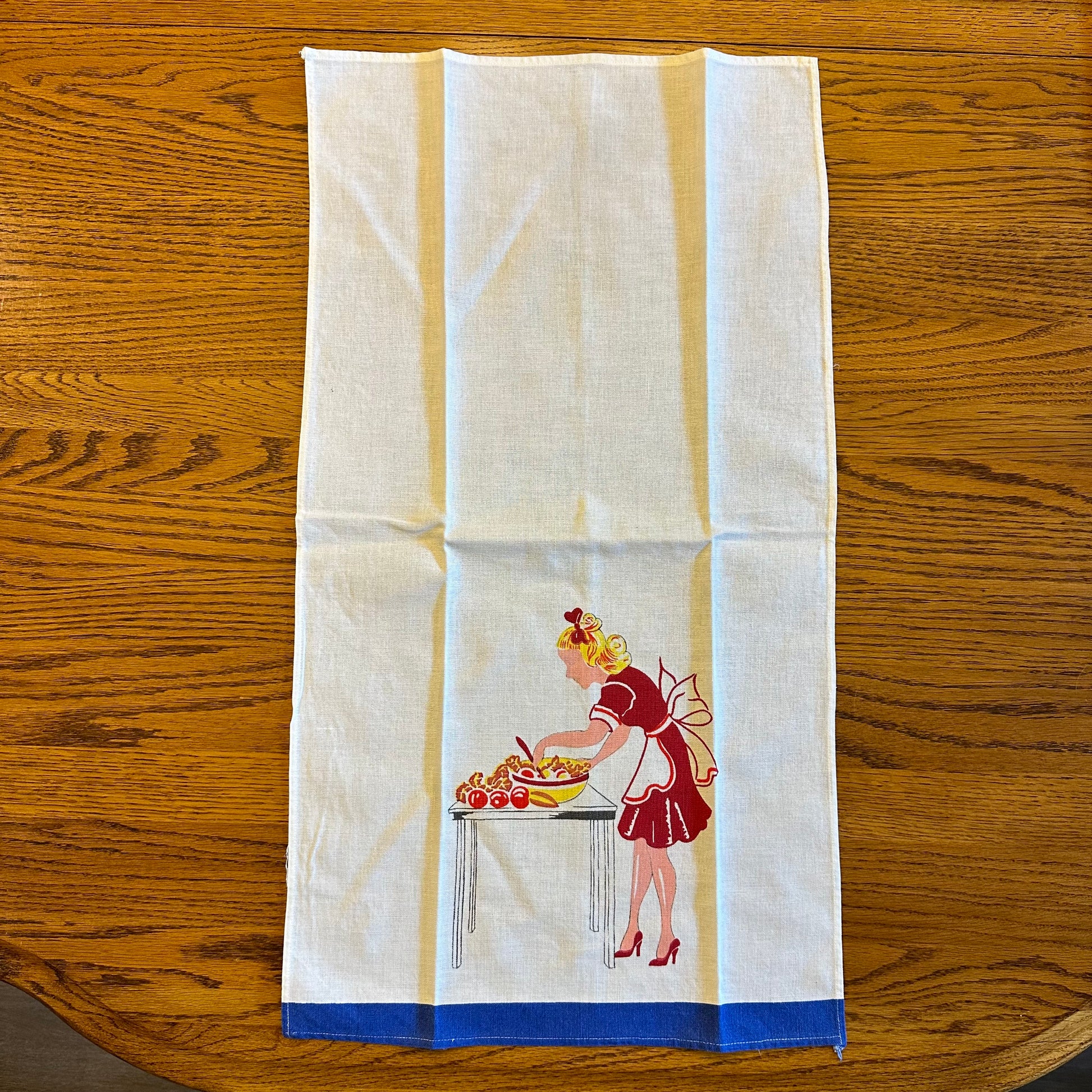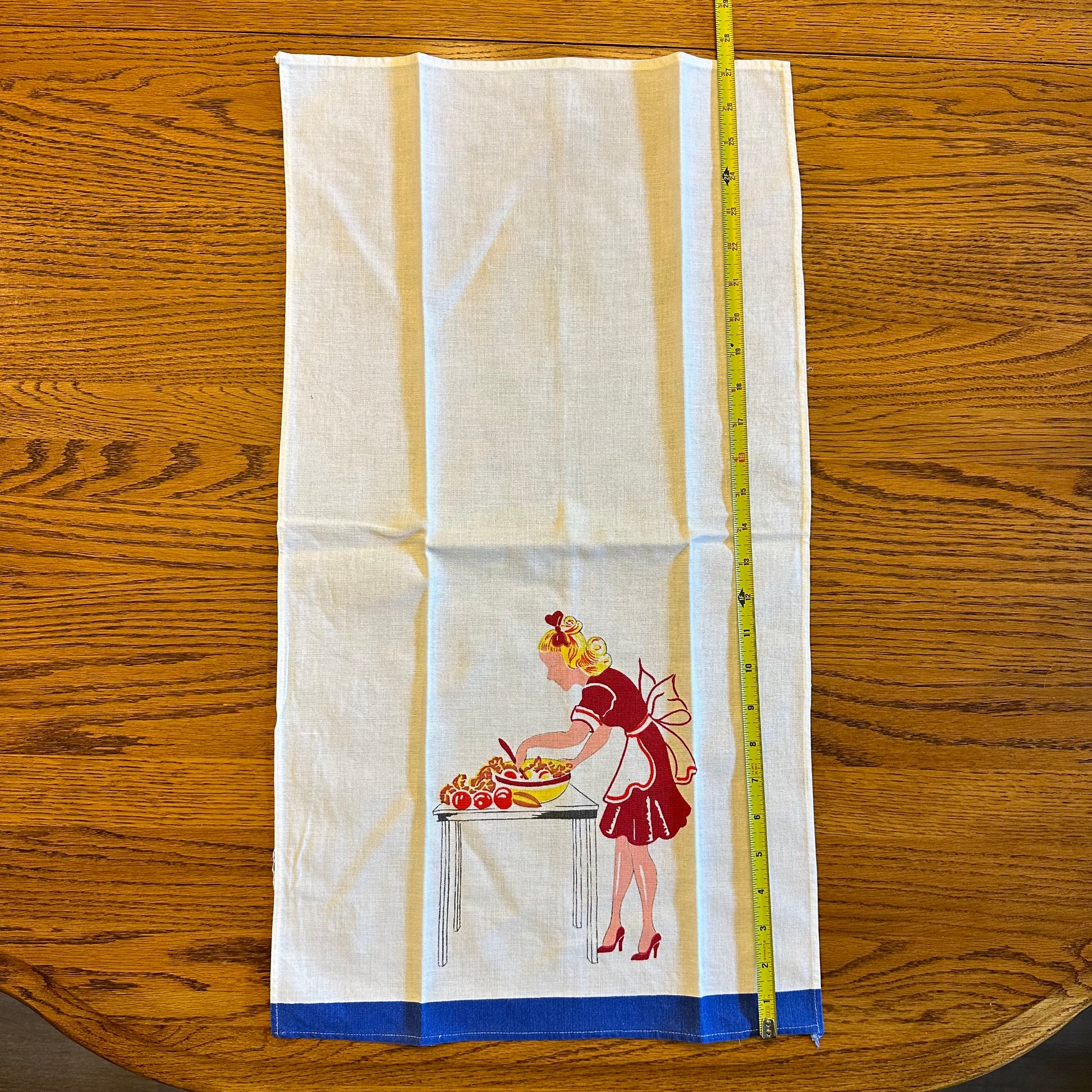 A fantastic vintage Hand towel. It features a woman cooking while wearing a dress, apron and heels. The towel is excellent vintage used condition.