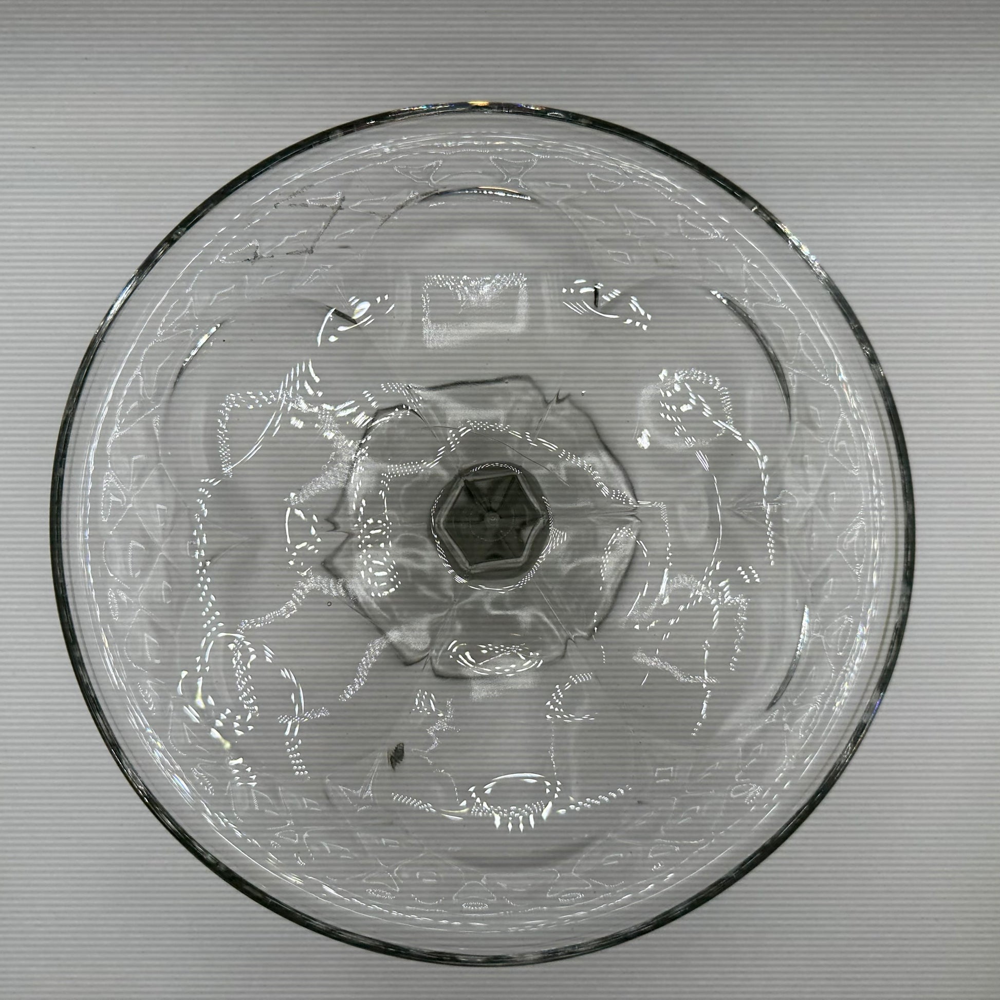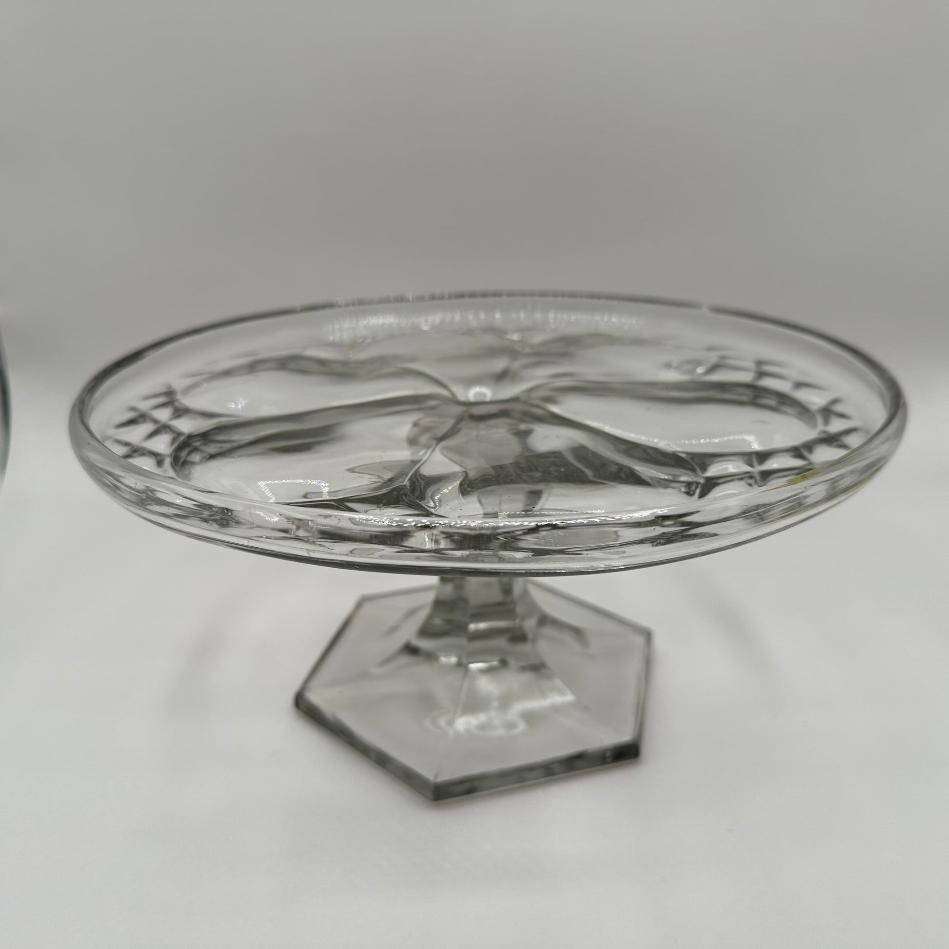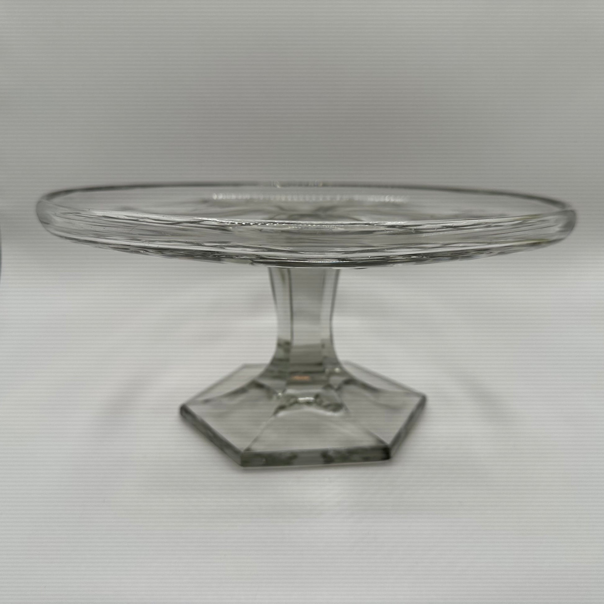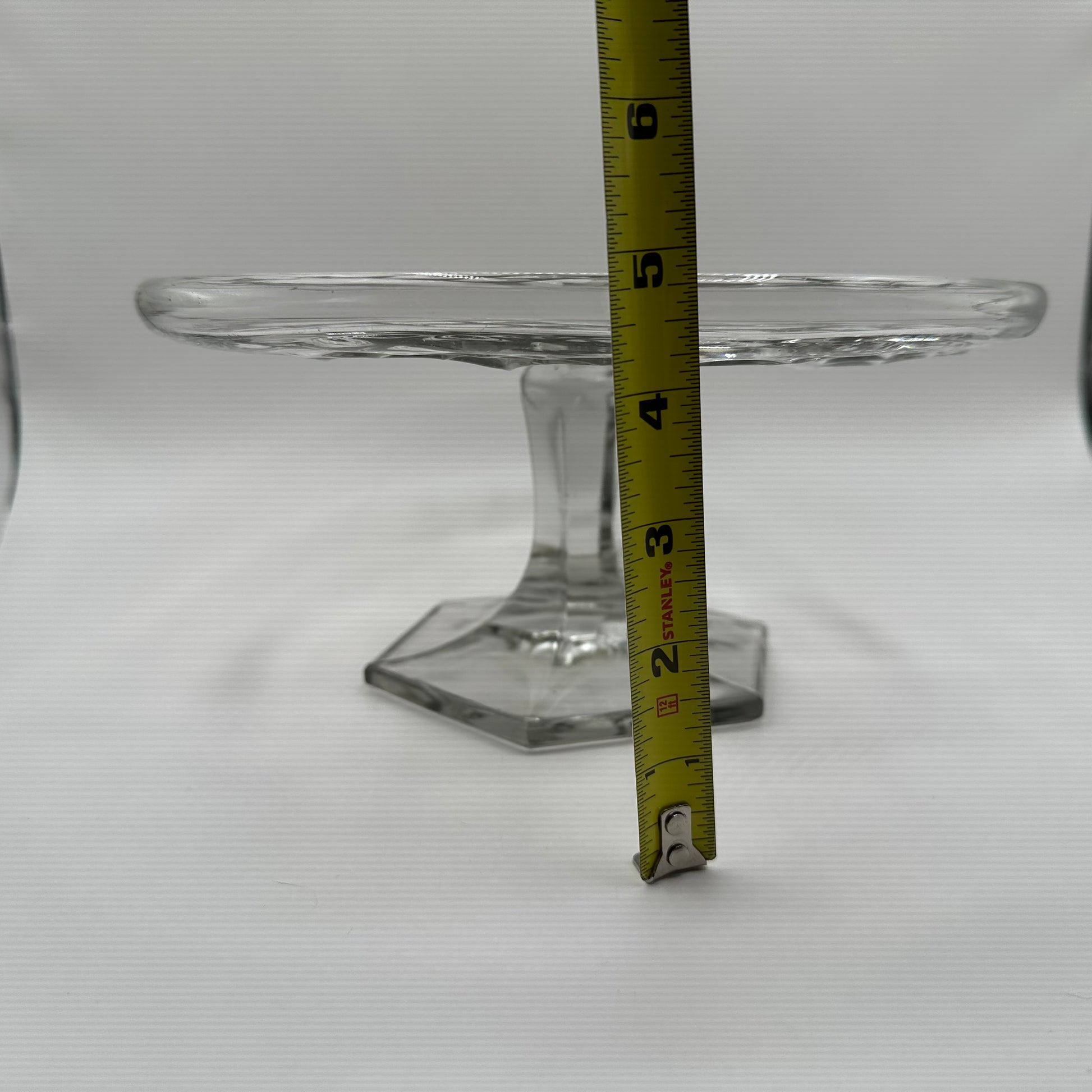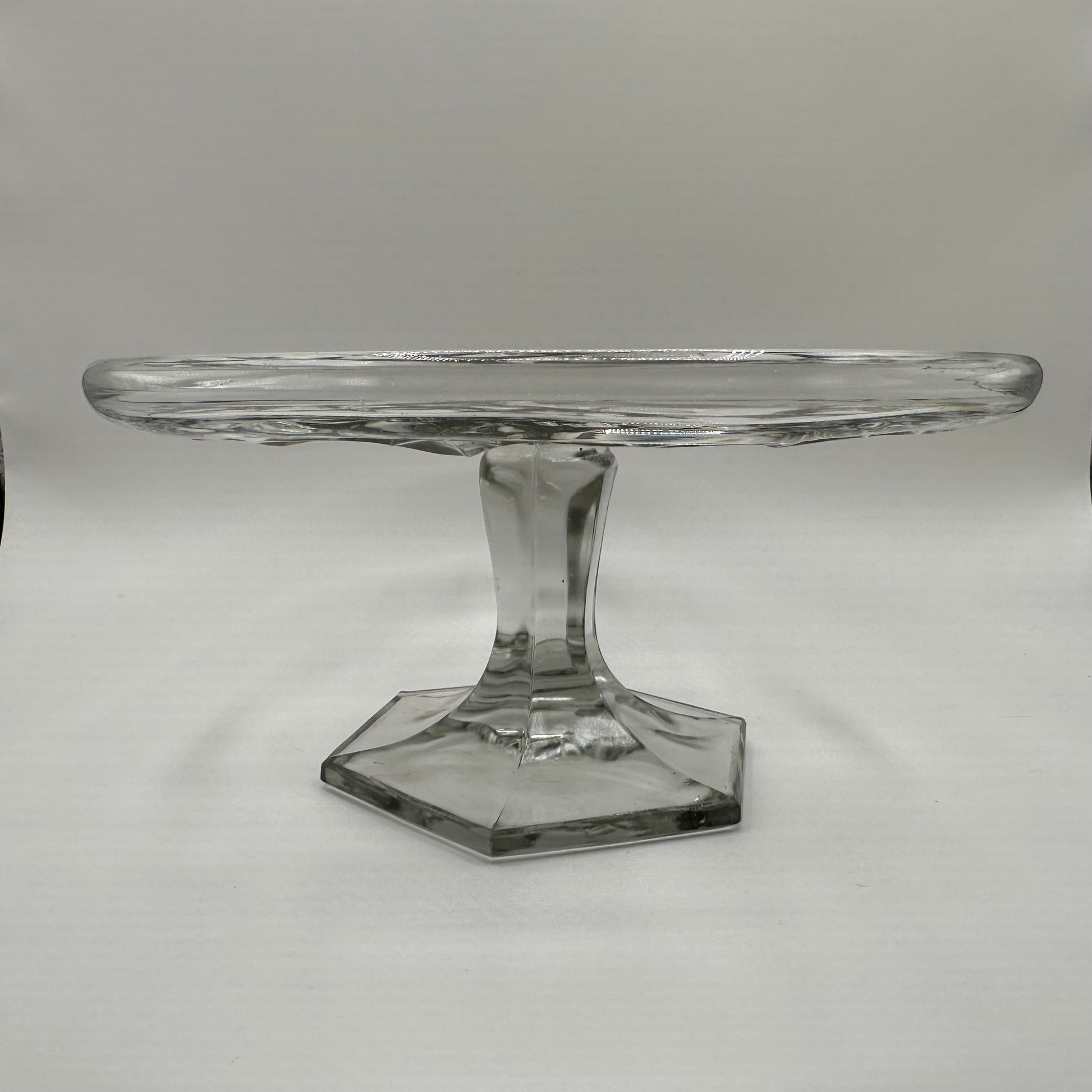 This cake stand from New Martinsville showcases a beautiful embossed design crafted in clear glass, complemented by an elegant pedestal. It is in excellent pre-owned vintage condition, making it a charming addition to any collection or dining experience.