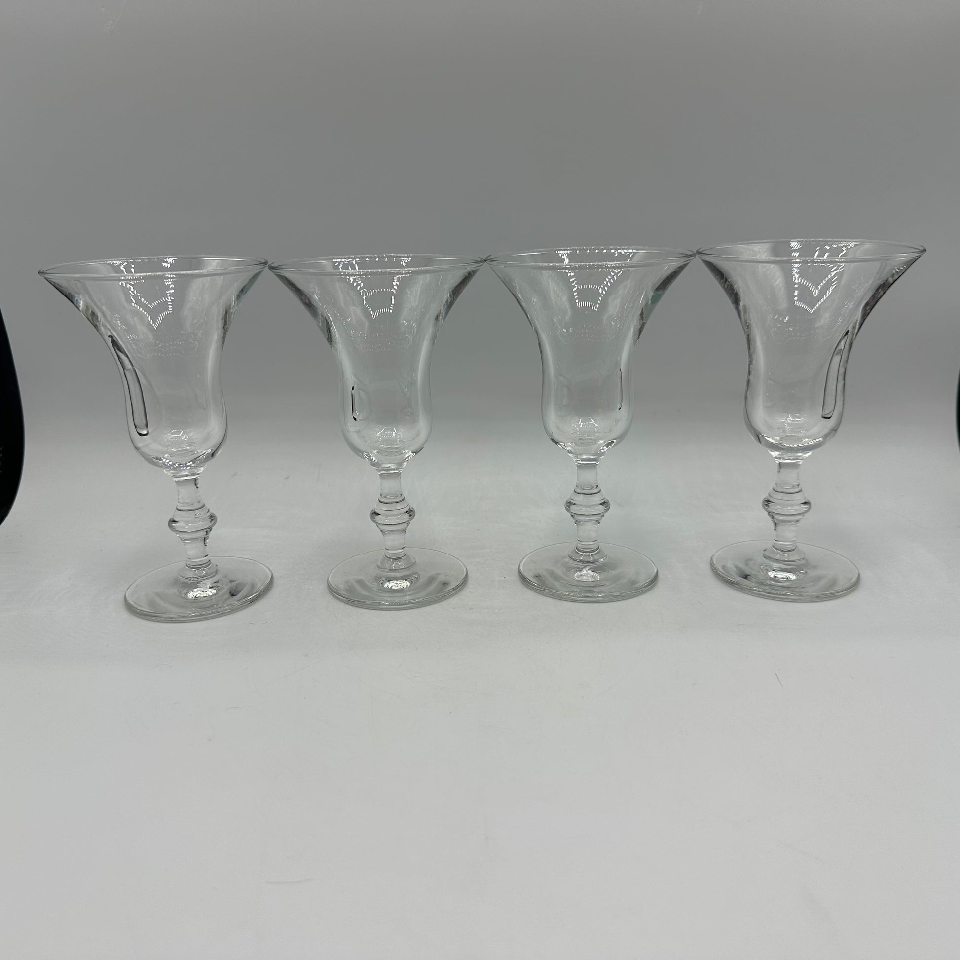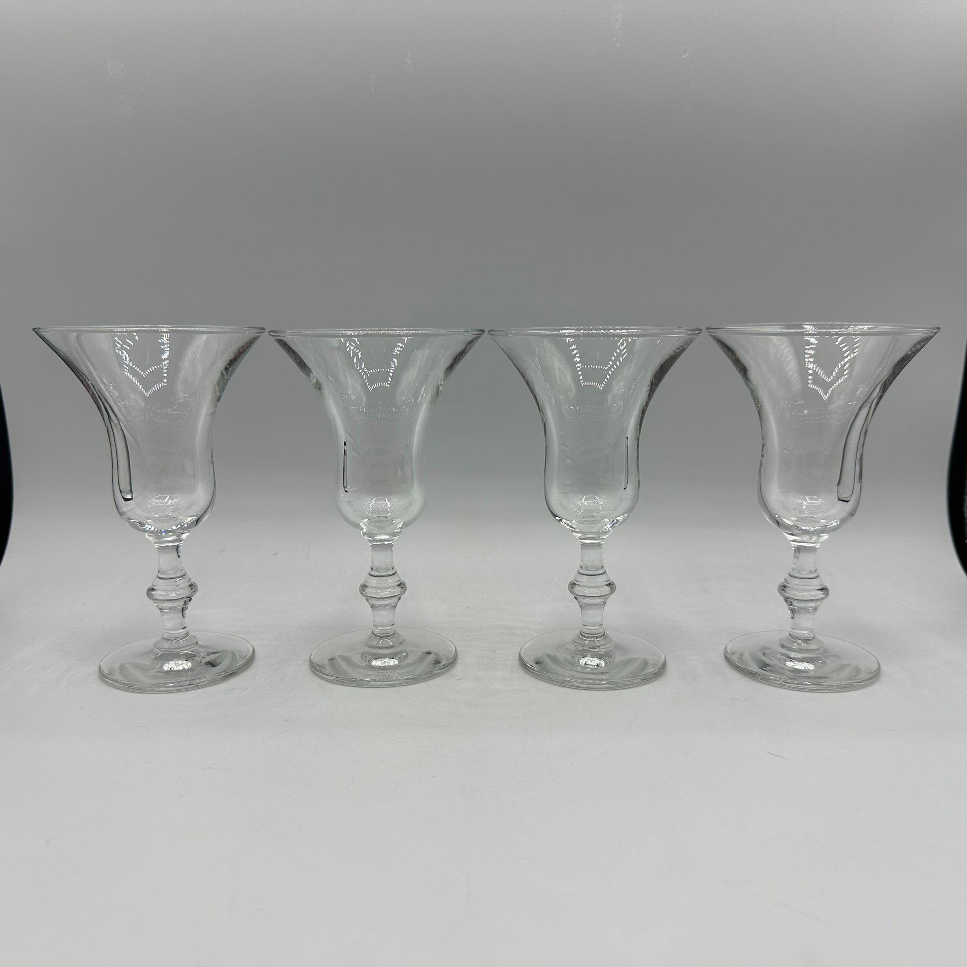 This set includes four elegant sherry glasses from the renowned brand Libbey. Each glass showcases the classic Georgian pattern, distinguished by its unique knob on the stem and a gracefully flared rim. The set is in excellent vintage condition, having been pre-owned but well-maintained.