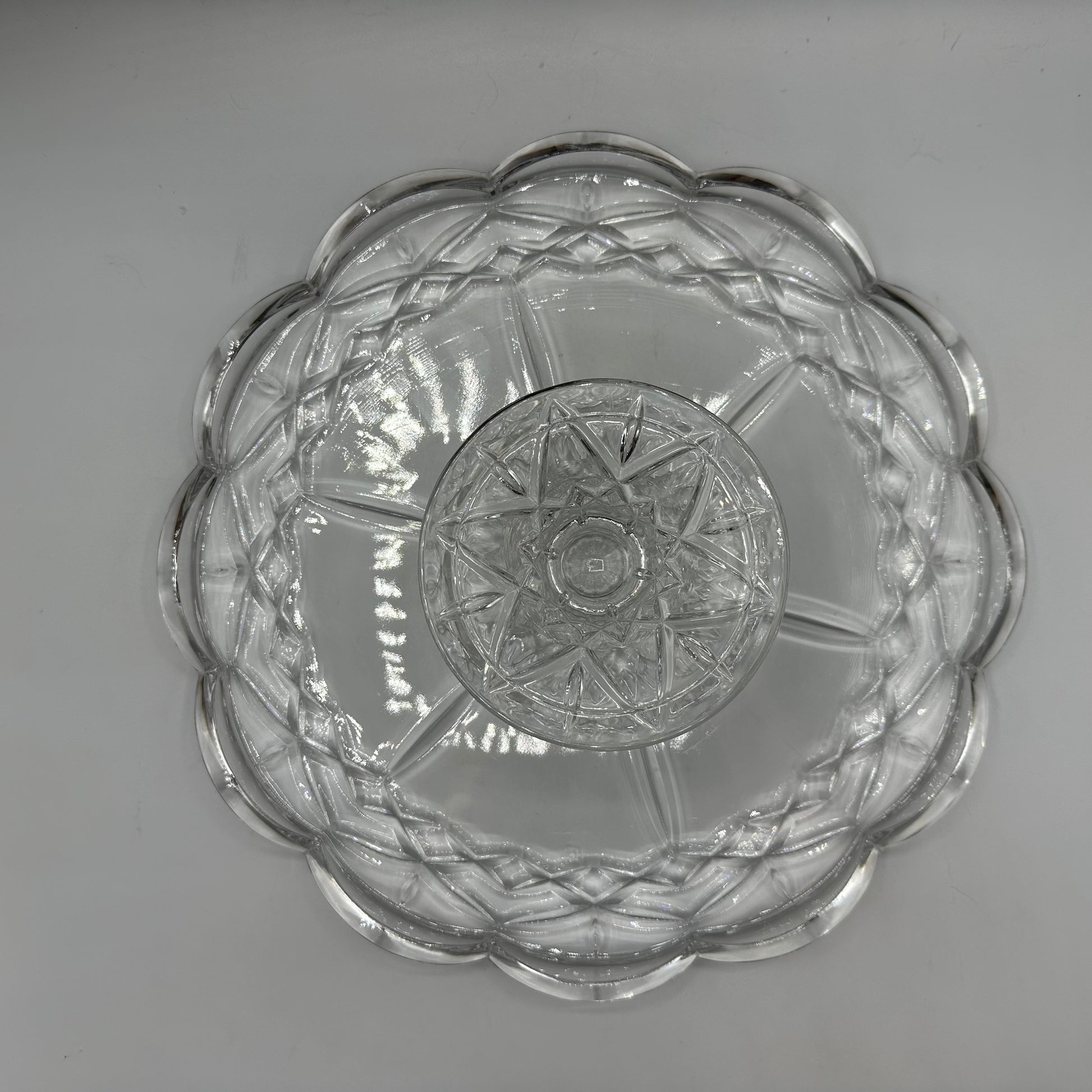 This pedestal cake plate is a stunning piece crafted from lead crystal. It features an elegant scalloped edge and a crisscross pattern on both the base and the plate, adding to its visual appeal. The cake plate is in excellent vintage pre-owned condition, making it a great addition to any collection or a perfect centerpiece for your desserts.