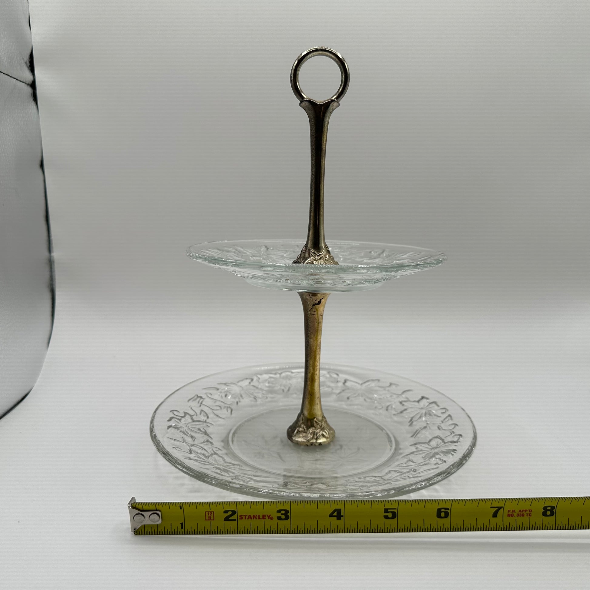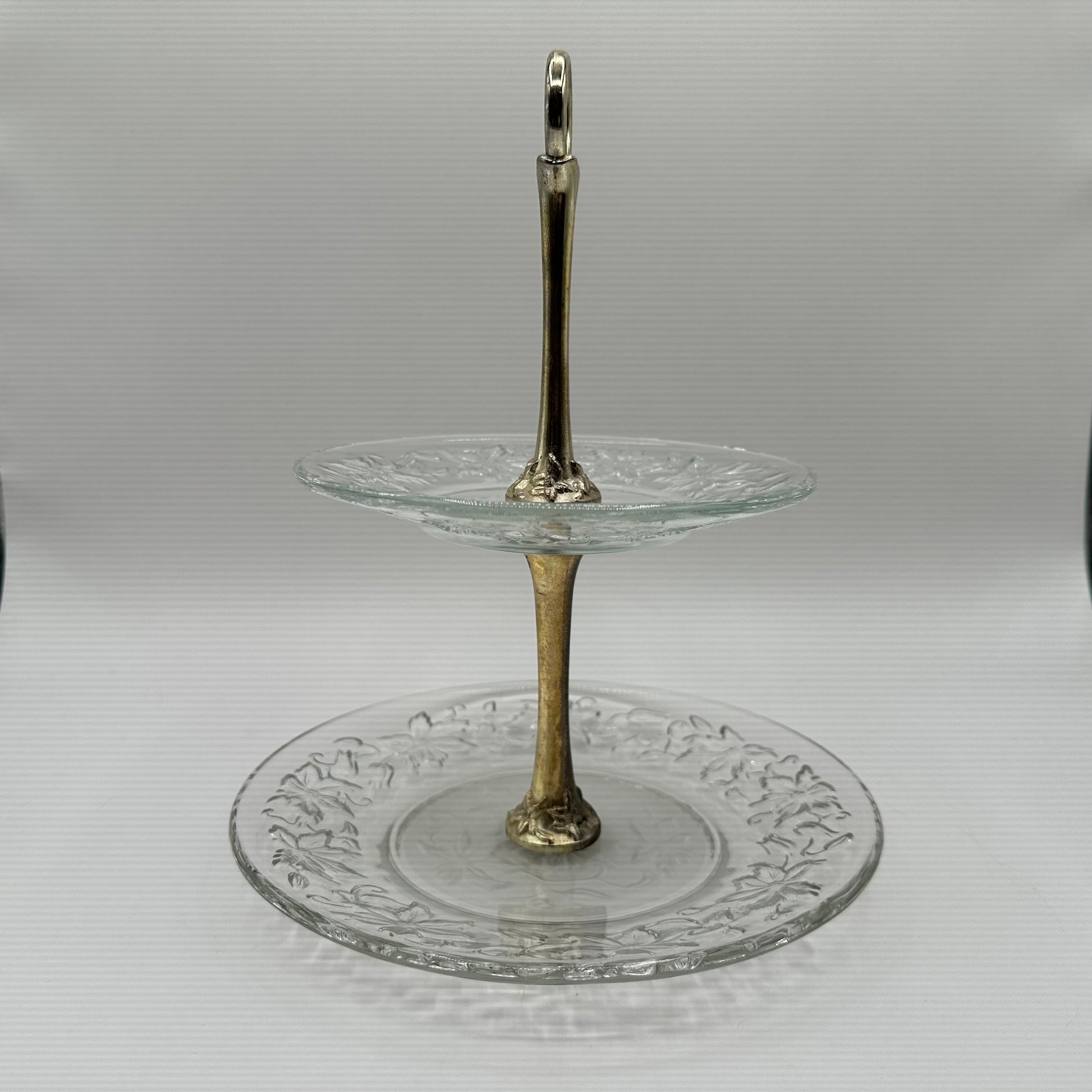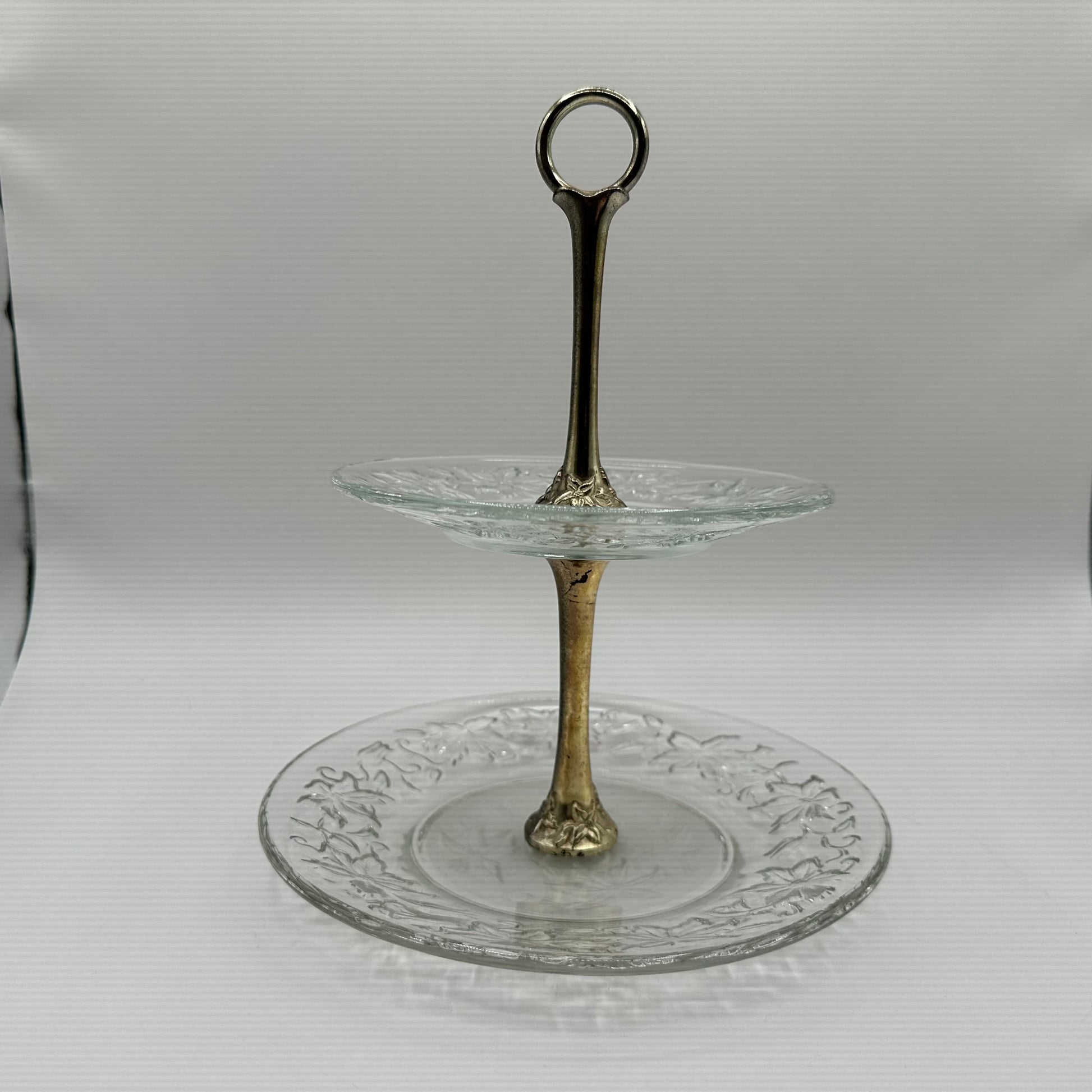 This is a stunning 2-tier tidbit tray from Princess House, showcasing the elegant Fantasia pattern and adorned with decorative gold hardware. The tray is in excellent vintage pre-owned condition, making it a wonderful addition to any collection or table setting.