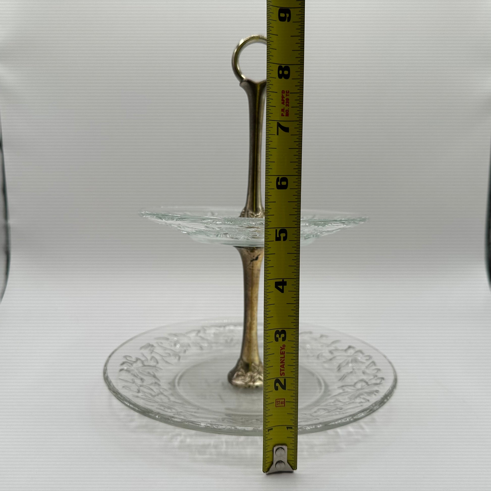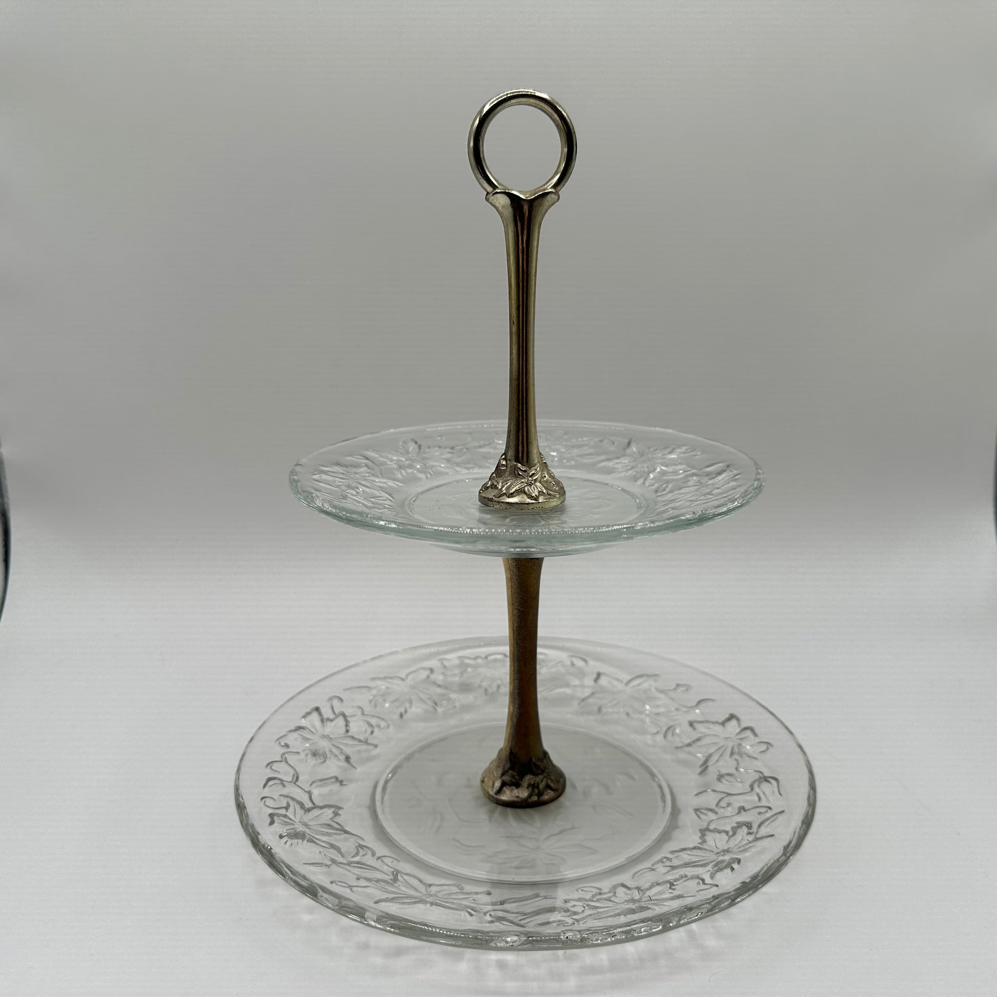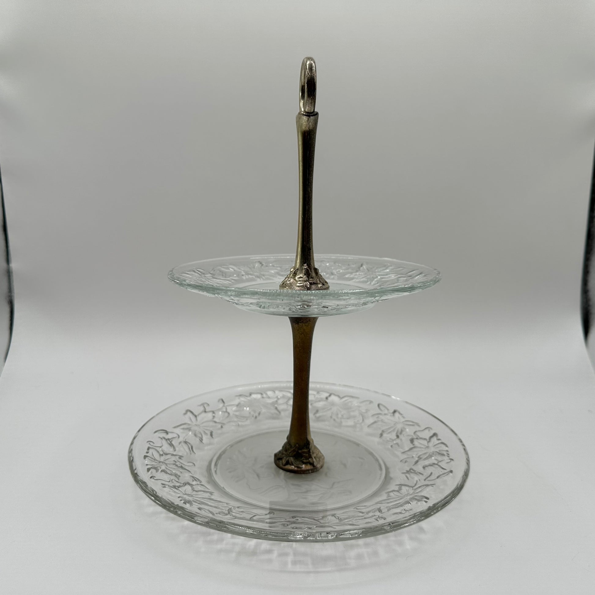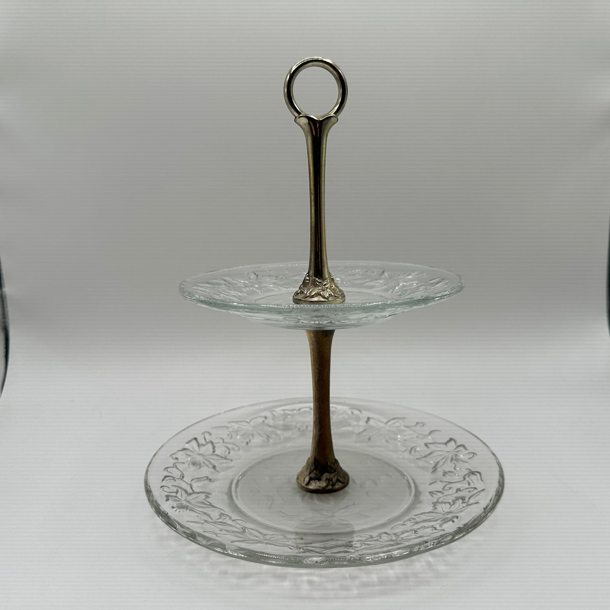 This is a stunning 2-tier tidbit tray from Princess House, showcasing the elegant Fantasia pattern and adorned with decorative gold hardware. The tray is in excellent vintage pre-owned condition, making it a wonderful addition to any collection or table setting.