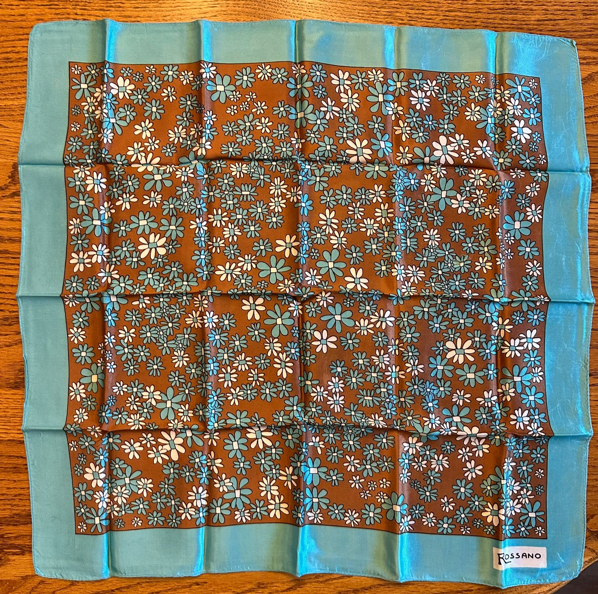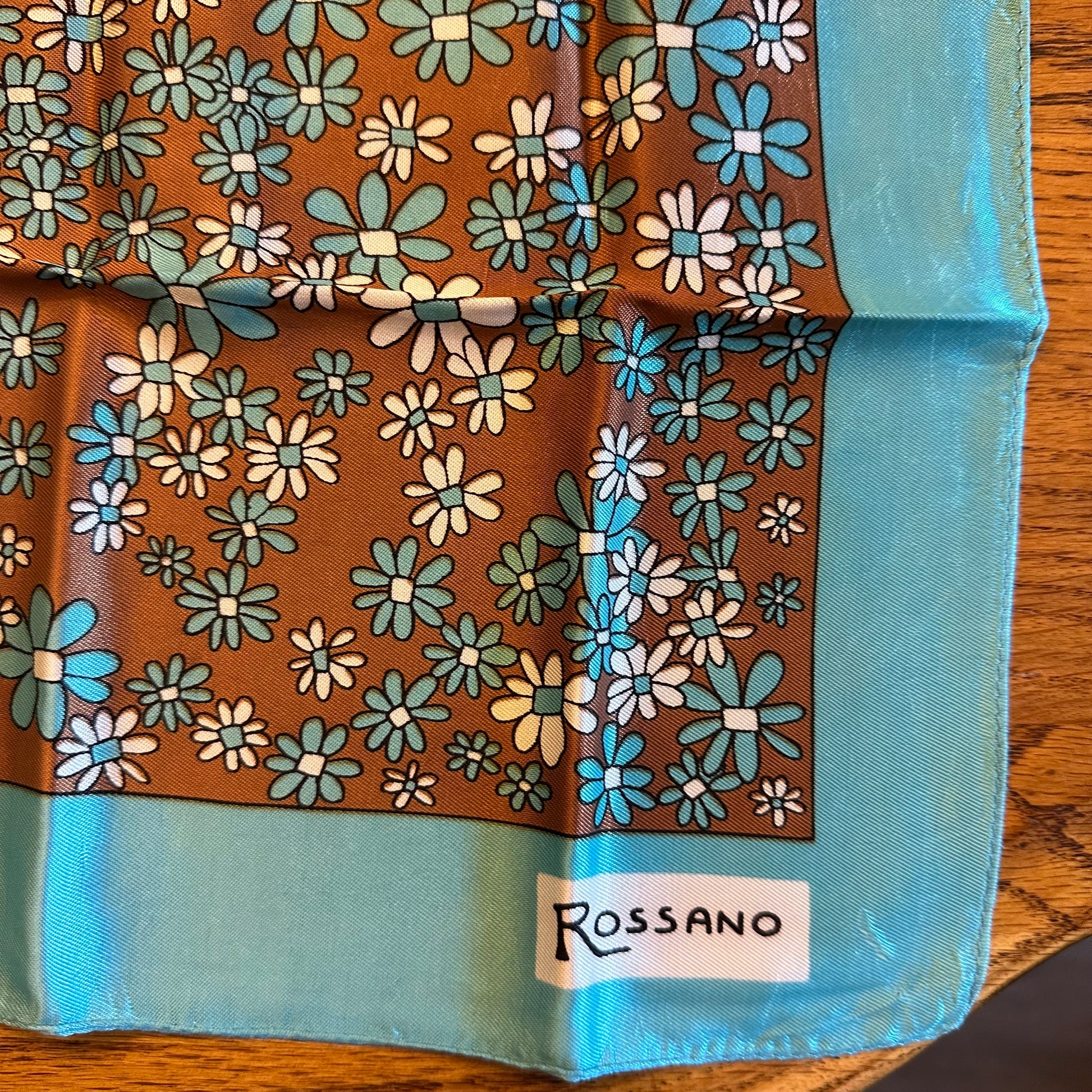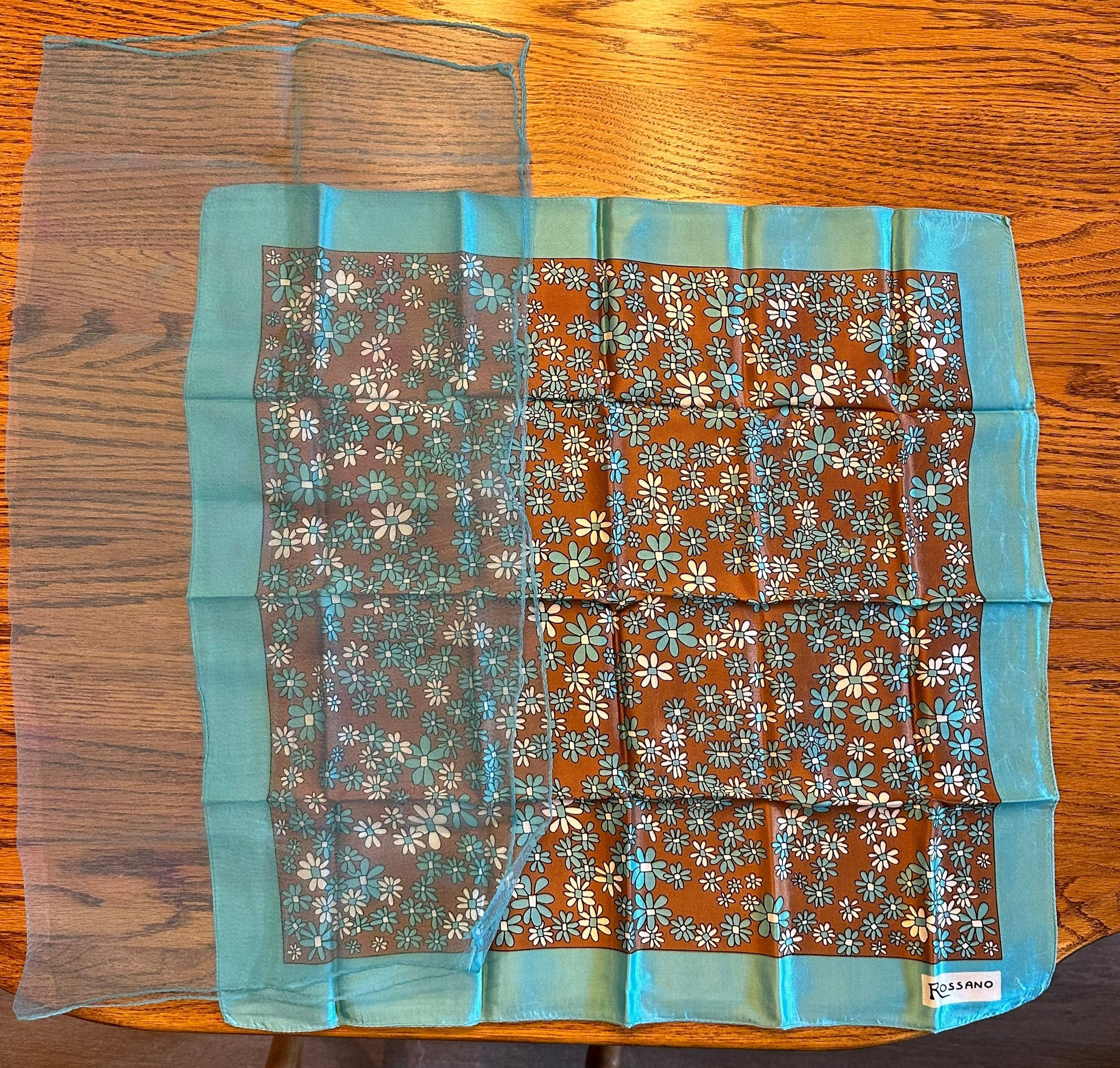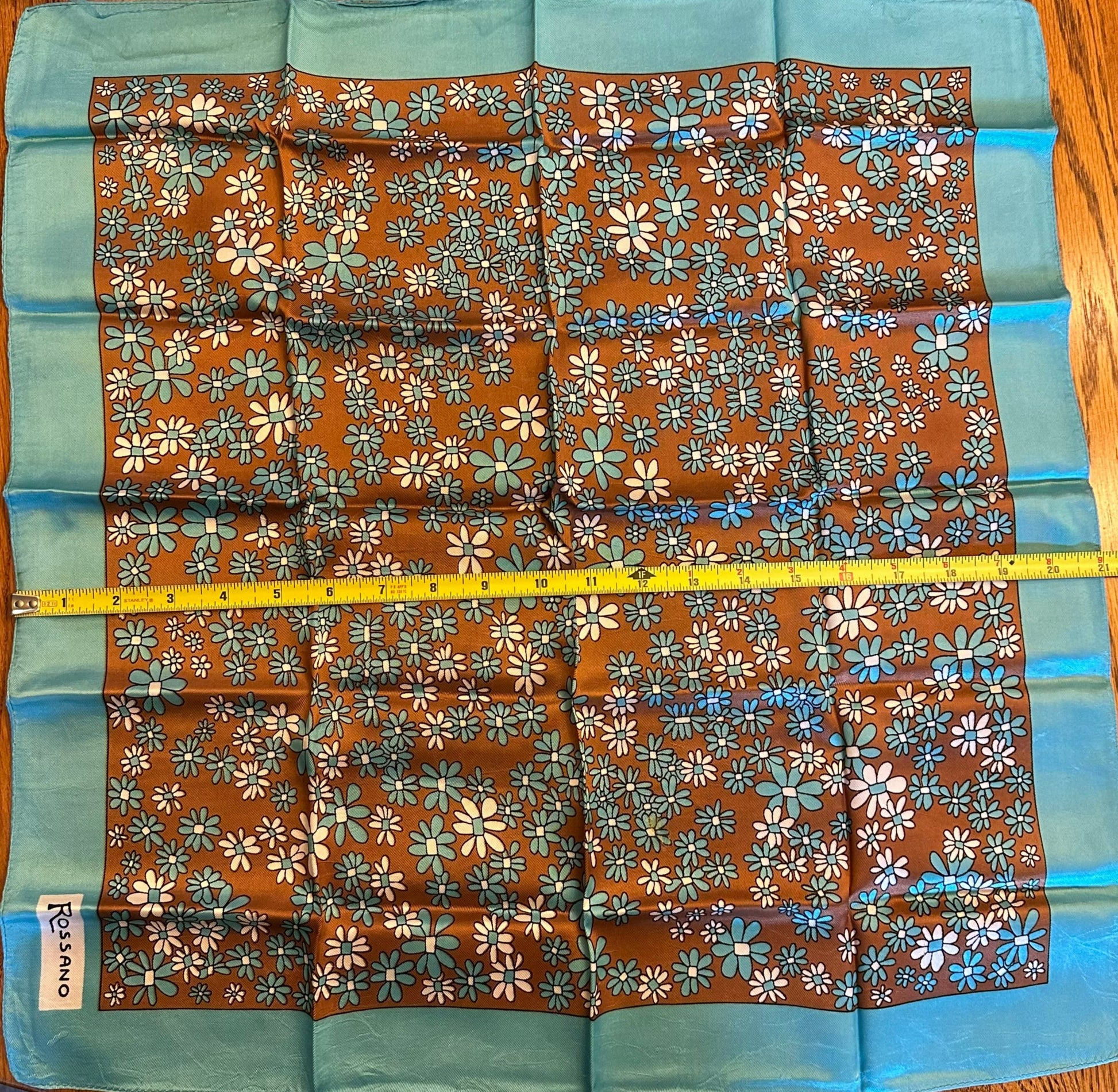 A wonderful set of vintage scarves in blues and browns. One features a lovely floral pattern from Rossano. The lot of 2 varies in textiles and size and is in excellent condition.