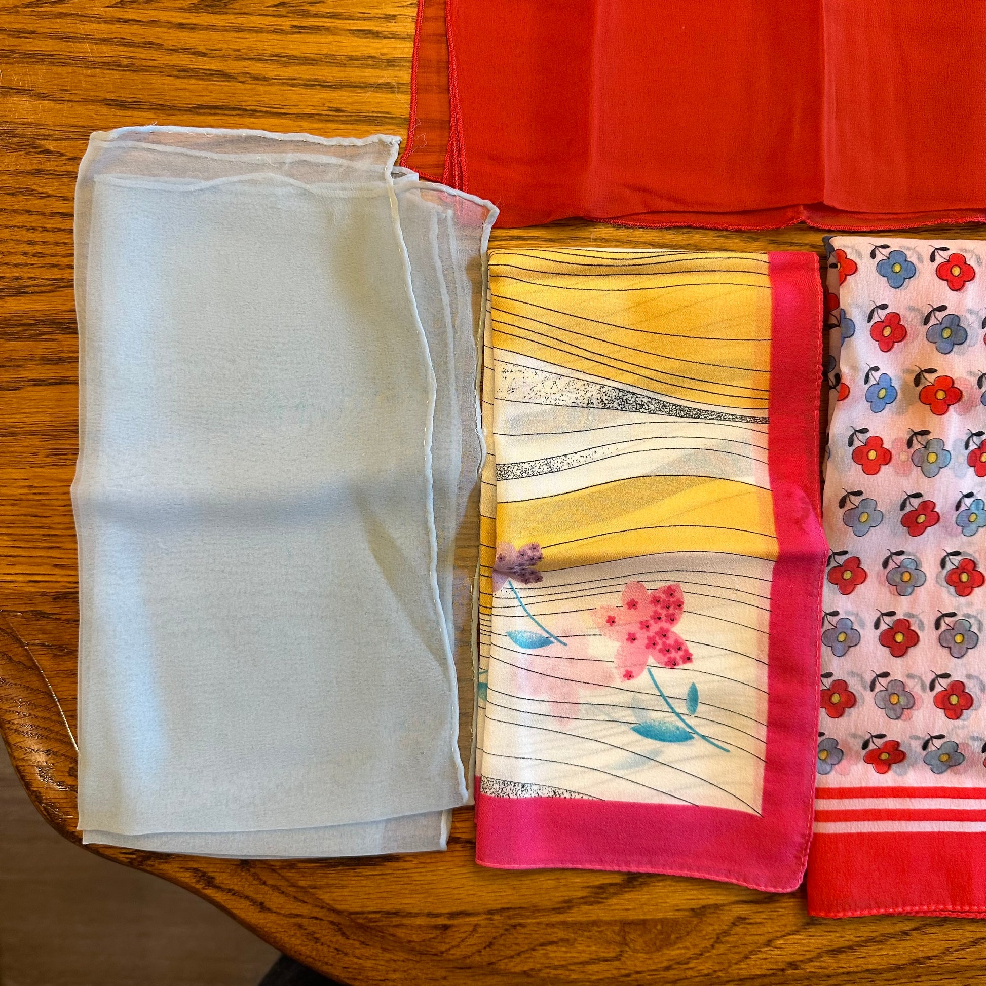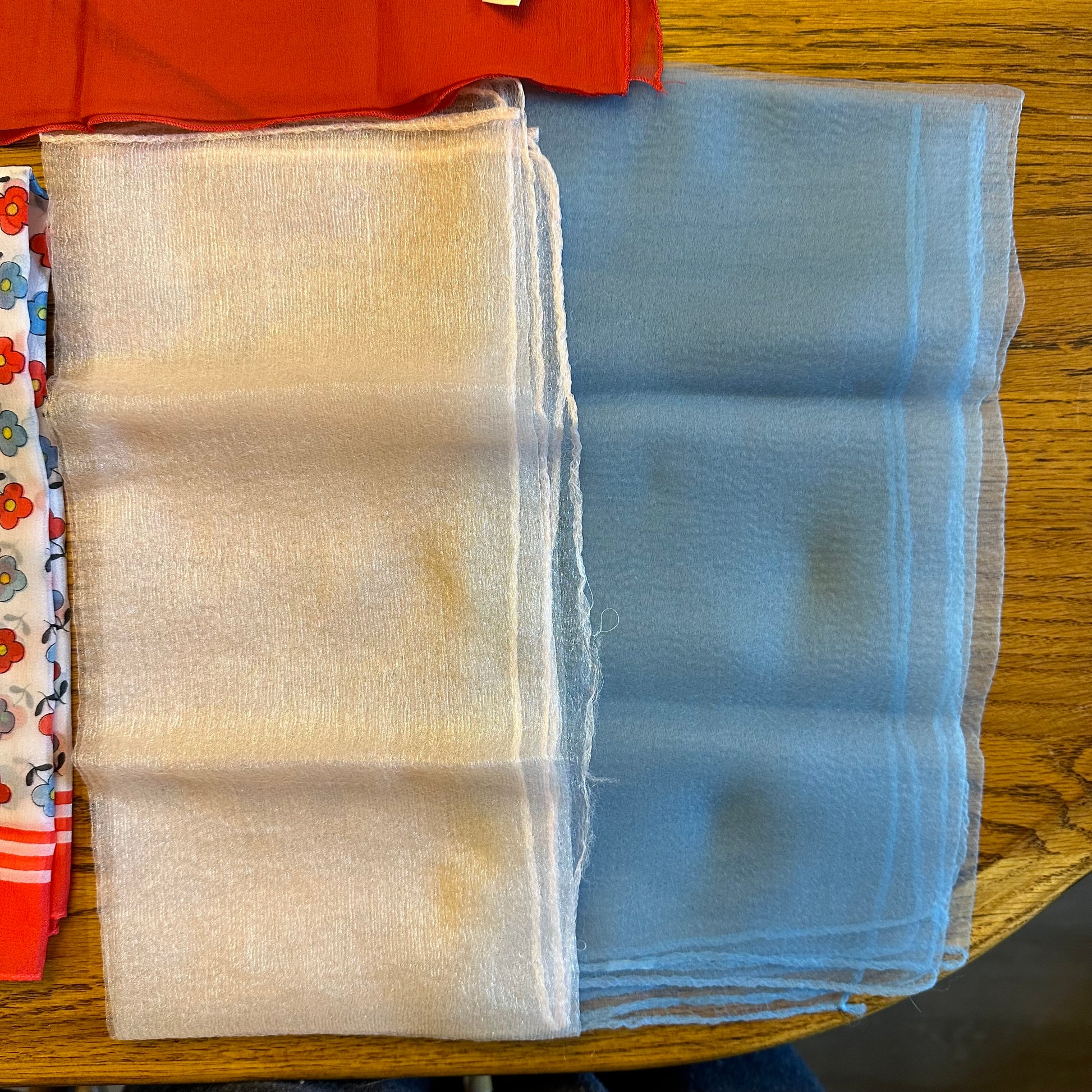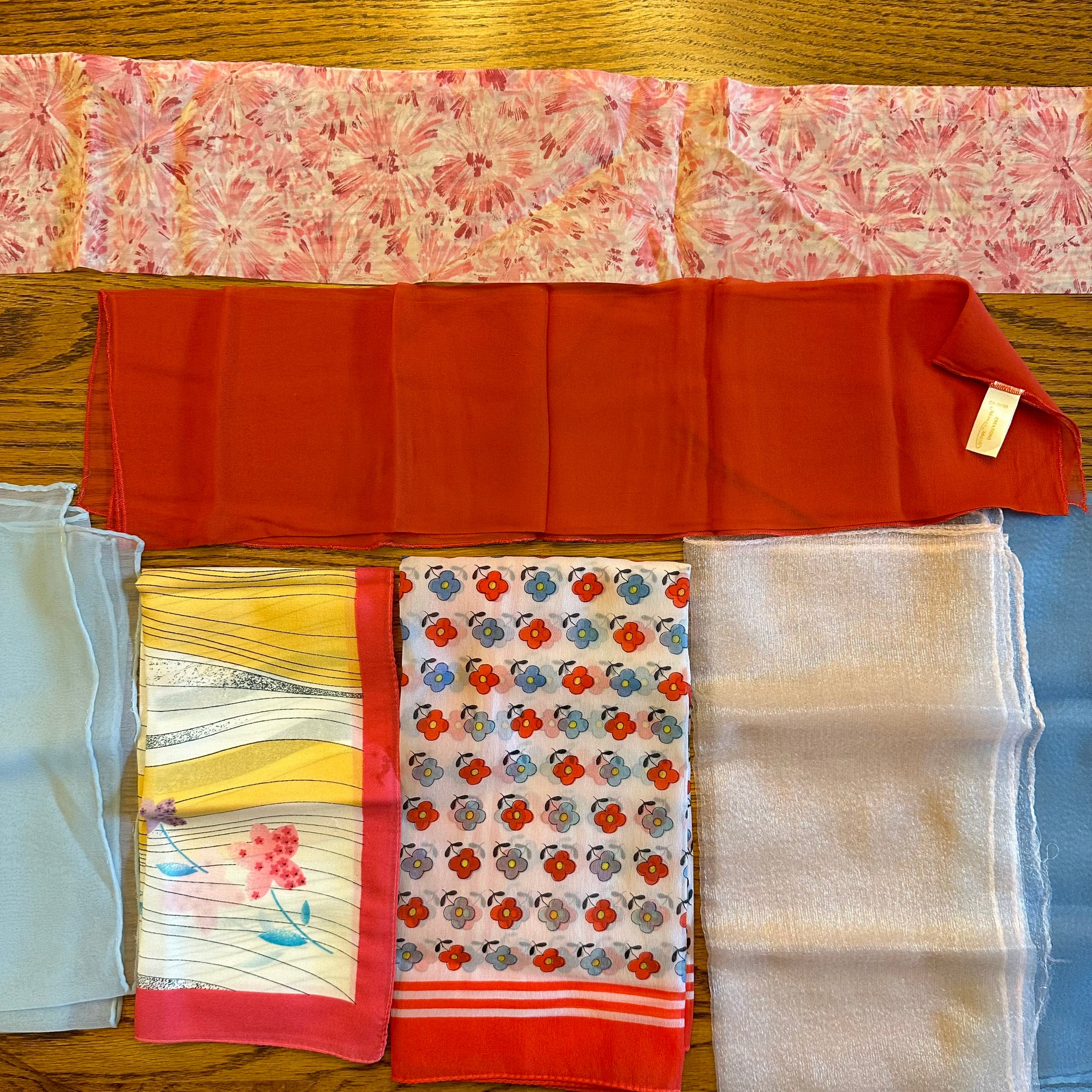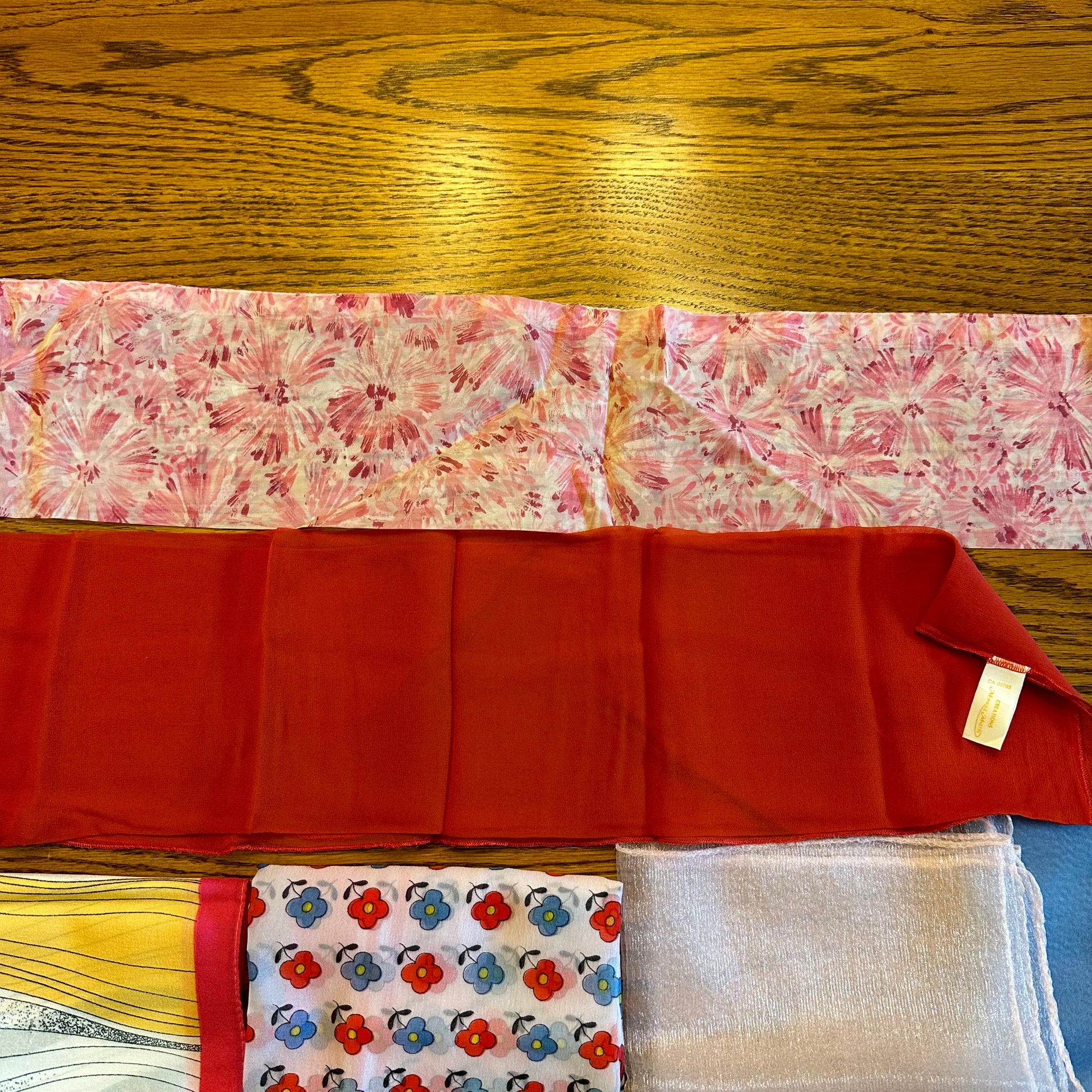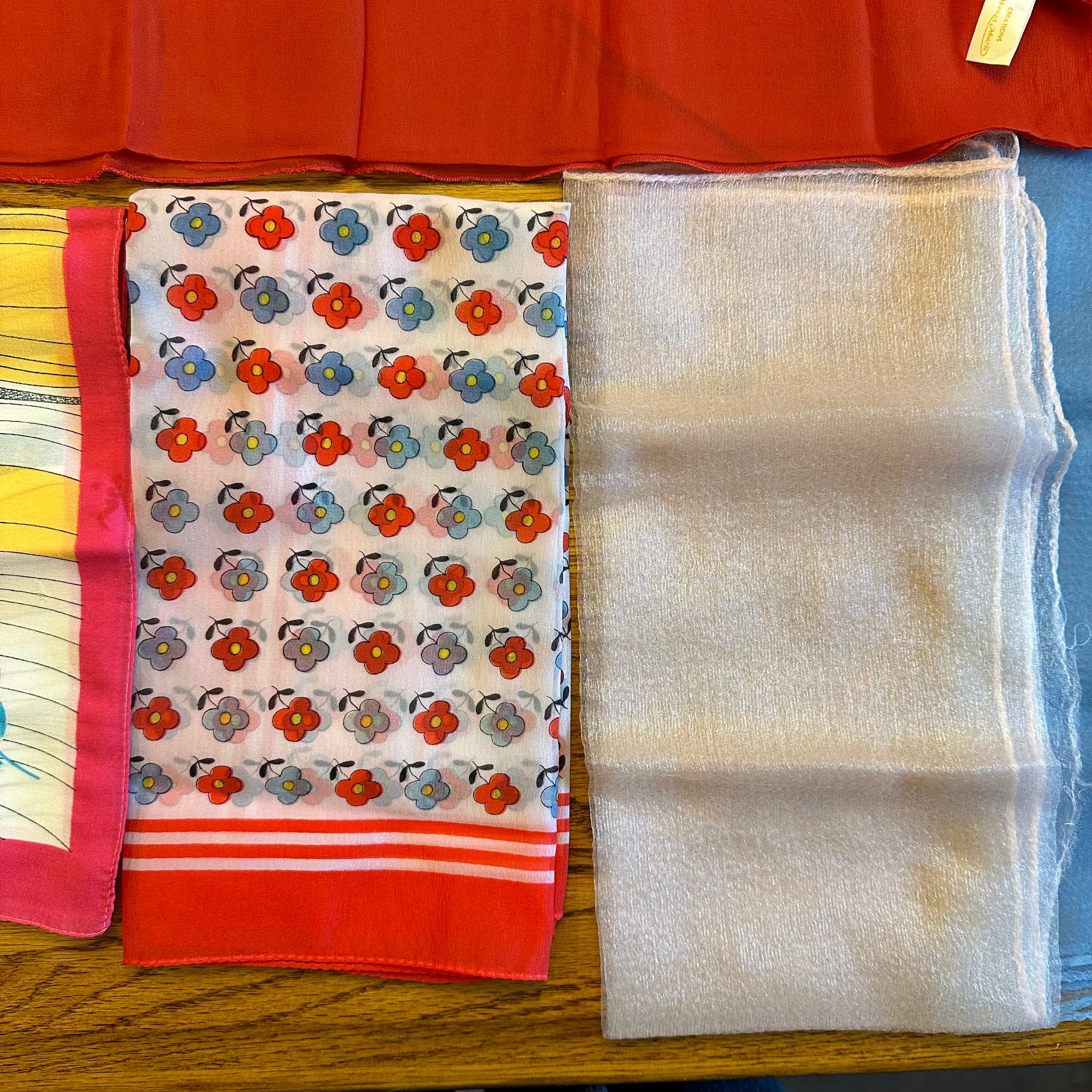 A wonderful set of vintage scarves in reds, blues and pink. The lot of 8 varies in textiles and size. The lot is in excellent condition.