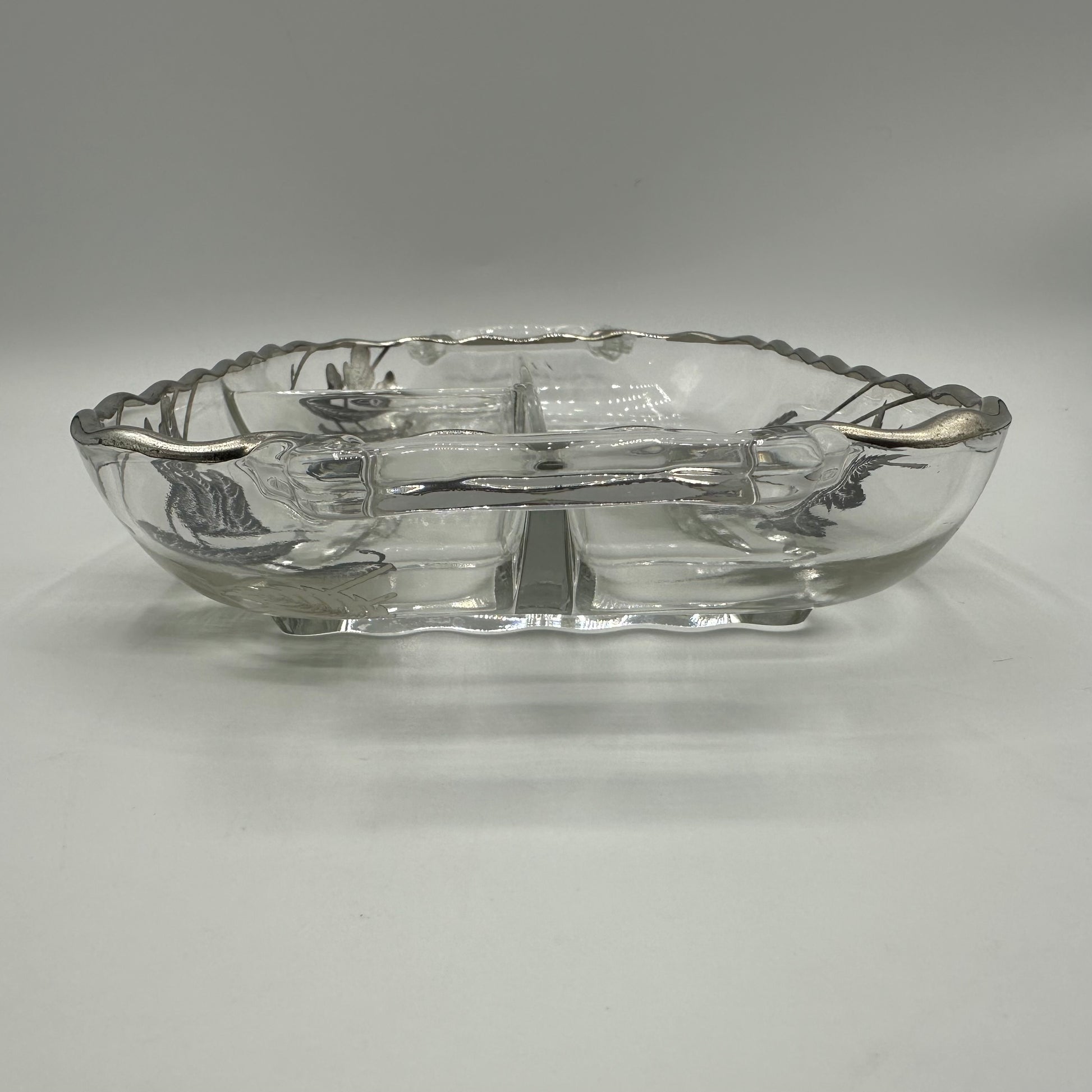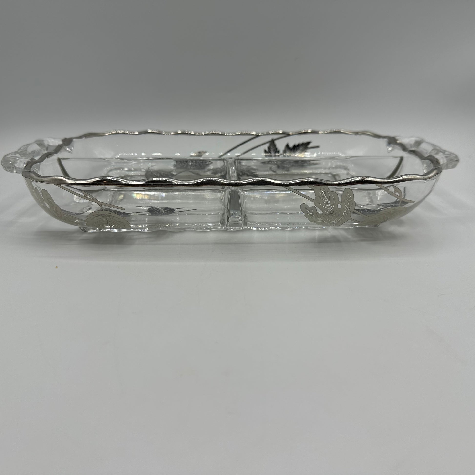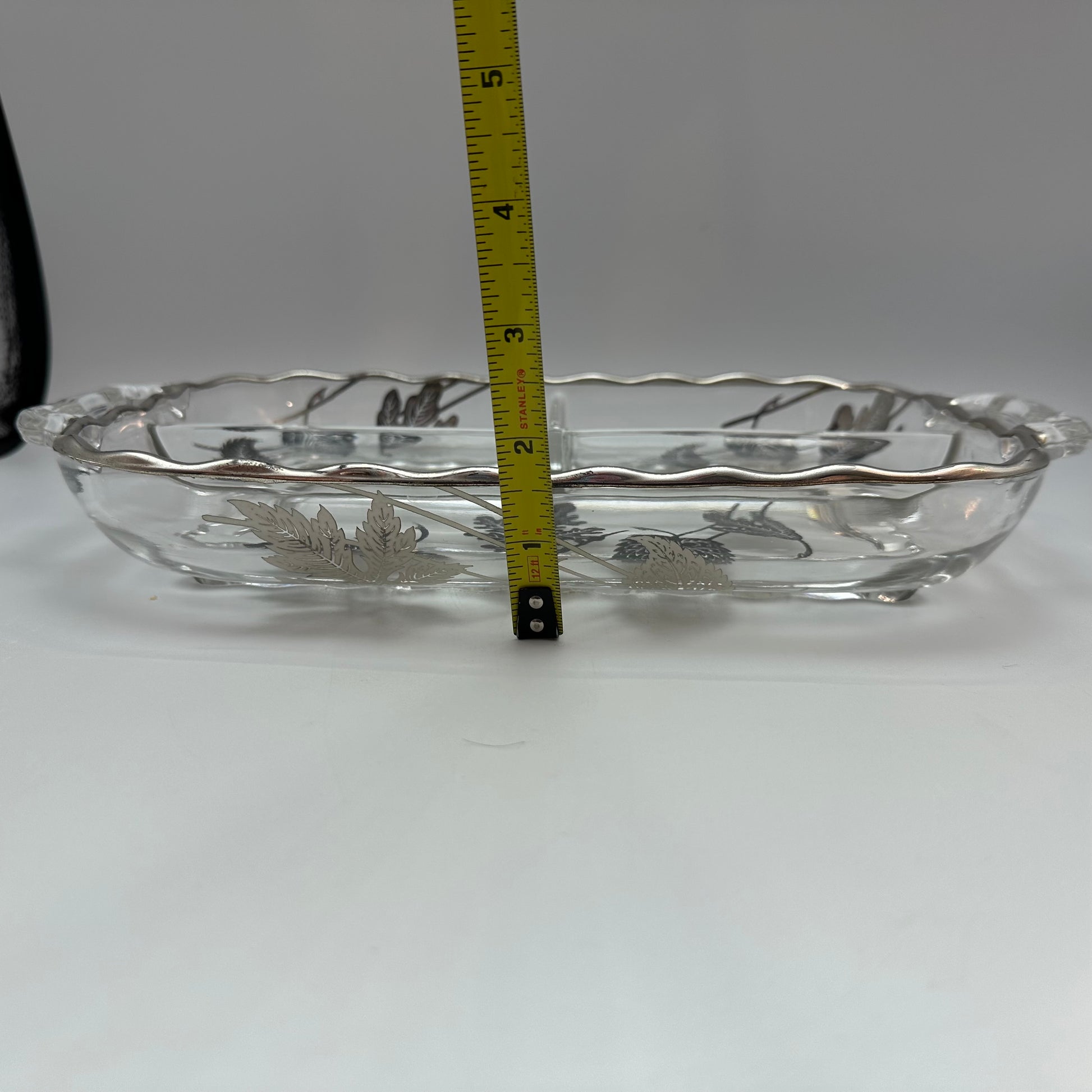 This divided dish, crafted by Silver City Glass Co., showcases elegant handles and a beautiful silver overlay leaf design. It is in excellent vintage condition, having been gently pre-owned. This dish is not only functional but also serves as a charming decorative piece.