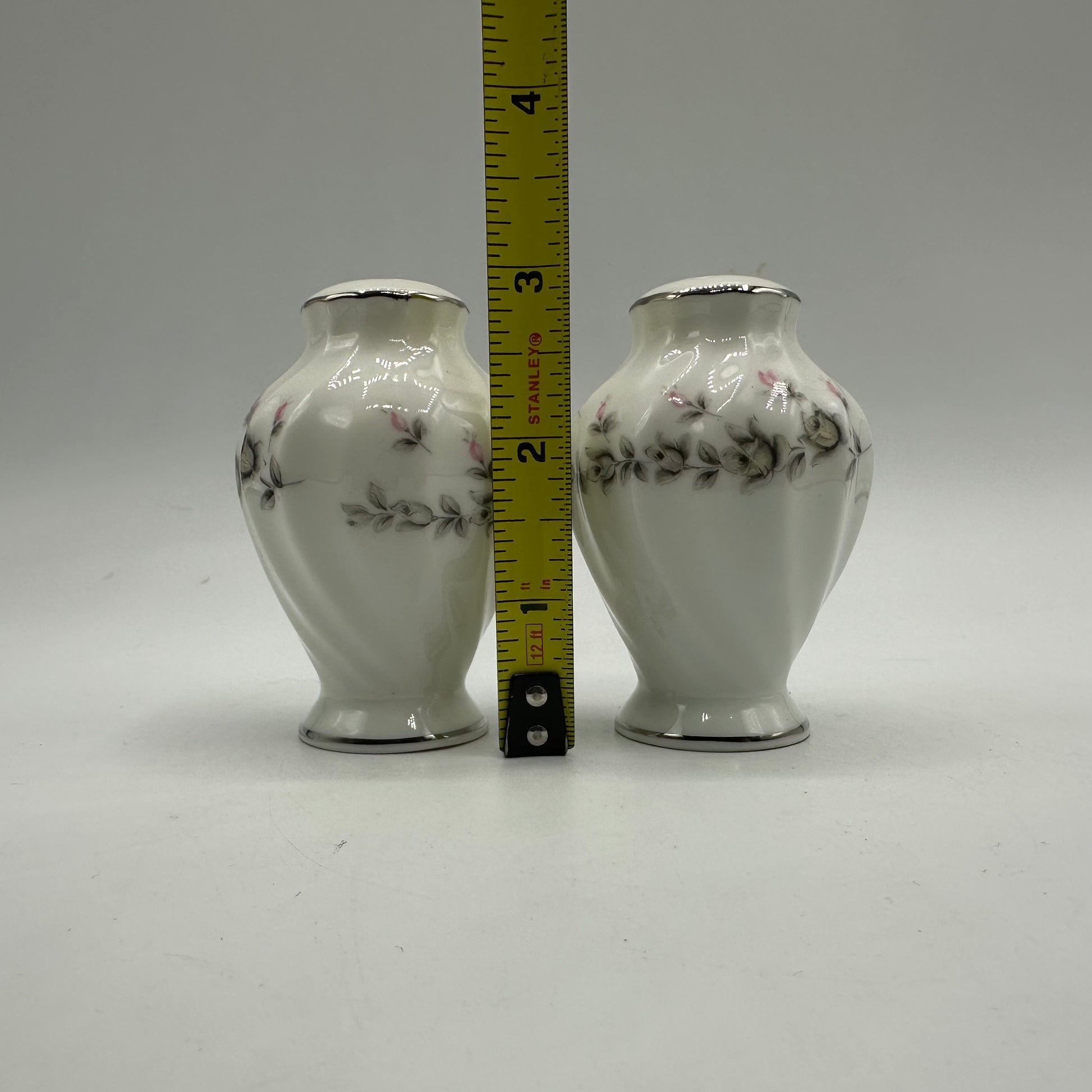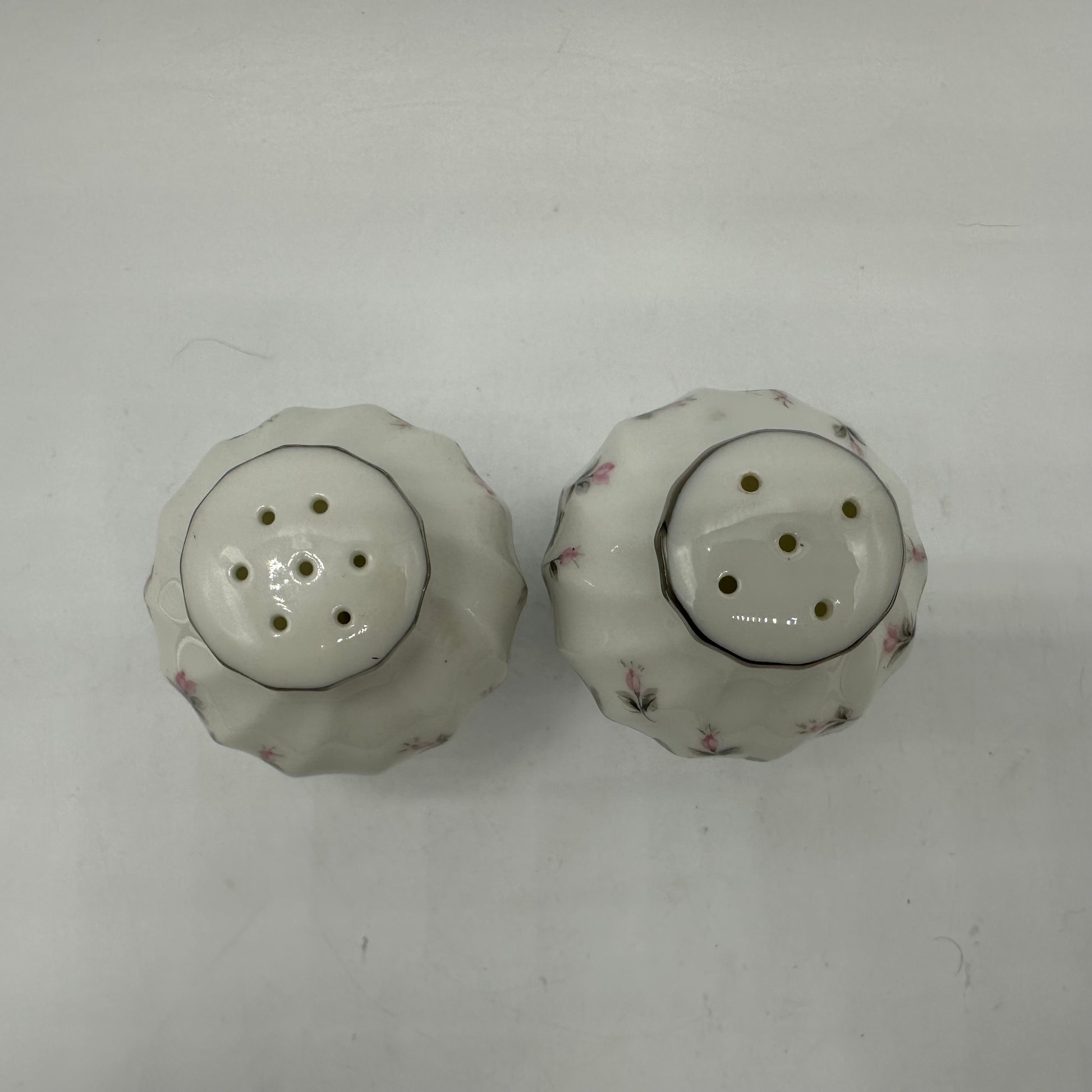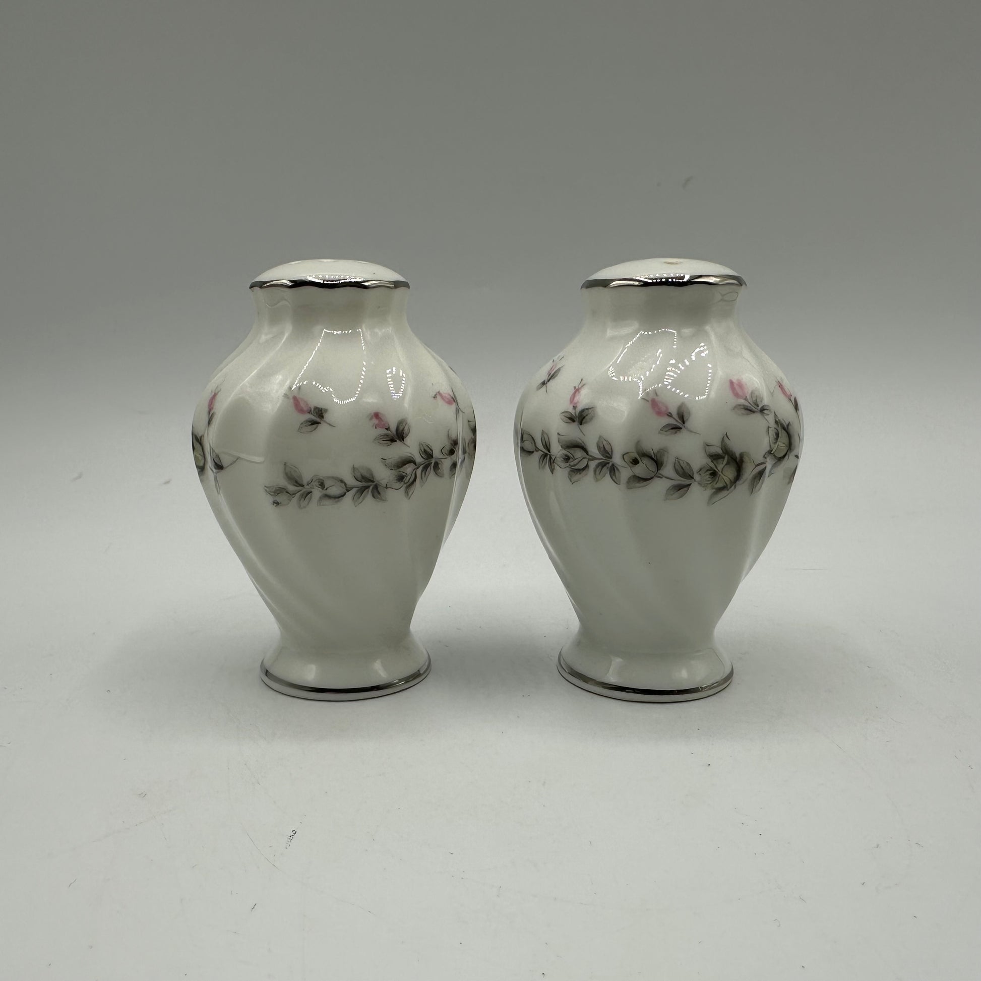 This salt-and-pepper set from Style House is an elegant addition to any table setting. It showcases the Picardy pattern, characterized by delicate pink-and-black rose designs complemented by fine platinum trim. This set is perfect for adding a touch of sophistication to your dining experience.